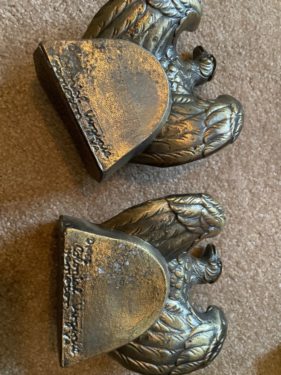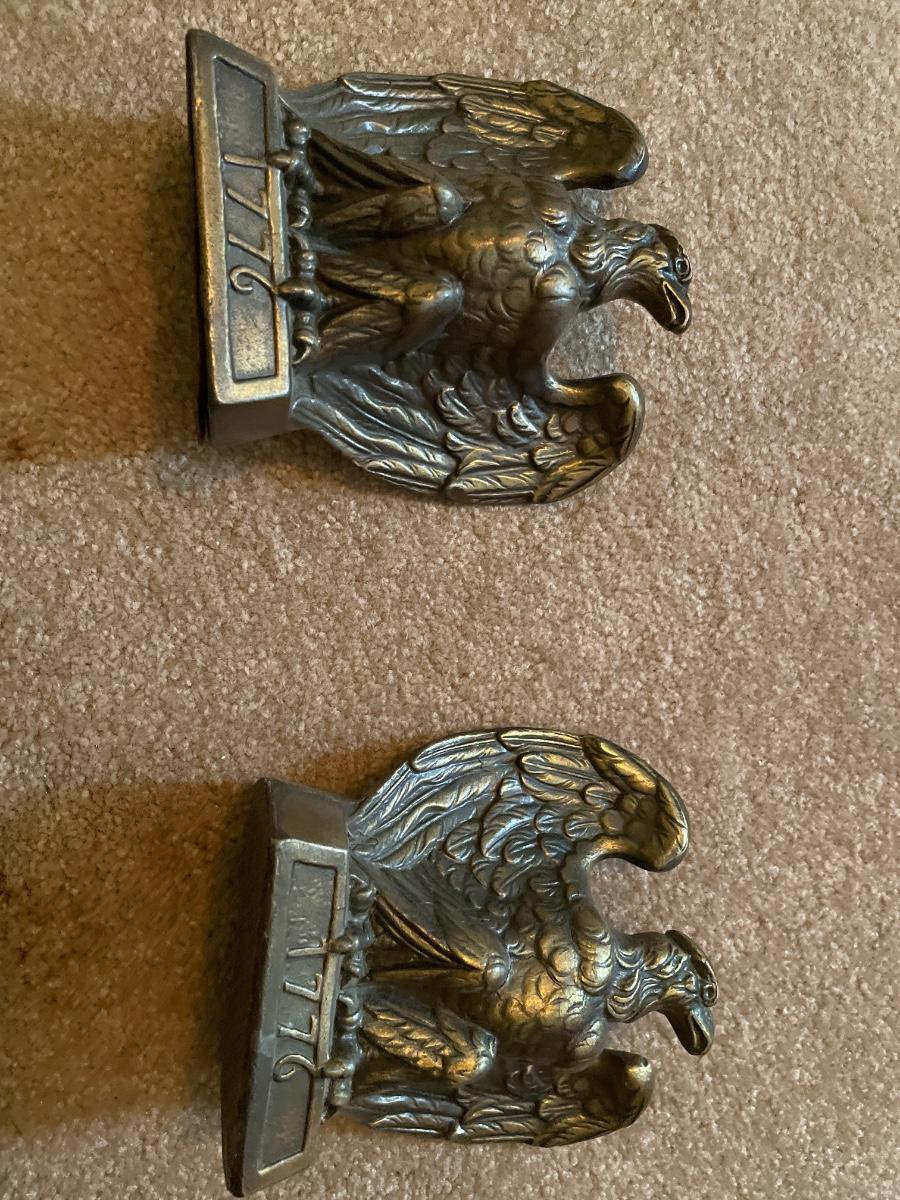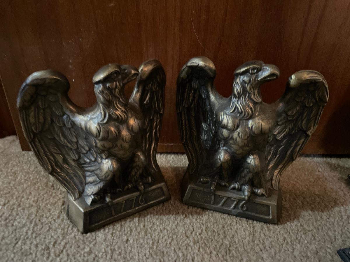 Tall glass bottle, Eagle bookends clock and more