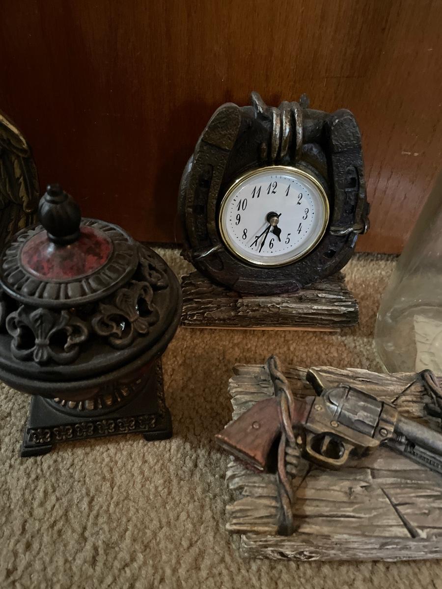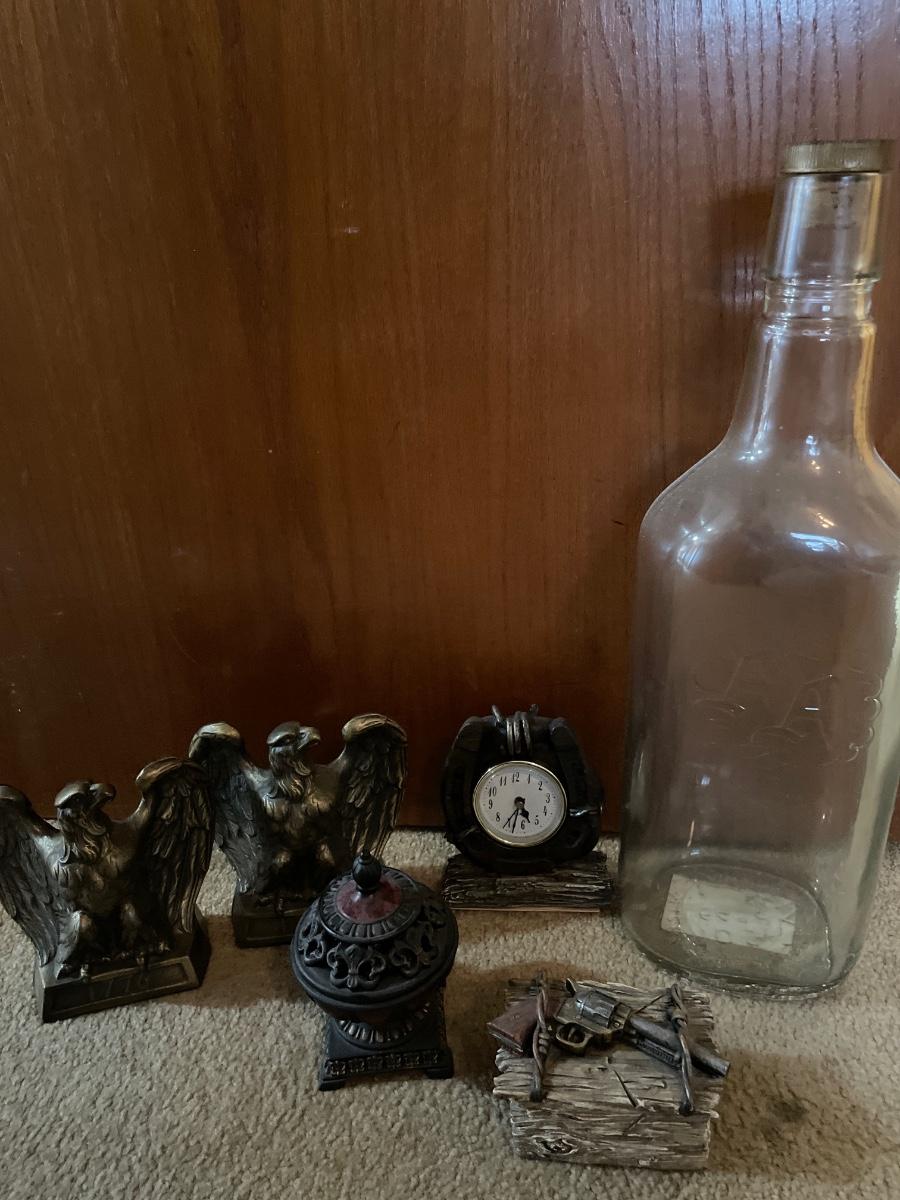 Tall bottle and metal eagle bookends with gun trinket box, clock and holder