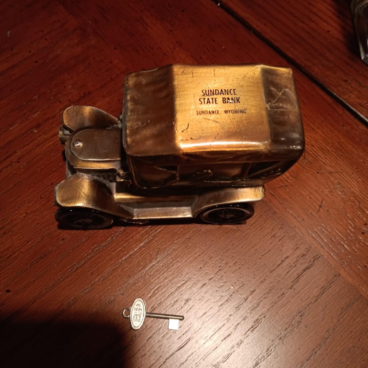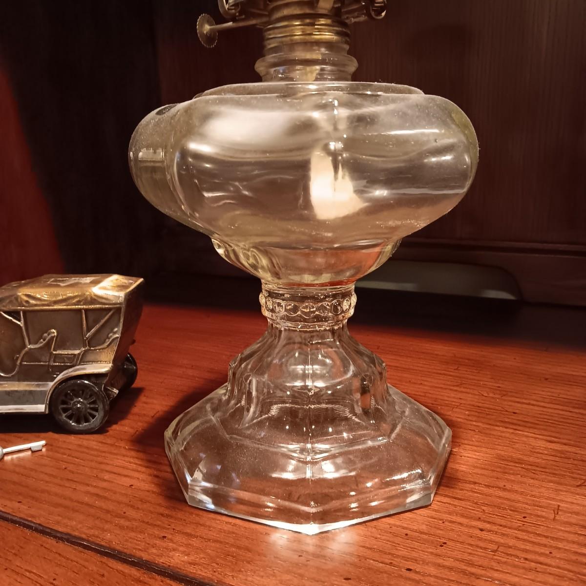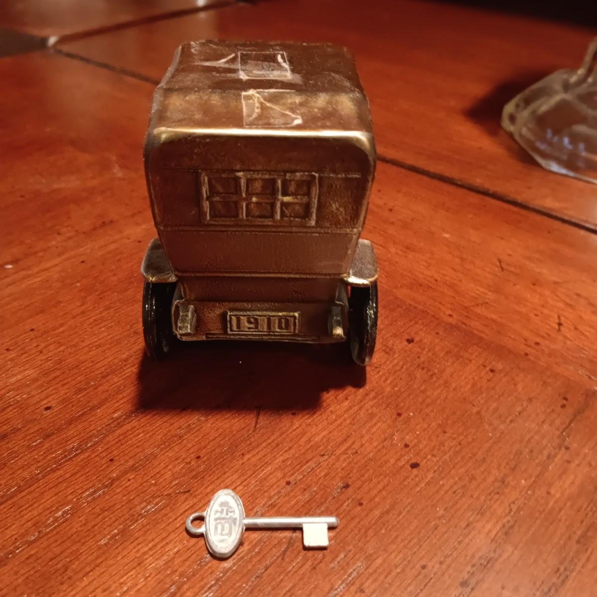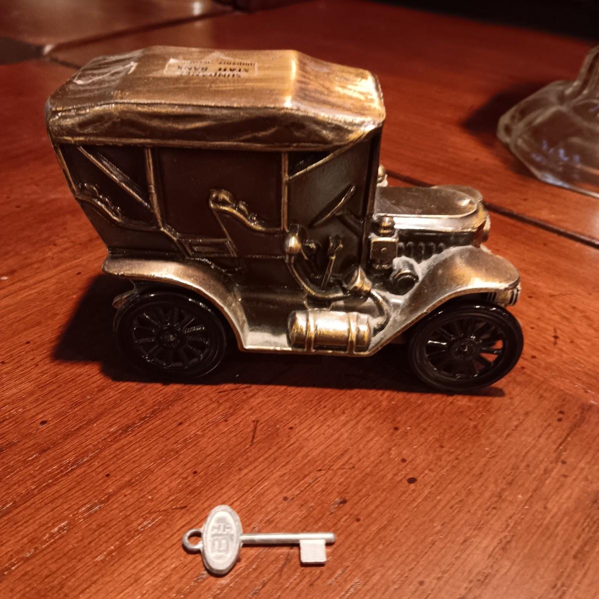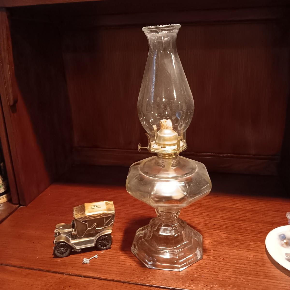 TALL GLASS OIL LAMP AND A METAL CAR BANK WITH THE KEY