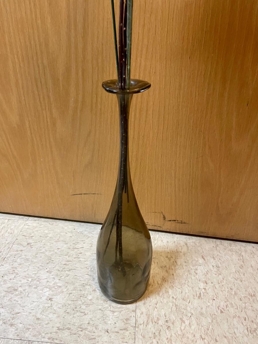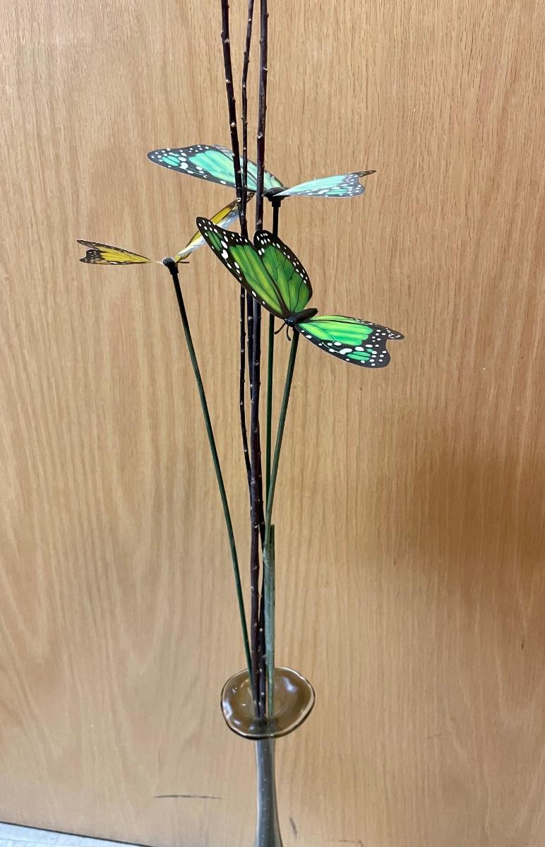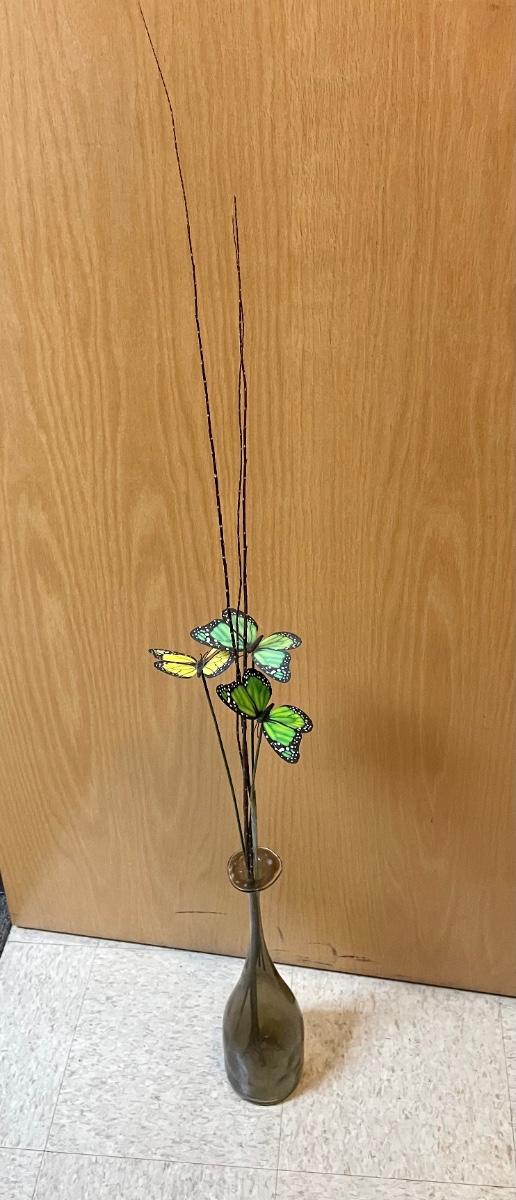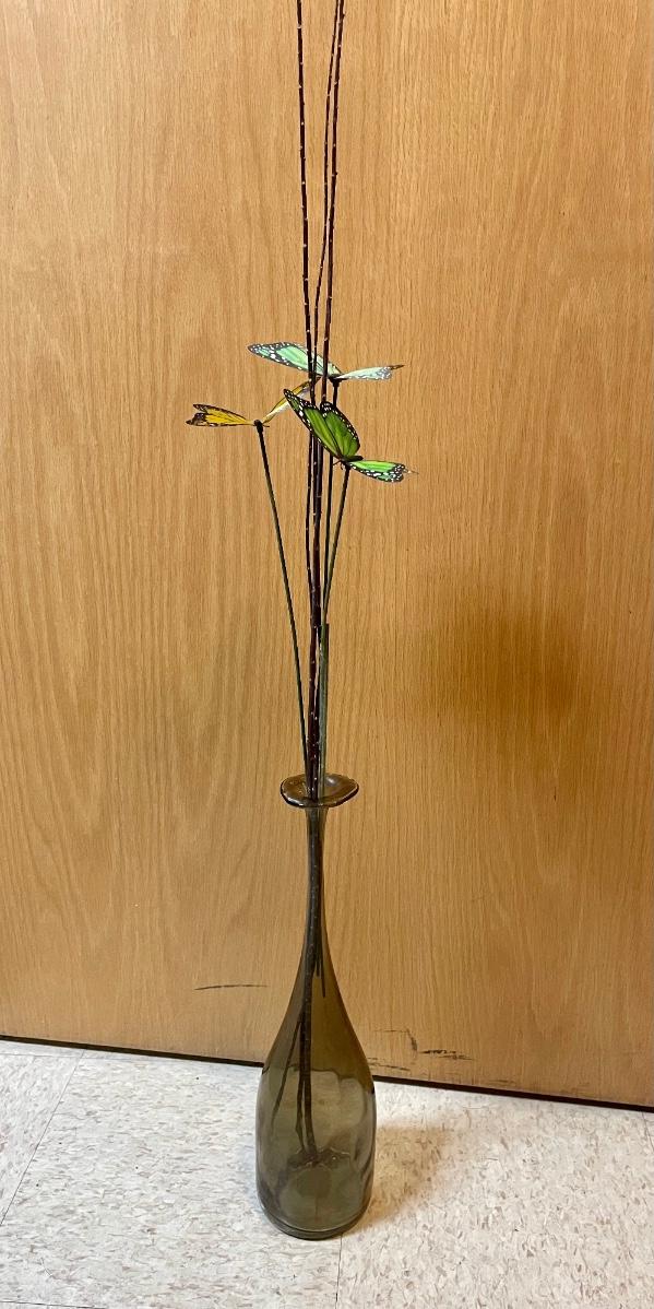 Amber-colored glass vase with 3 butterflies on sticks.