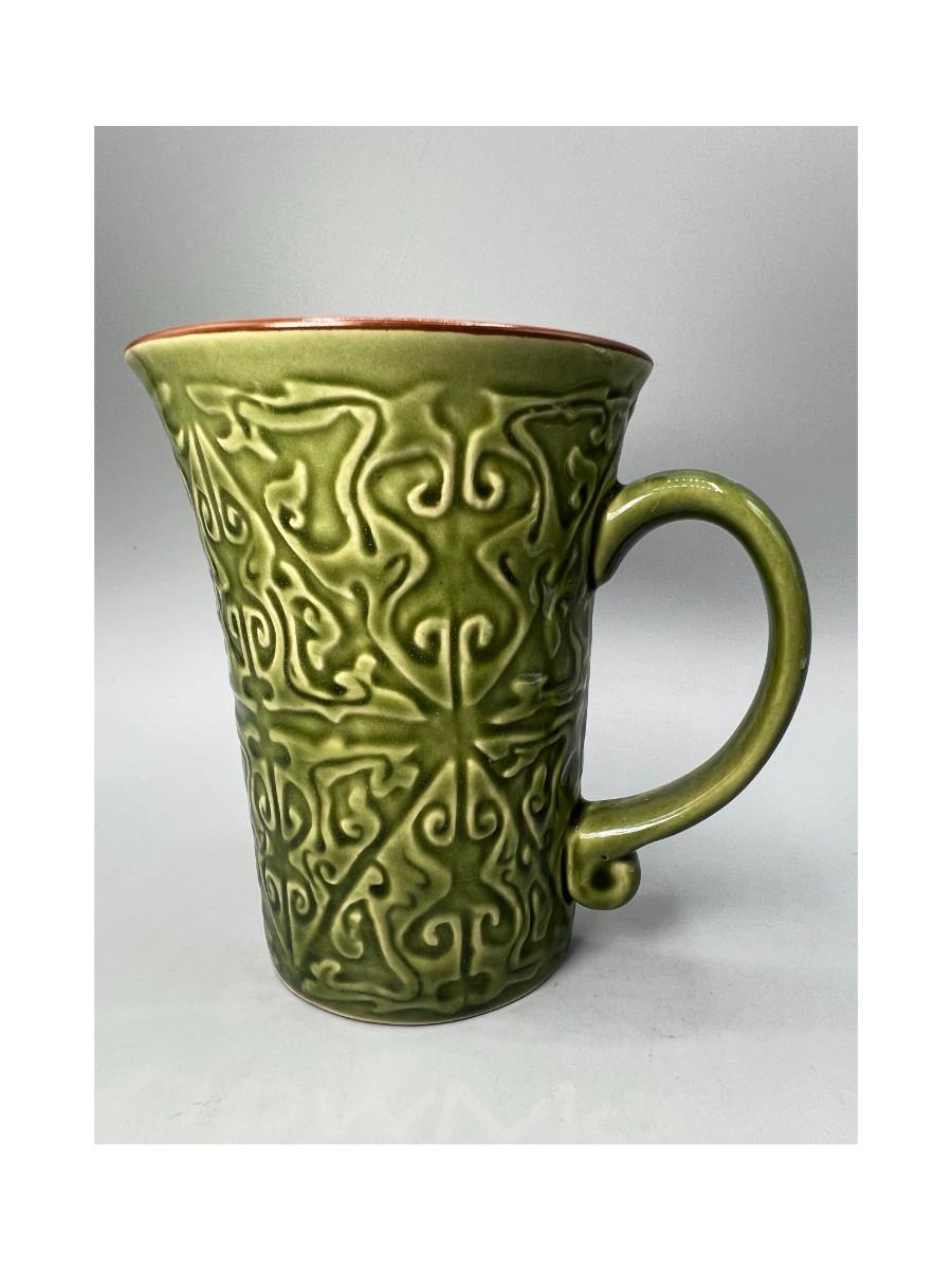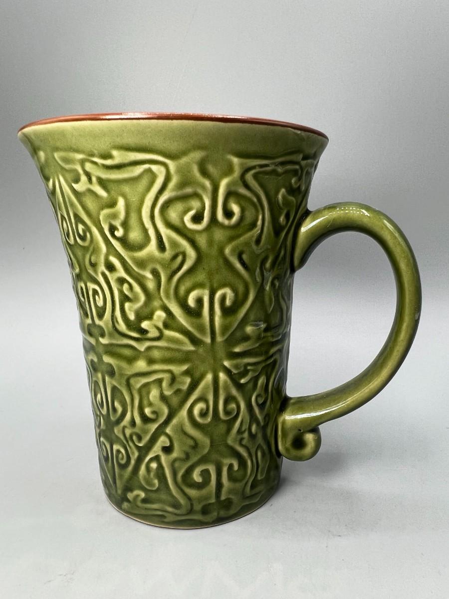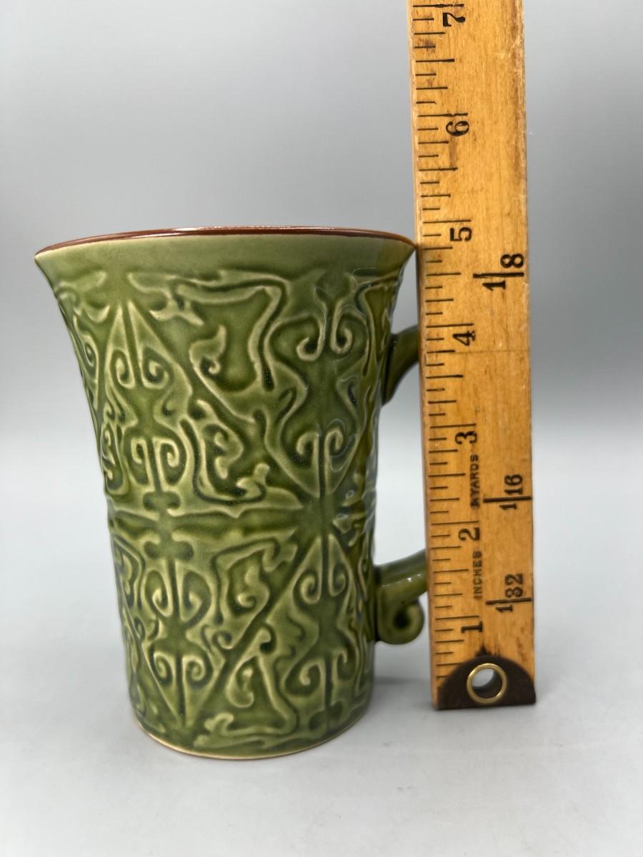 Tall Green Abstract Design Coffee Cup Mug Gibson. Neat pattern. Blue inside of cup. There does seem to be crazing on the outside. 5" size.