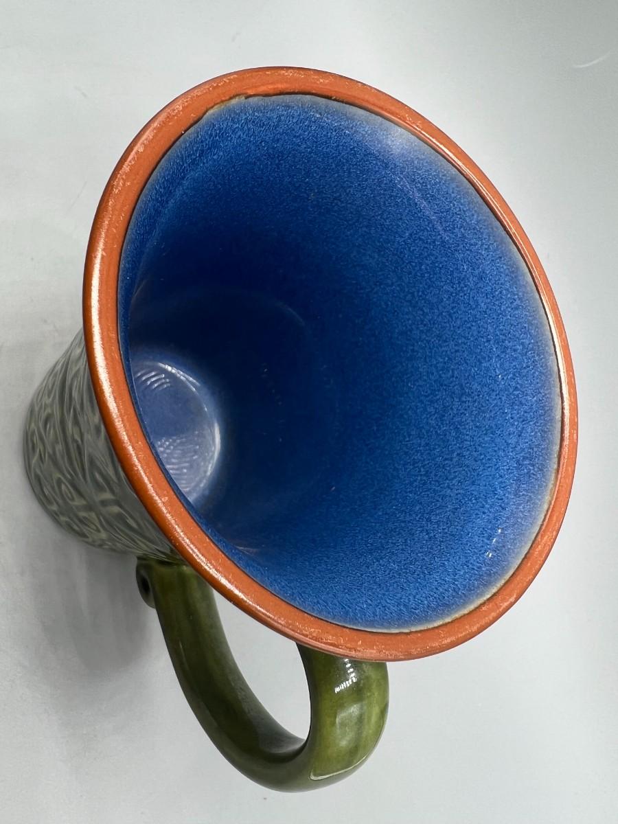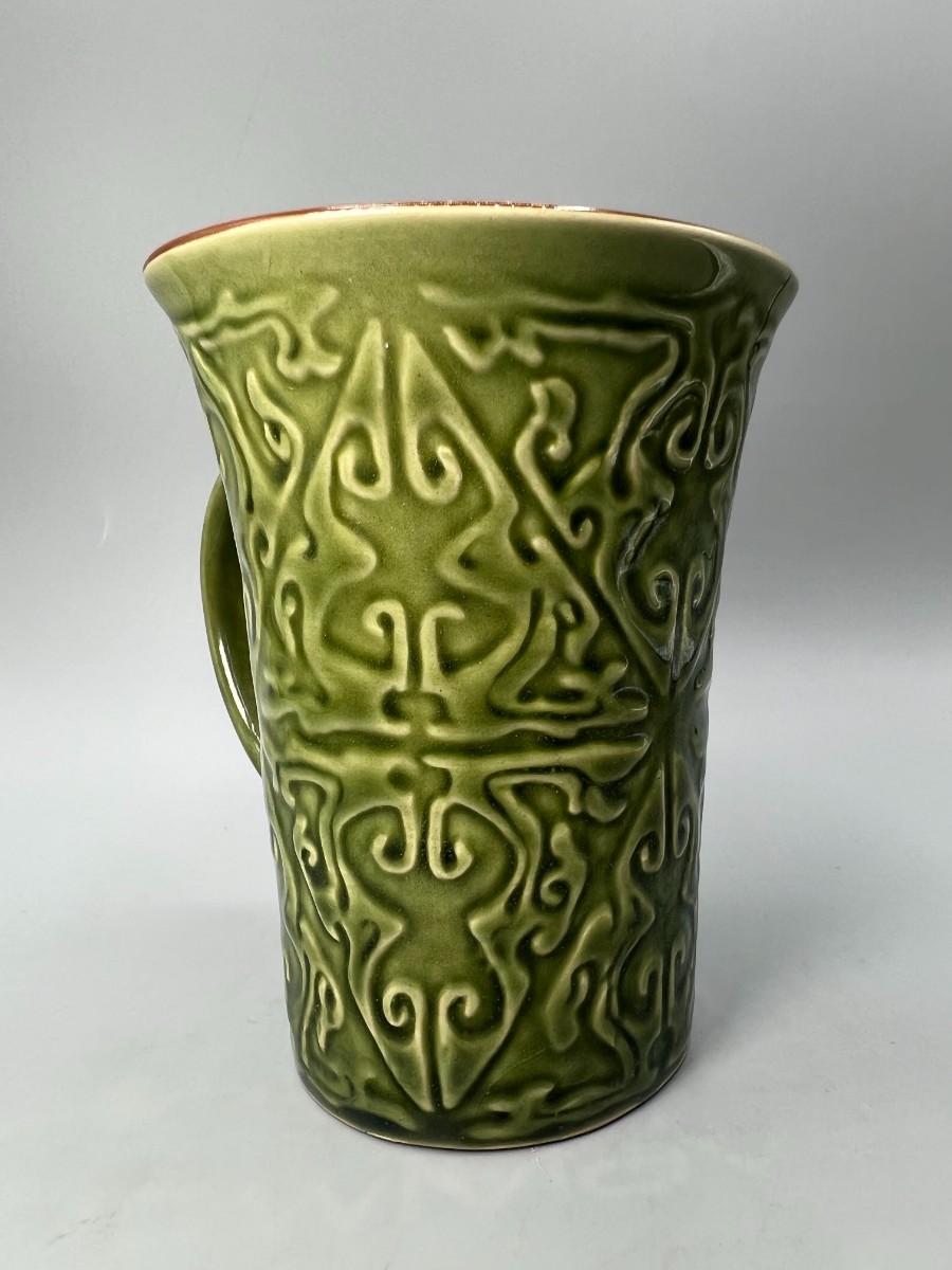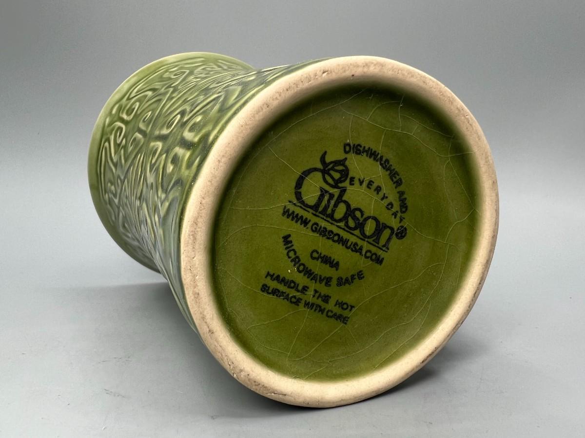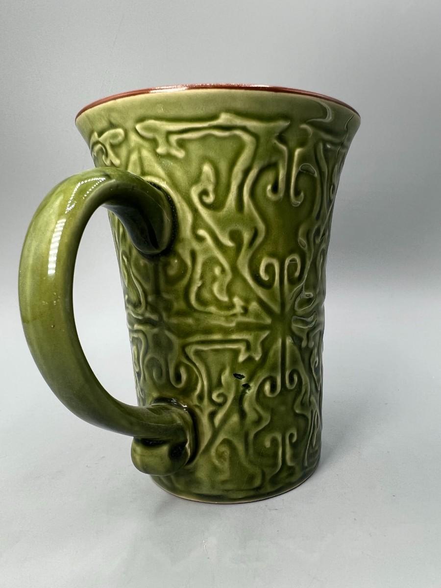 Tall Green Abstract Design Coffee Cup Mug Gibson. Neat pattern. Blue inside of cup. There does seem to be crazing on the outside. 5" size.