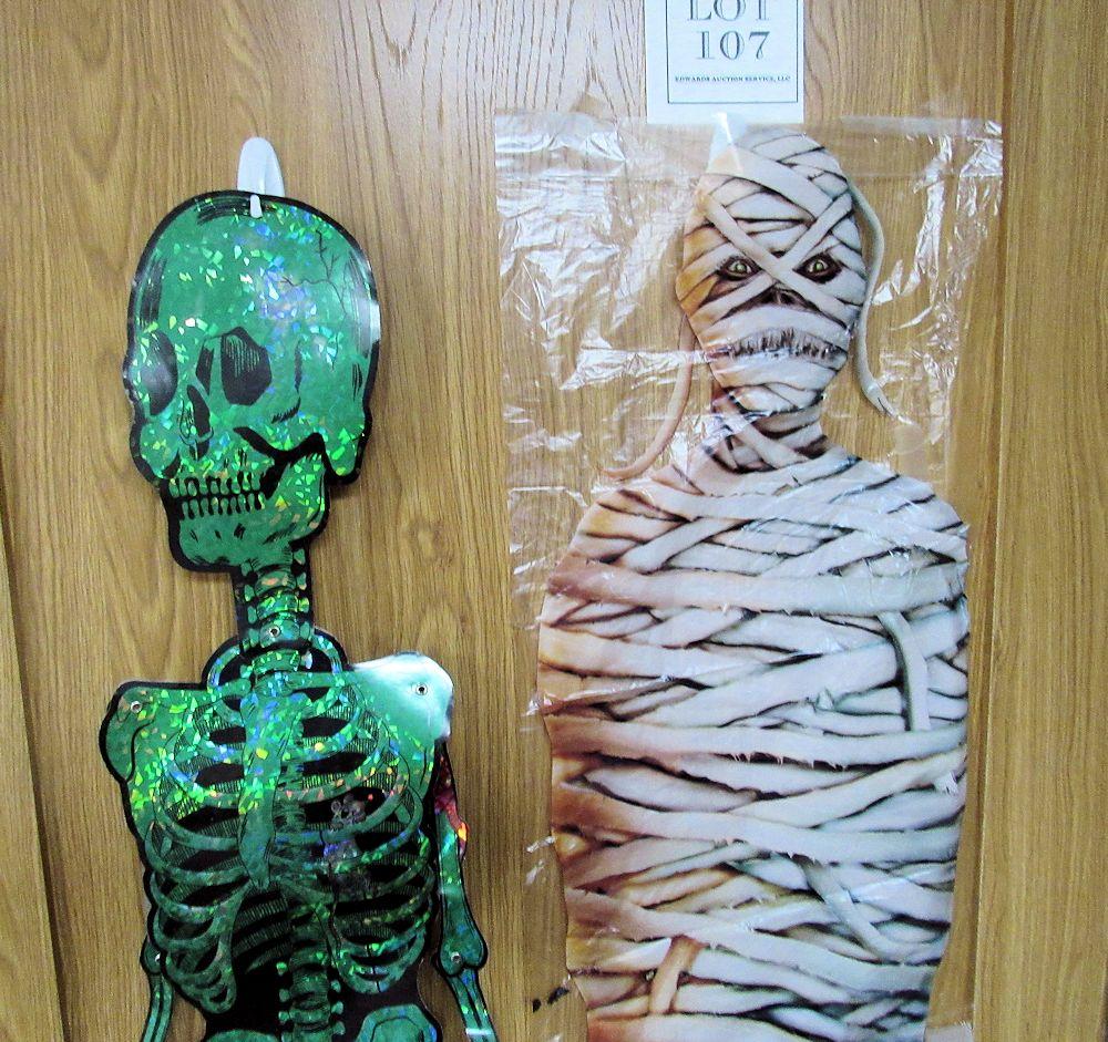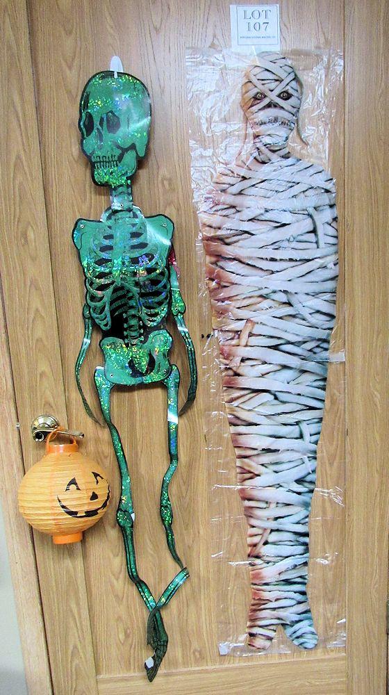 Tissue lantern has a few small tears. No light or candle. Skeleton has a lot of wrinkles. The door hanger mummy seems to be ok.