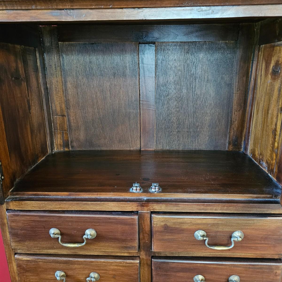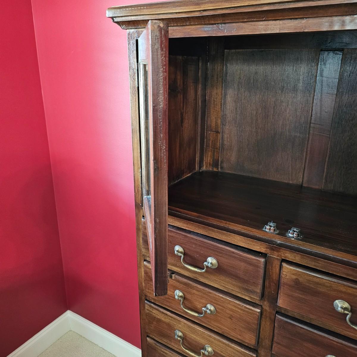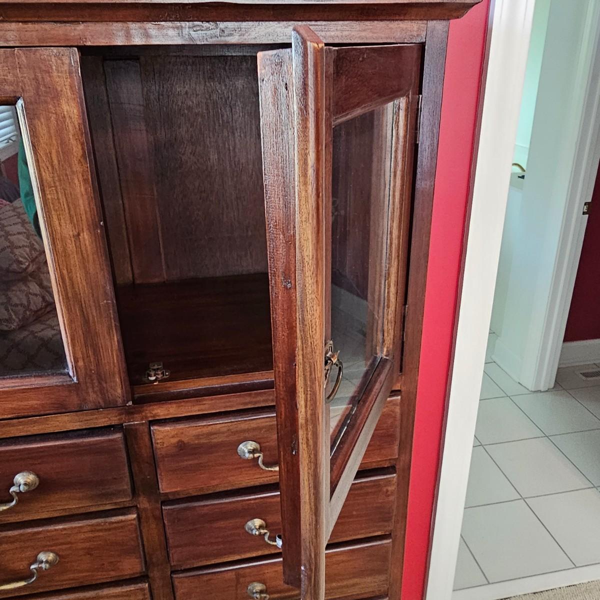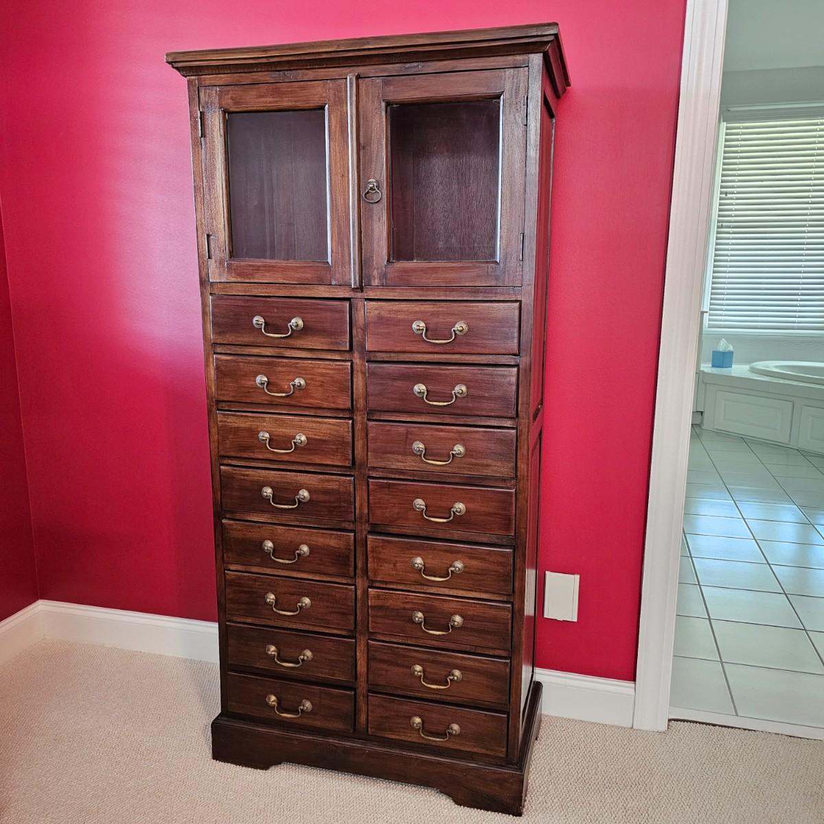 Sixteen drawers and a closed storage space at top. Two glass doors swing open for bulkier Storage. Sixteen drawers are all lined. Top of item has slight warp on back edge. Measures 16" x 31.5" x 64.5"H. See photos for details. Local pickup only. Winning bidder must bring assistance to help move and load this item due to its weight and/or size. Item is on first floor.