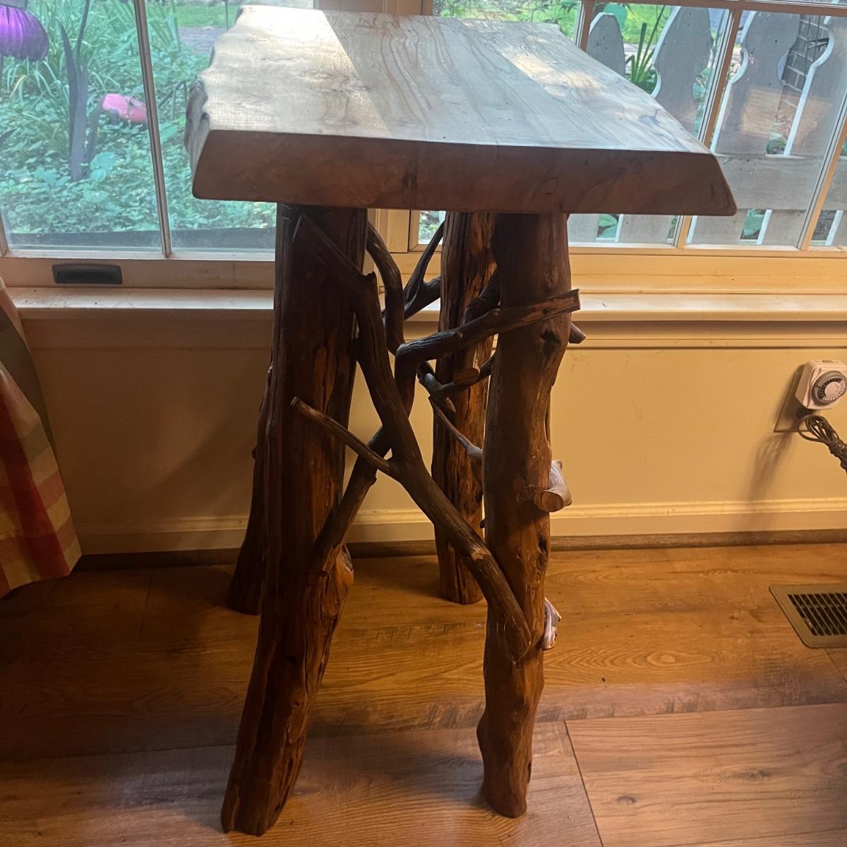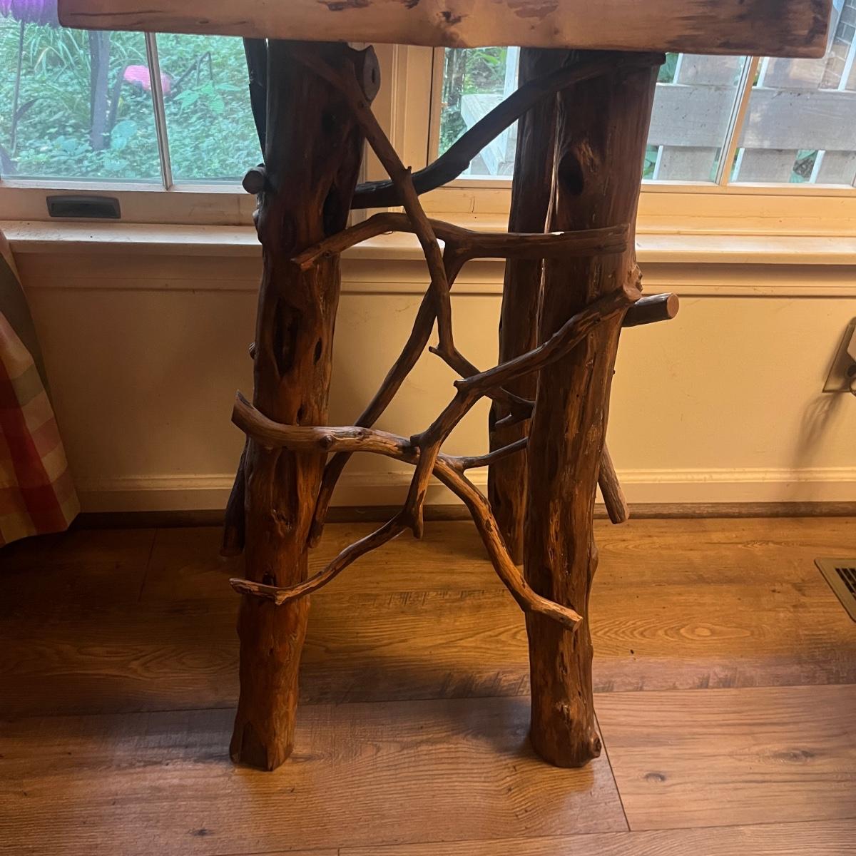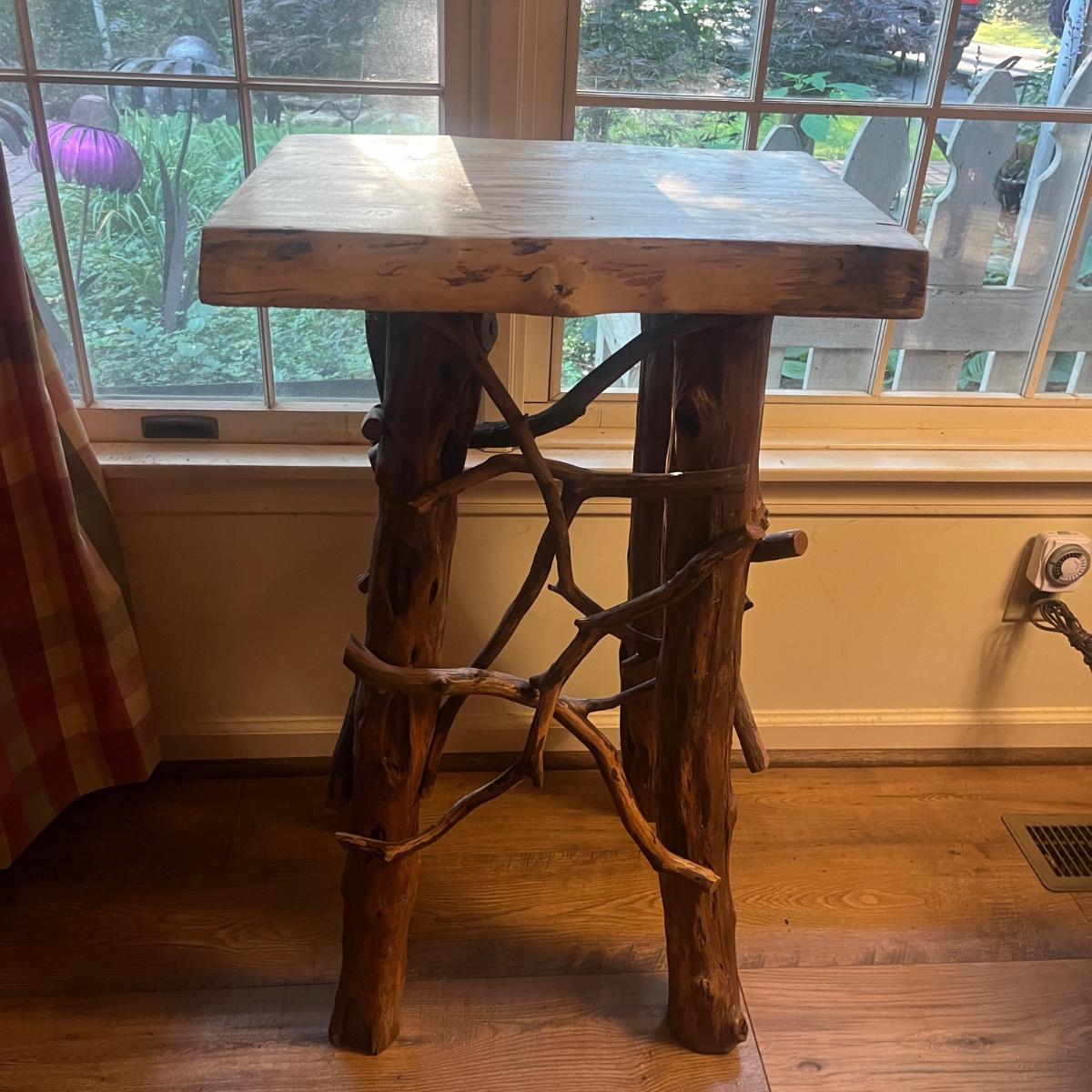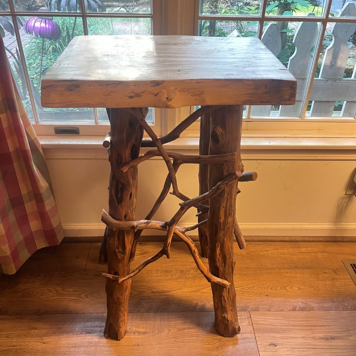 This live edge tall side table with branches and twig for a base. Table measures 19.5” x 16” x 34”H.