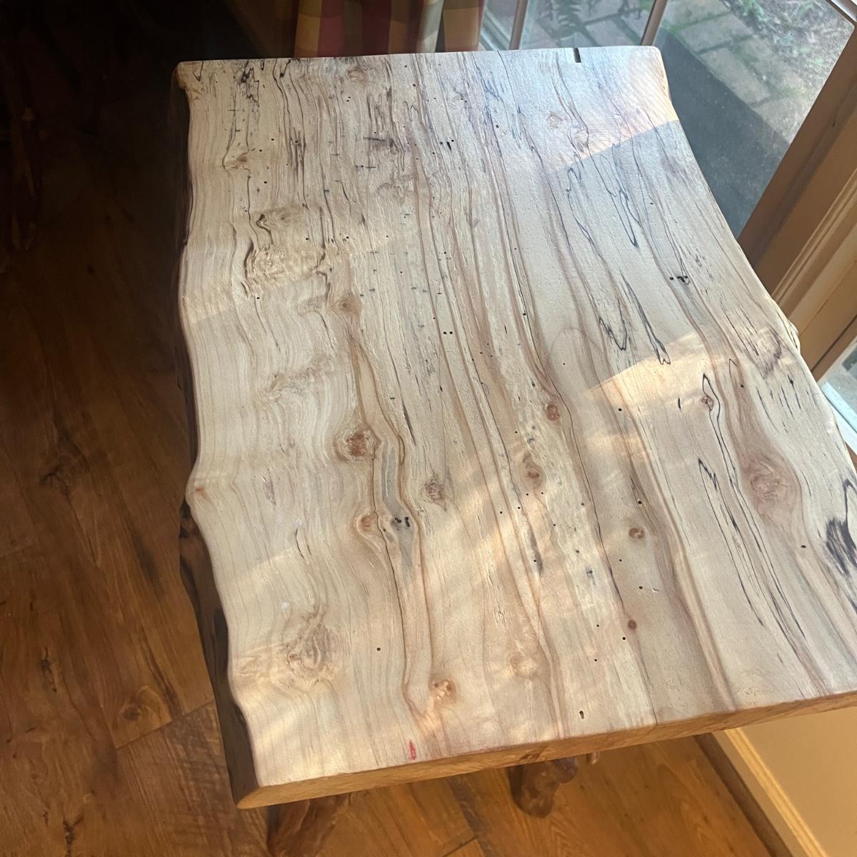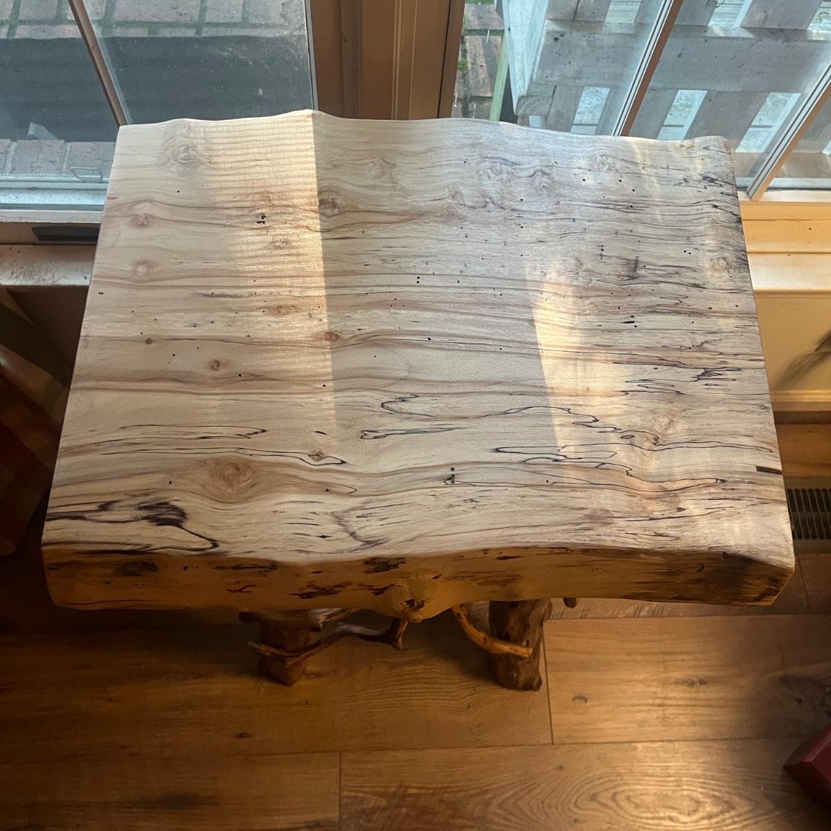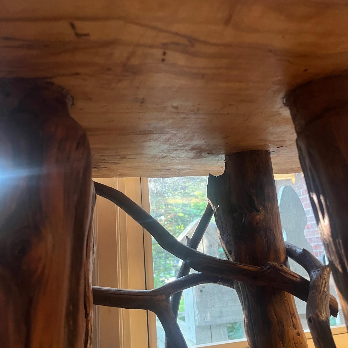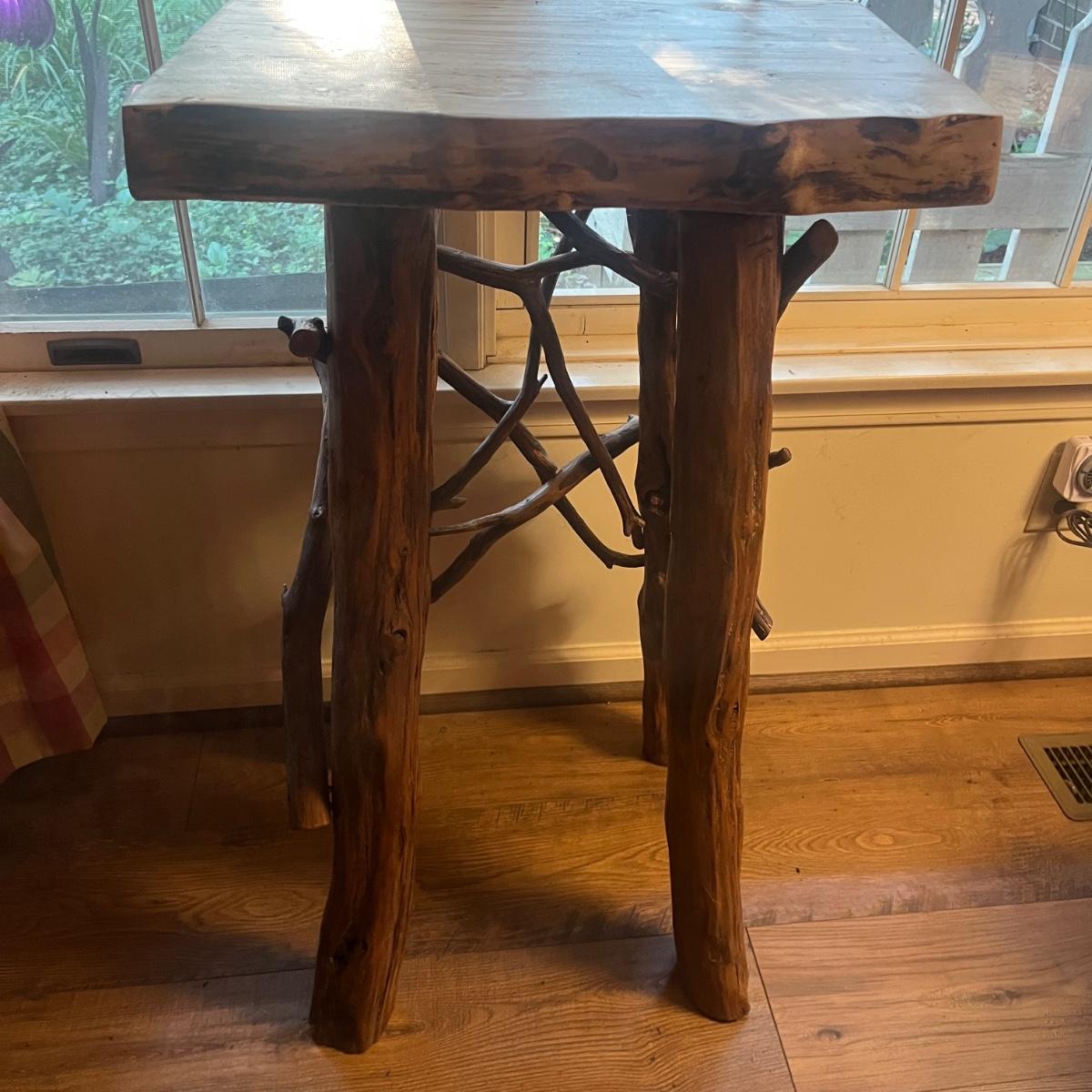 This live edge tall side table with branches and twig for a base. Table measures 19.5” x 16” x 34”H.