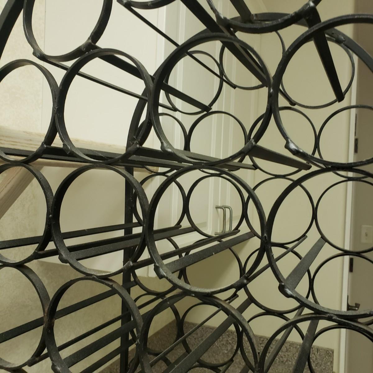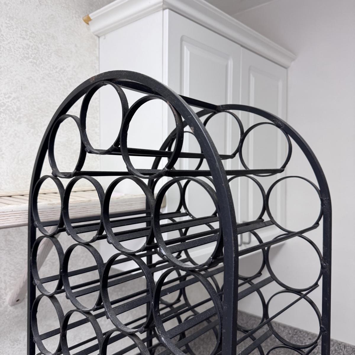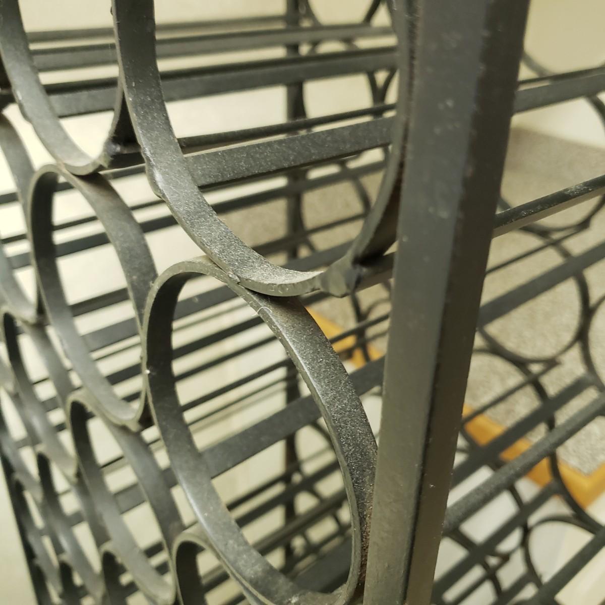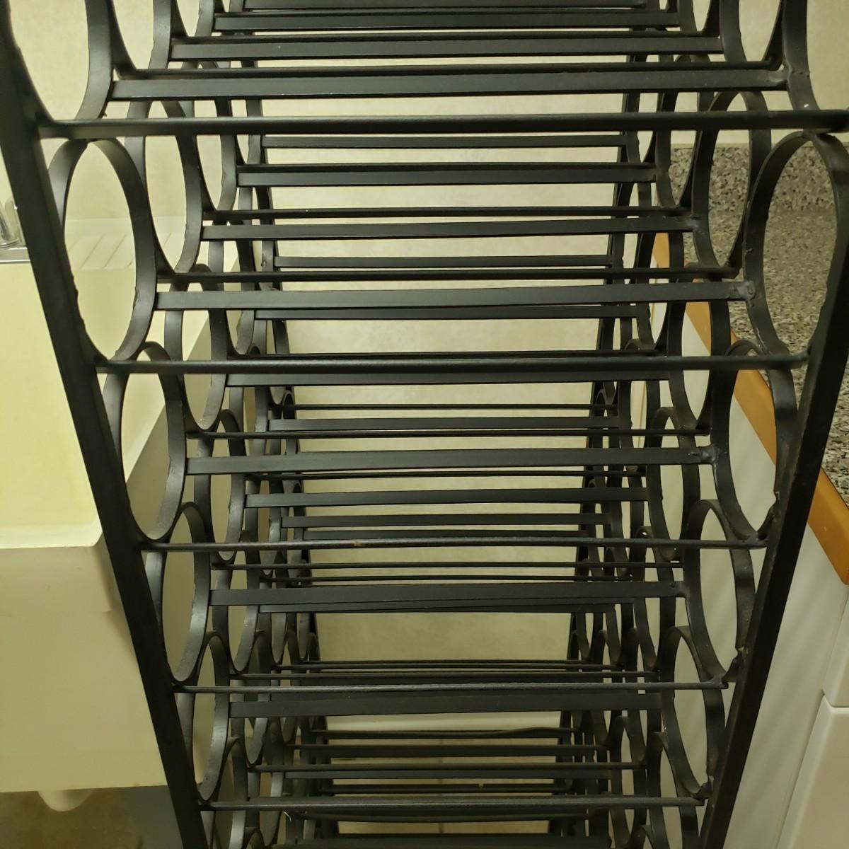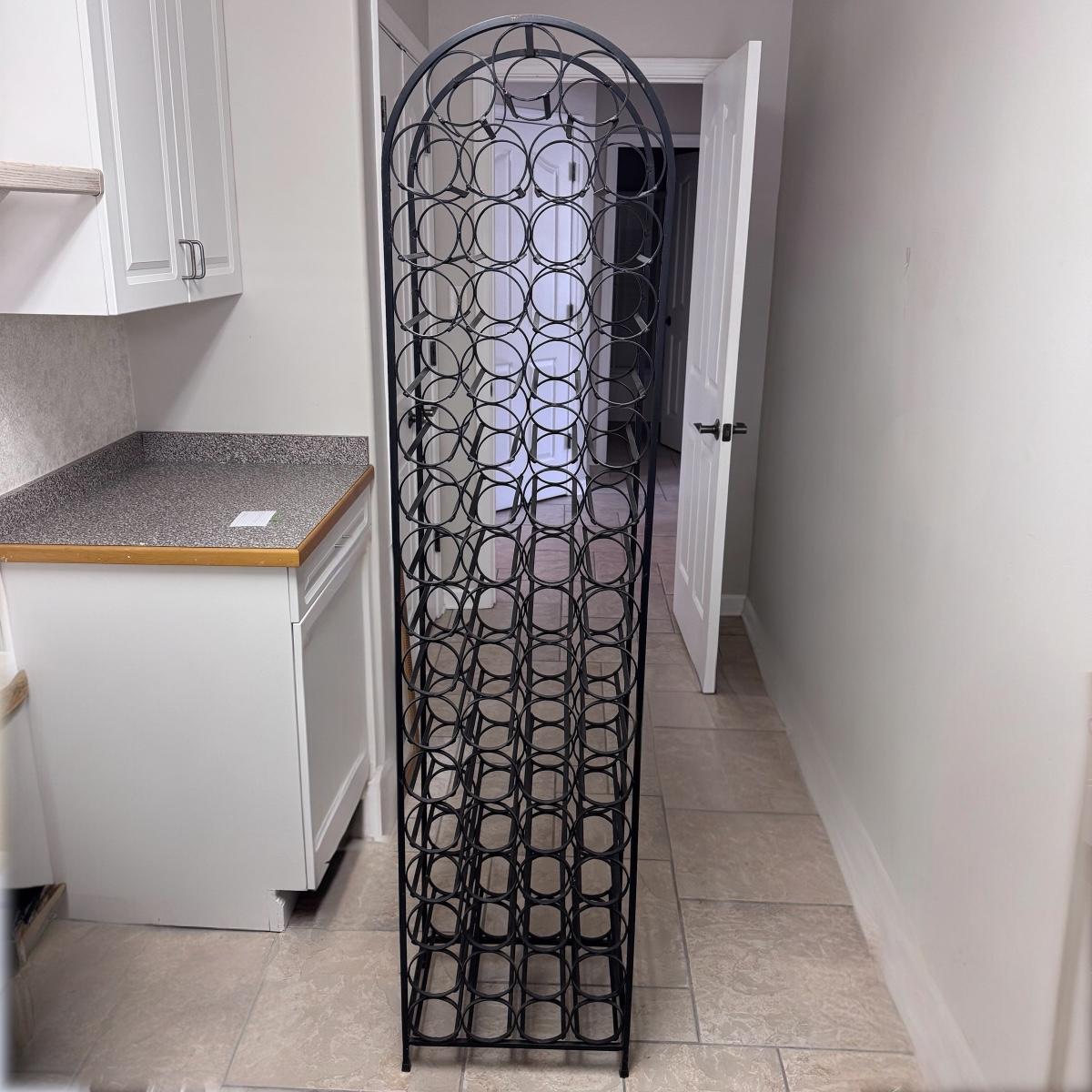This is a 6' tall metal wine rack. It is rather heavy. The rack measures 17" x 12" x 72"H. There are four rubber covers on the feet.