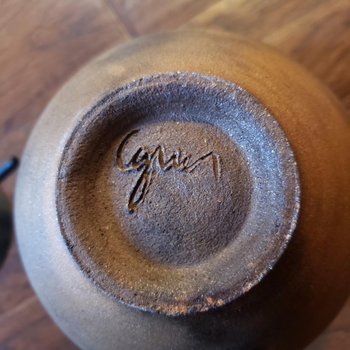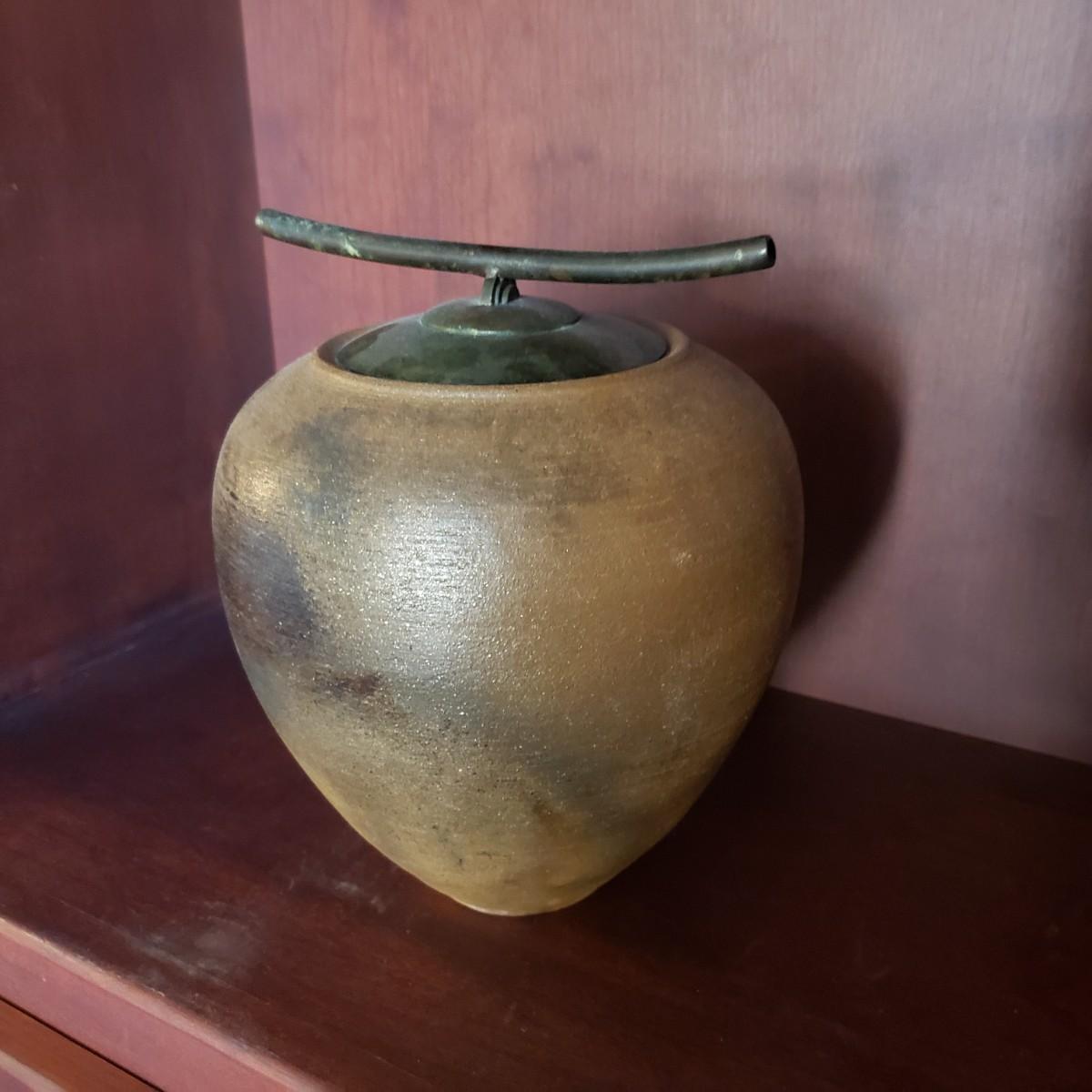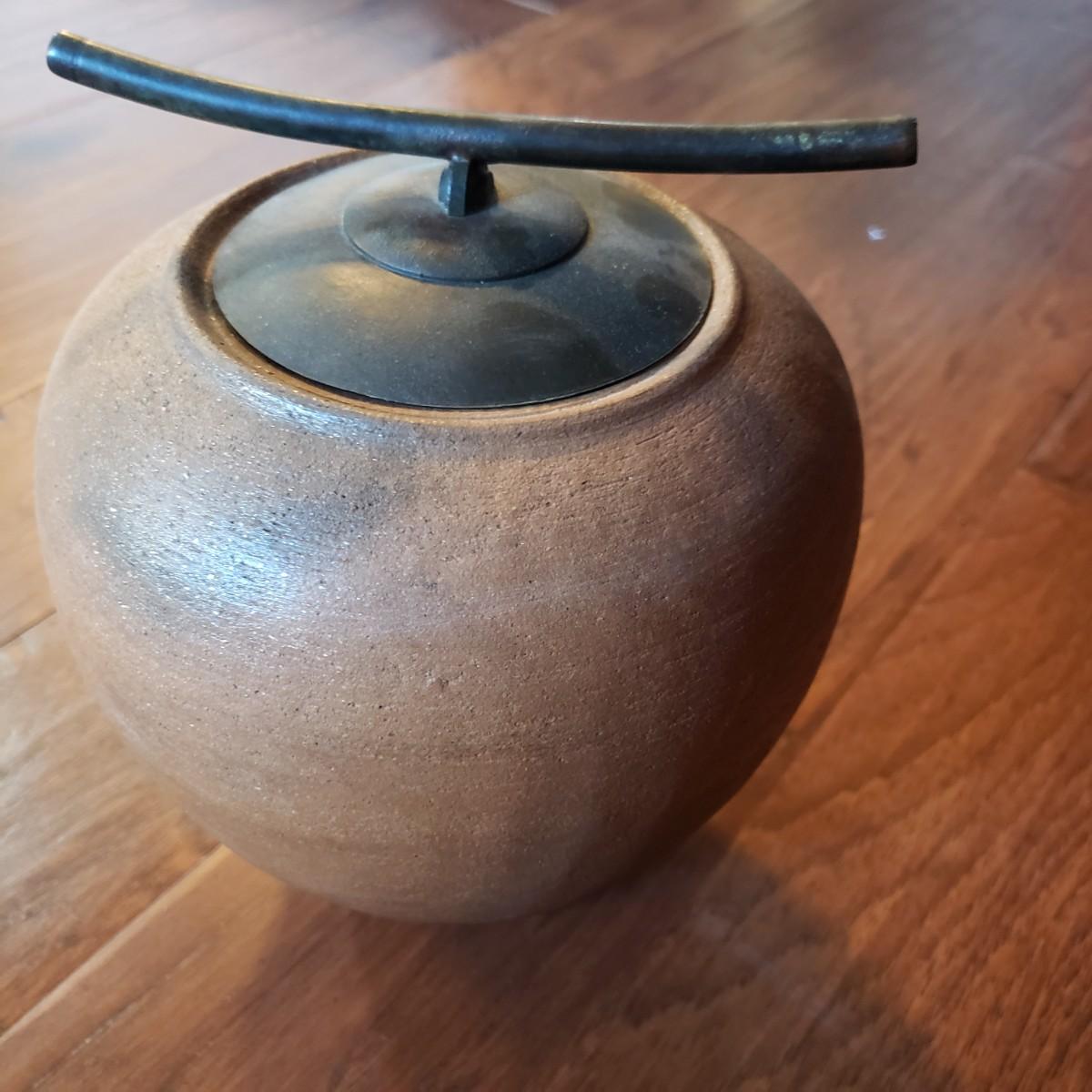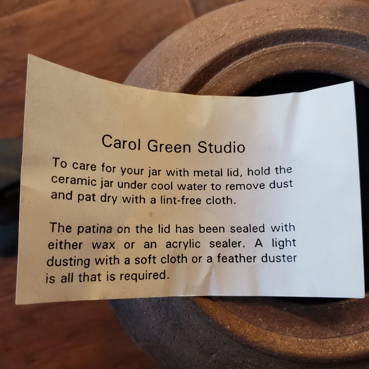 This signed vessel by Carol Green is shaped like an acorn and measures 8" x 9"H. This beautiful vessel has flecks of mica throughout this piece. The lid is made of metal. Comes with care instructions.