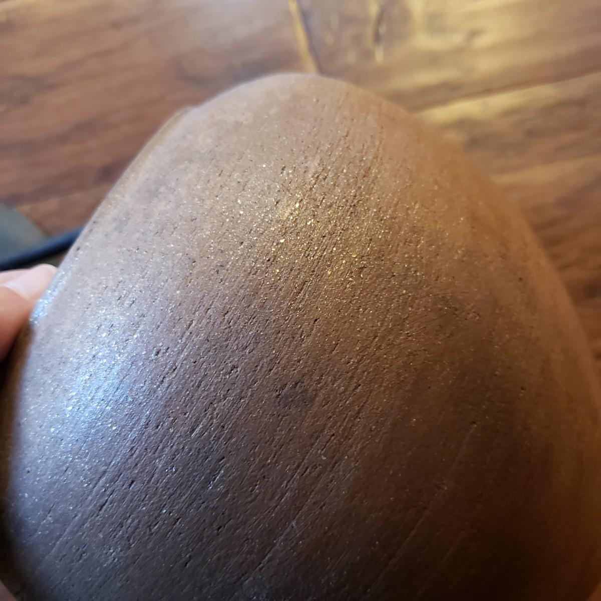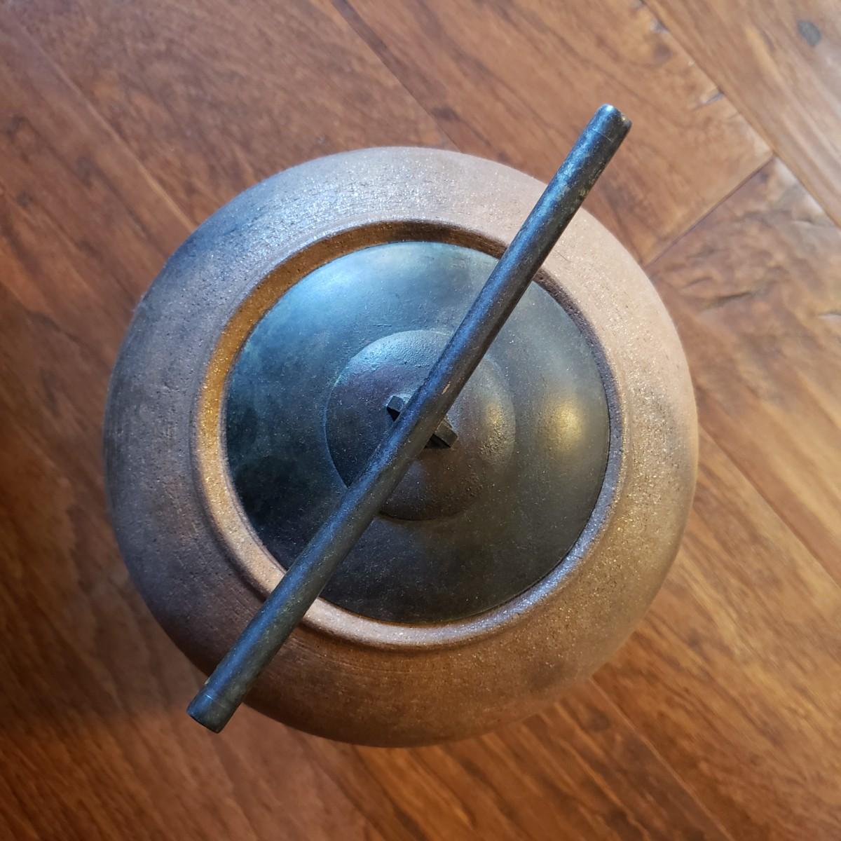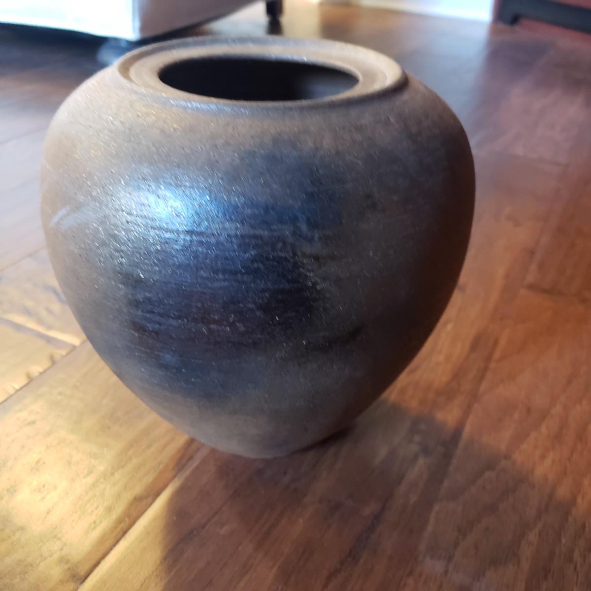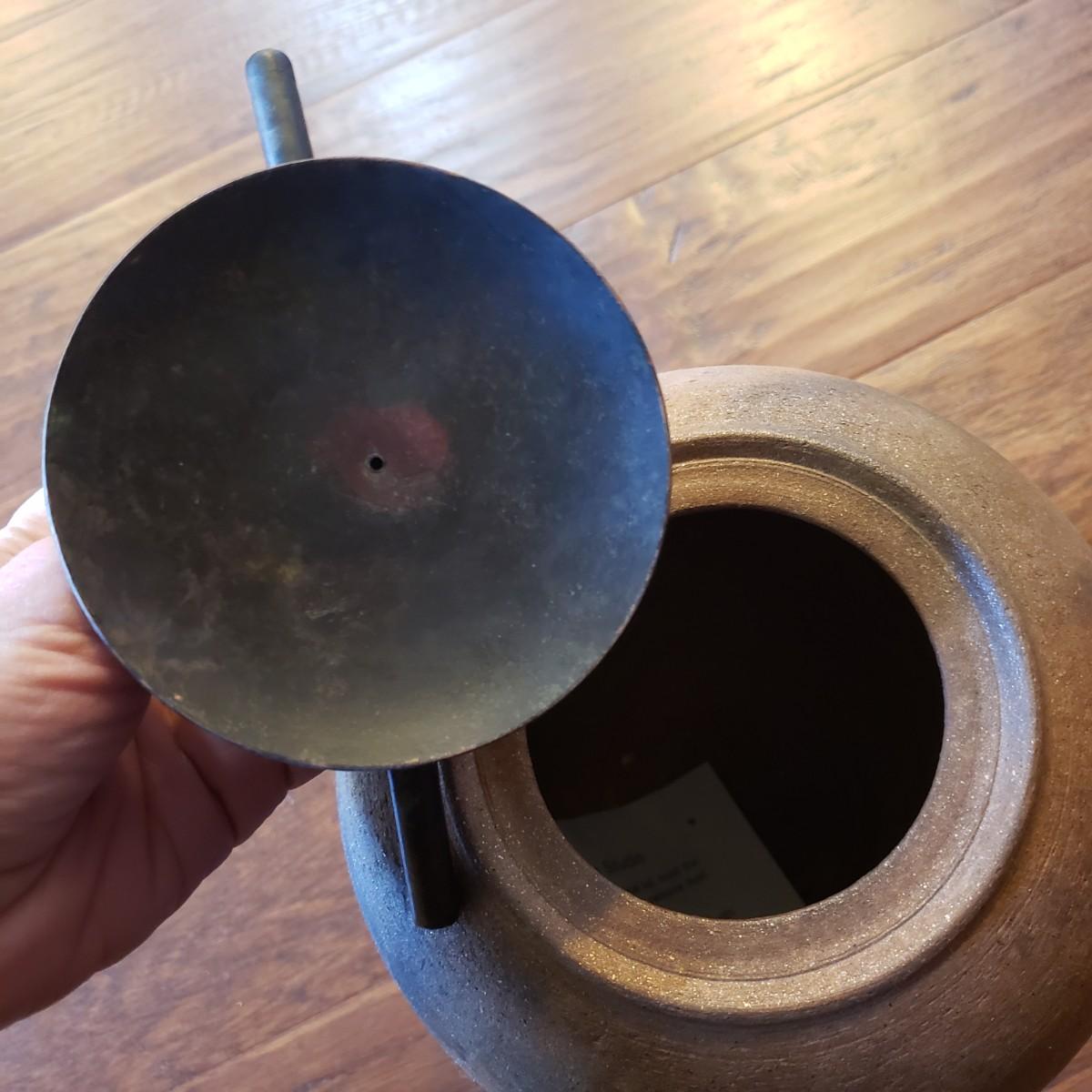 This signed vessel by Carol Green is shaped like an acorn and measures 8" x 9"H. This beautiful vessel has flecks of mica throughout this piece. The lid is made of metal. Comes with care instructions.