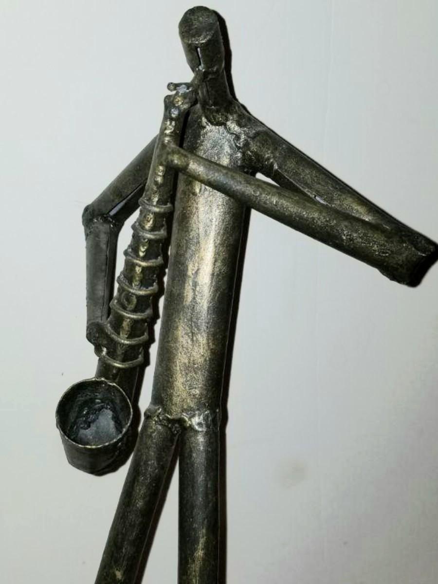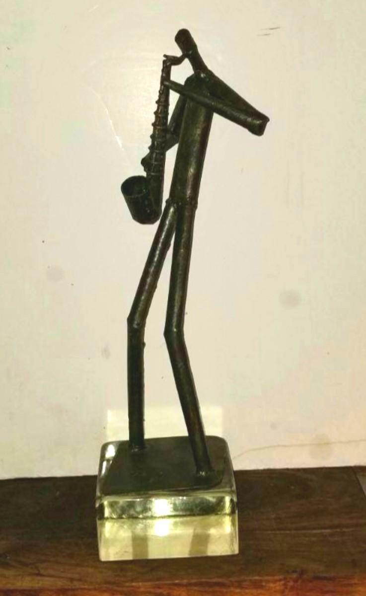 Tall mid-century brutalist steel sculpture of saxophone player