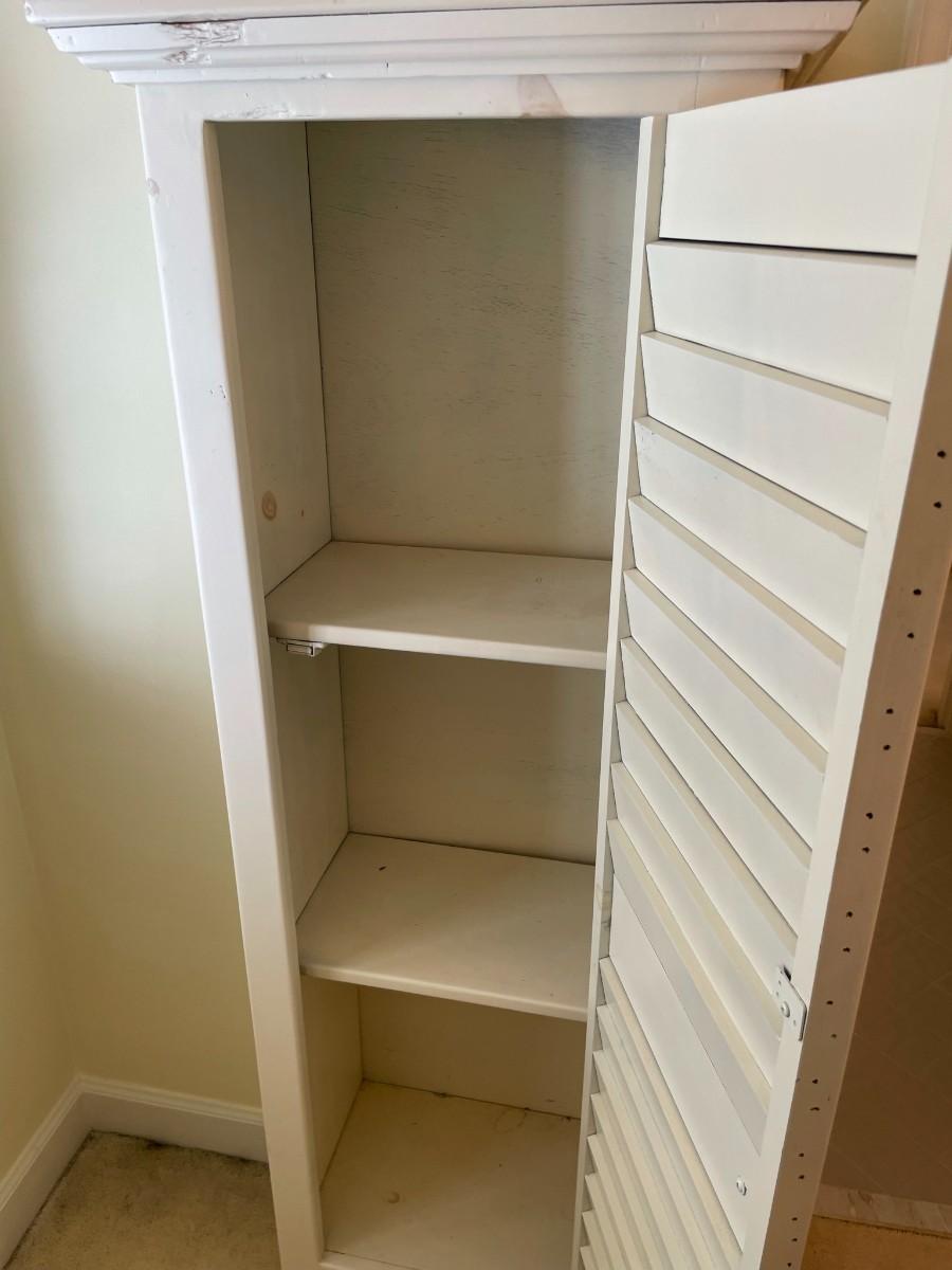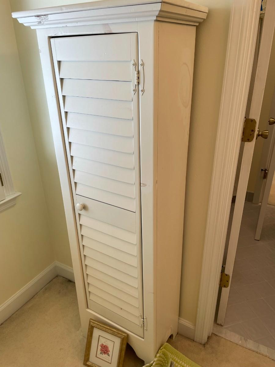 Tall narrow cabinet with louvered door has interior shelves and measures 20"W x 12"D x 57"H. Small floral picture is 8"x9".