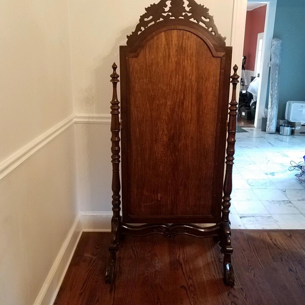 Tall ornately carved wooden cheval mirror in mahogany finish READ DETAILS