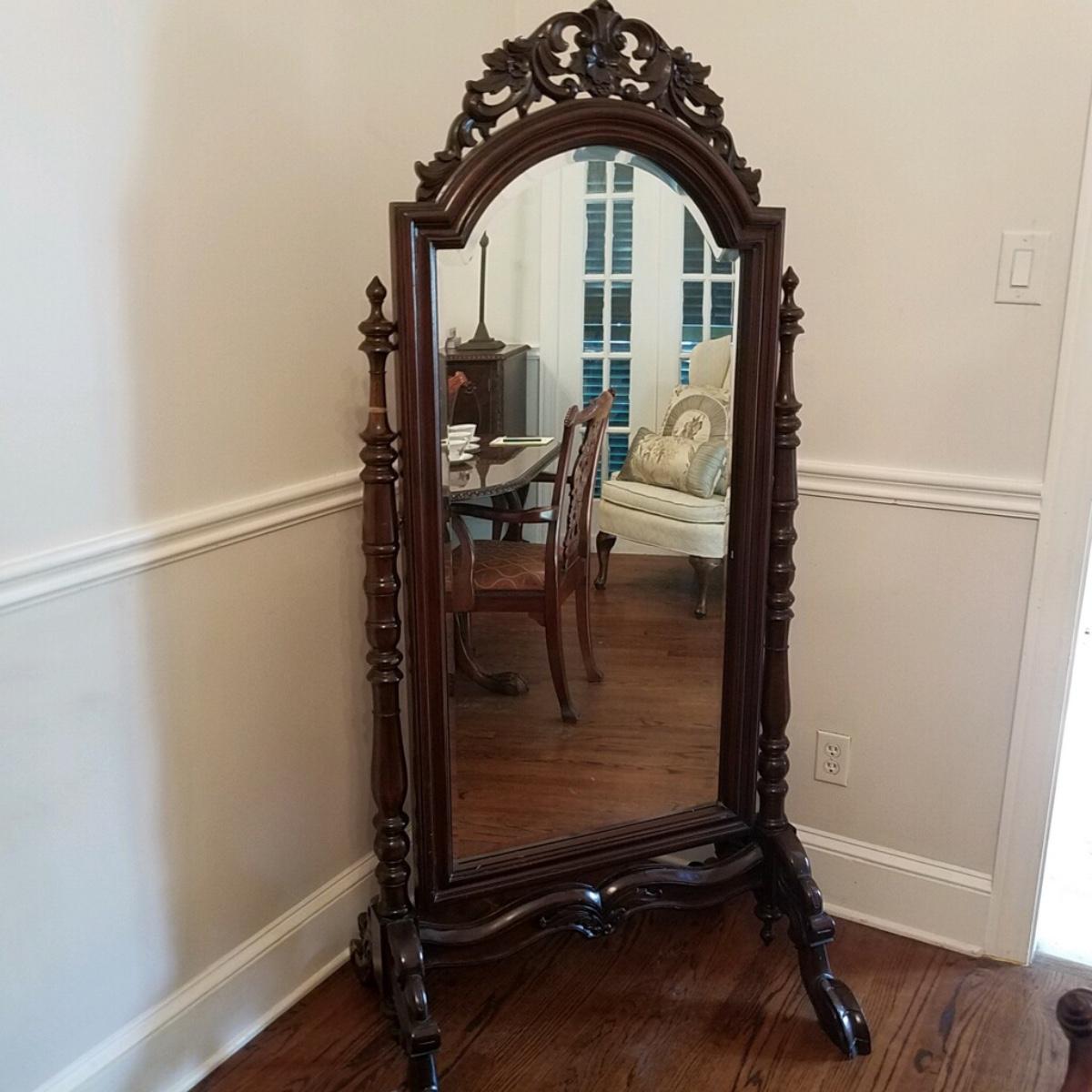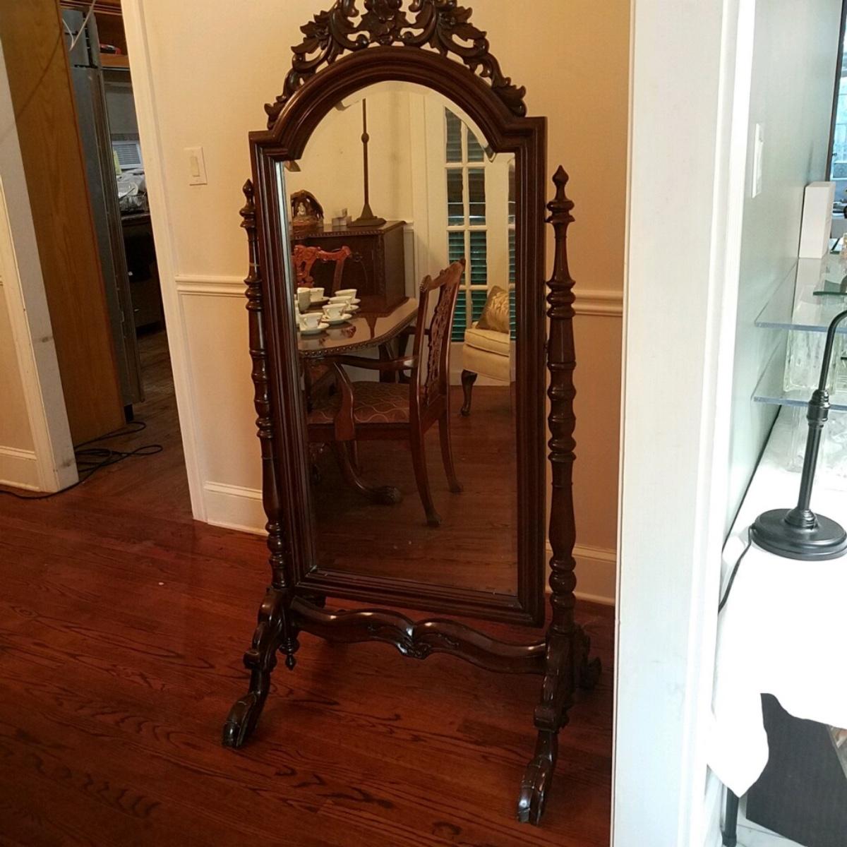 Tall ornately carved wooden cheval mirror in mahogany finish. Very good condition. Approx 33"w x 70"h. NOTE: Very heavy, must bring help to move
