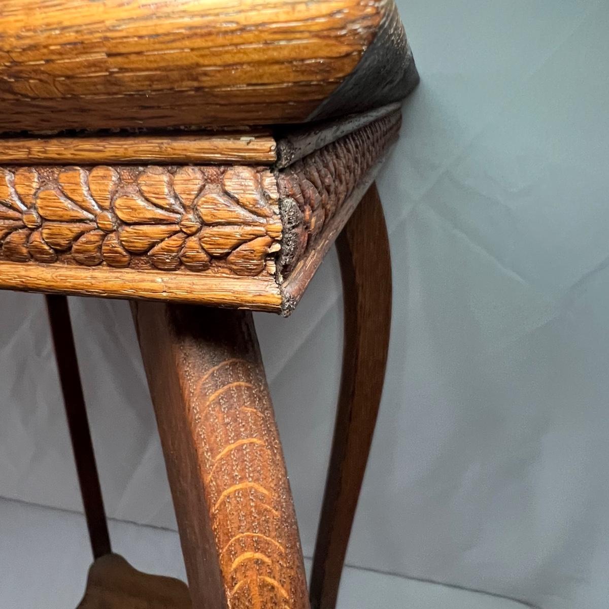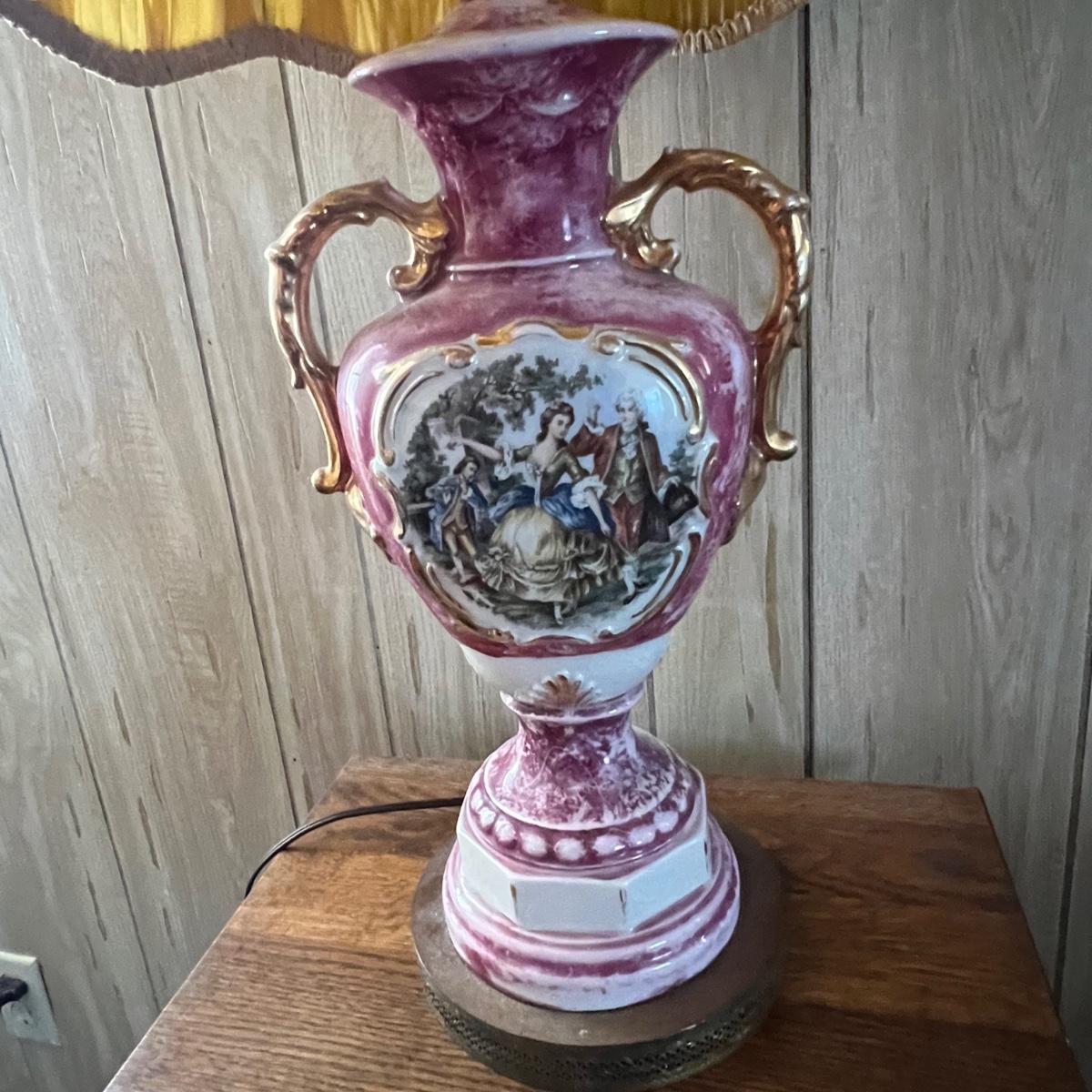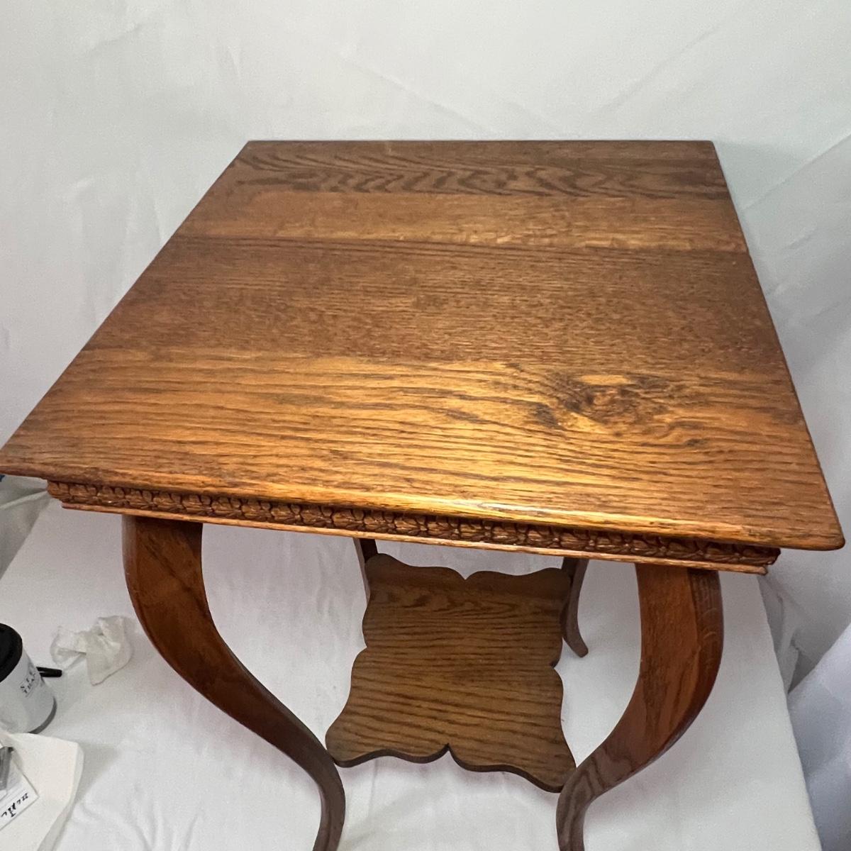 This solid wood parlor table features a pretty band with a carved floral motif. It has a lower shelf and measures 15.5” square x 29”H. The accompanying Victorian style China lamp has a metal base that is possibly copper and gilded handles. The vintage shade will need some lubrication to take off as the finial currently will not unscrew.