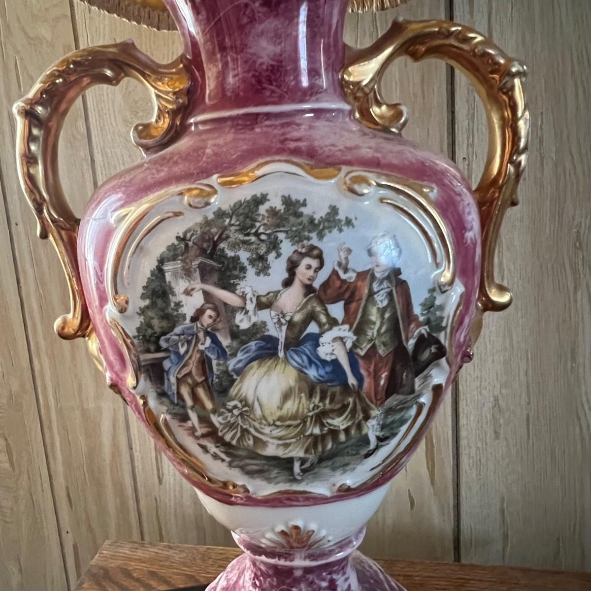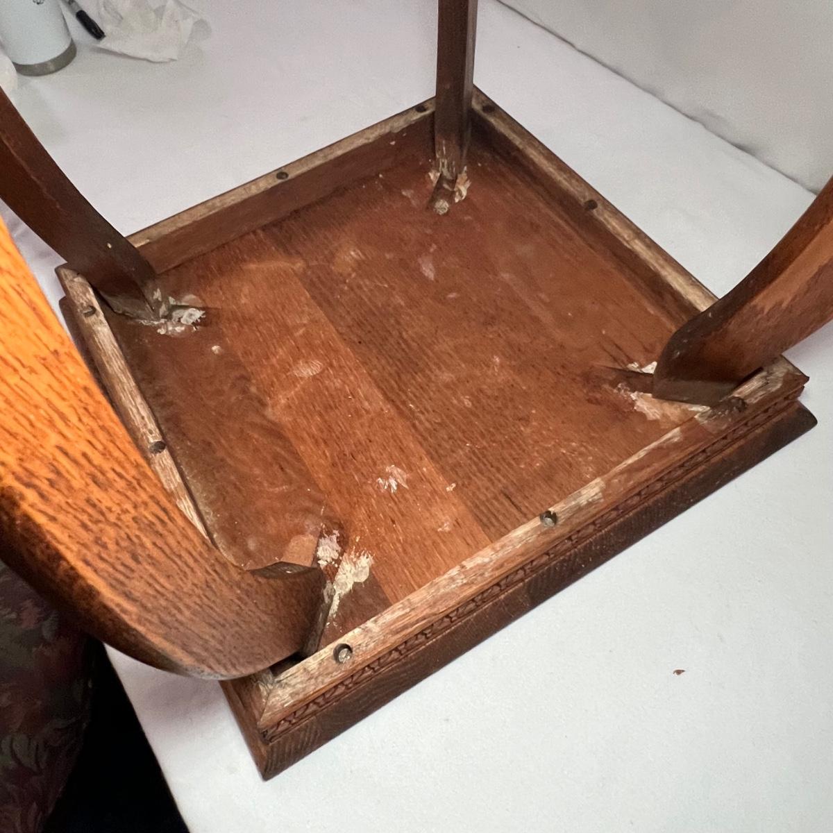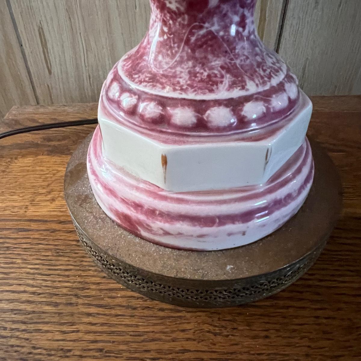 This solid wood parlor table features a pretty band with a carved floral motif. It has a lower shelf and measures 15.5” square x 29”H. The accompanying Victorian style China lamp has a metal base that is possibly copper and gilded handles. The vintage shade will need some lubrication to take off as the finial currently will not unscrew.