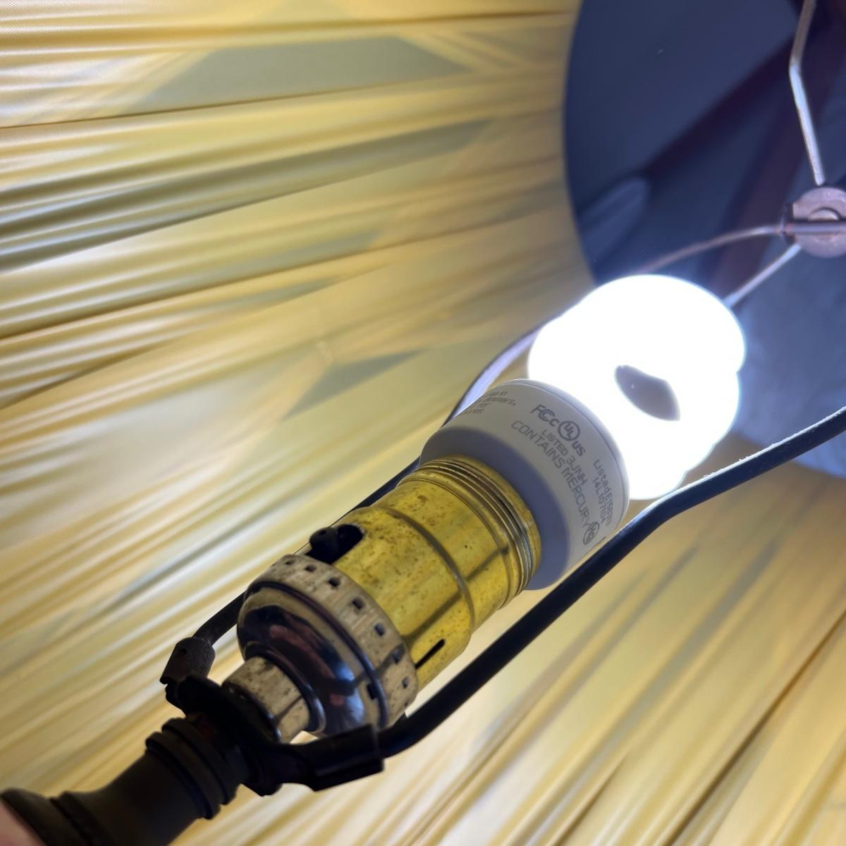 Lamp without shade measures 7” (base) x 17”H - shade measures 13” x 15”. Lamp turned on when plugged in.