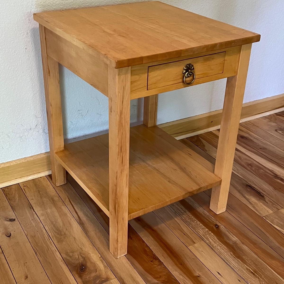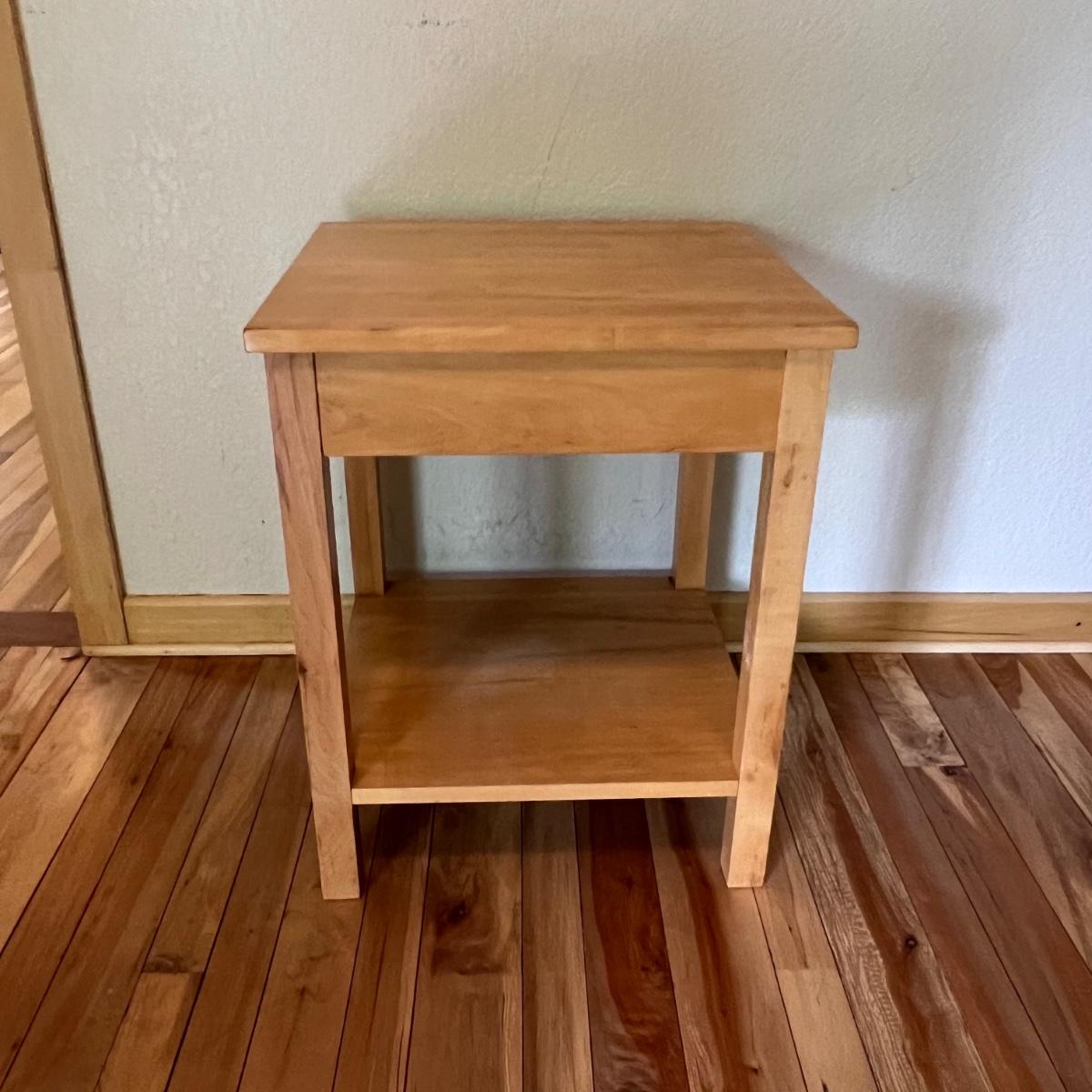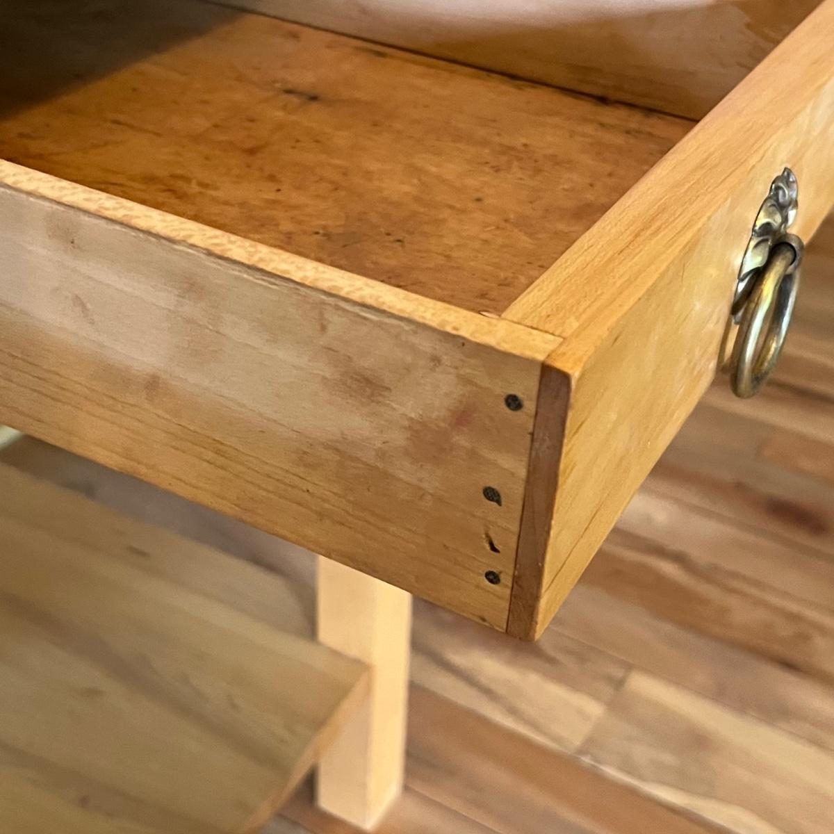 This solid table appears to be pine wood. It has one drawer with a brass like metal pull and an open lower shelf perfect for display. There are some minor scuff marks in the center of shelf, see images.
