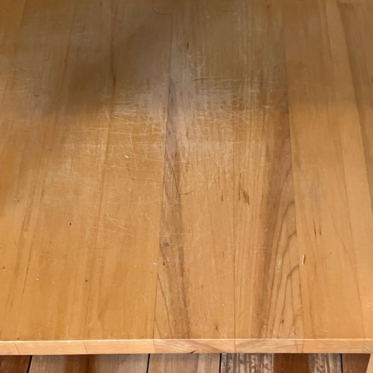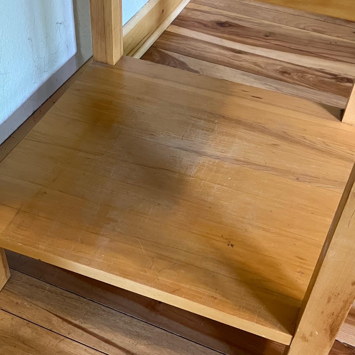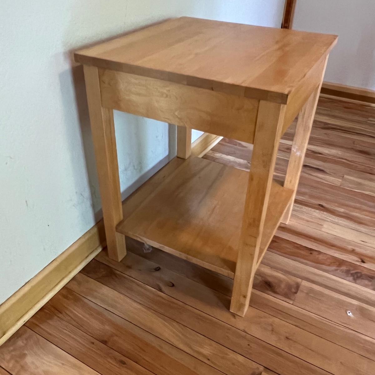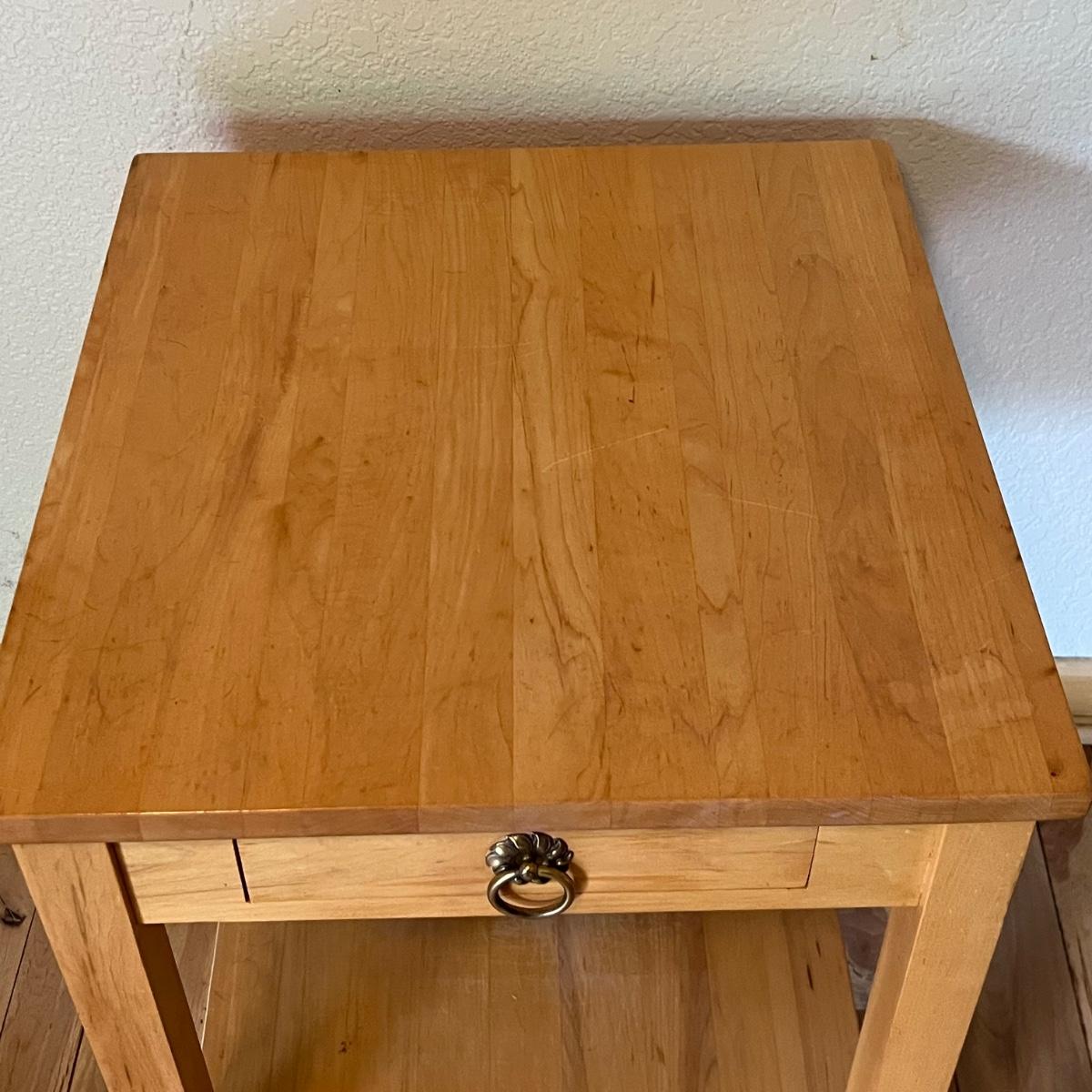 This solid table appears to be pine wood. It has one drawer with a brass like metal pull and an open lower shelf perfect for display. There are some minor scuff marks in the center of shelf, see images.