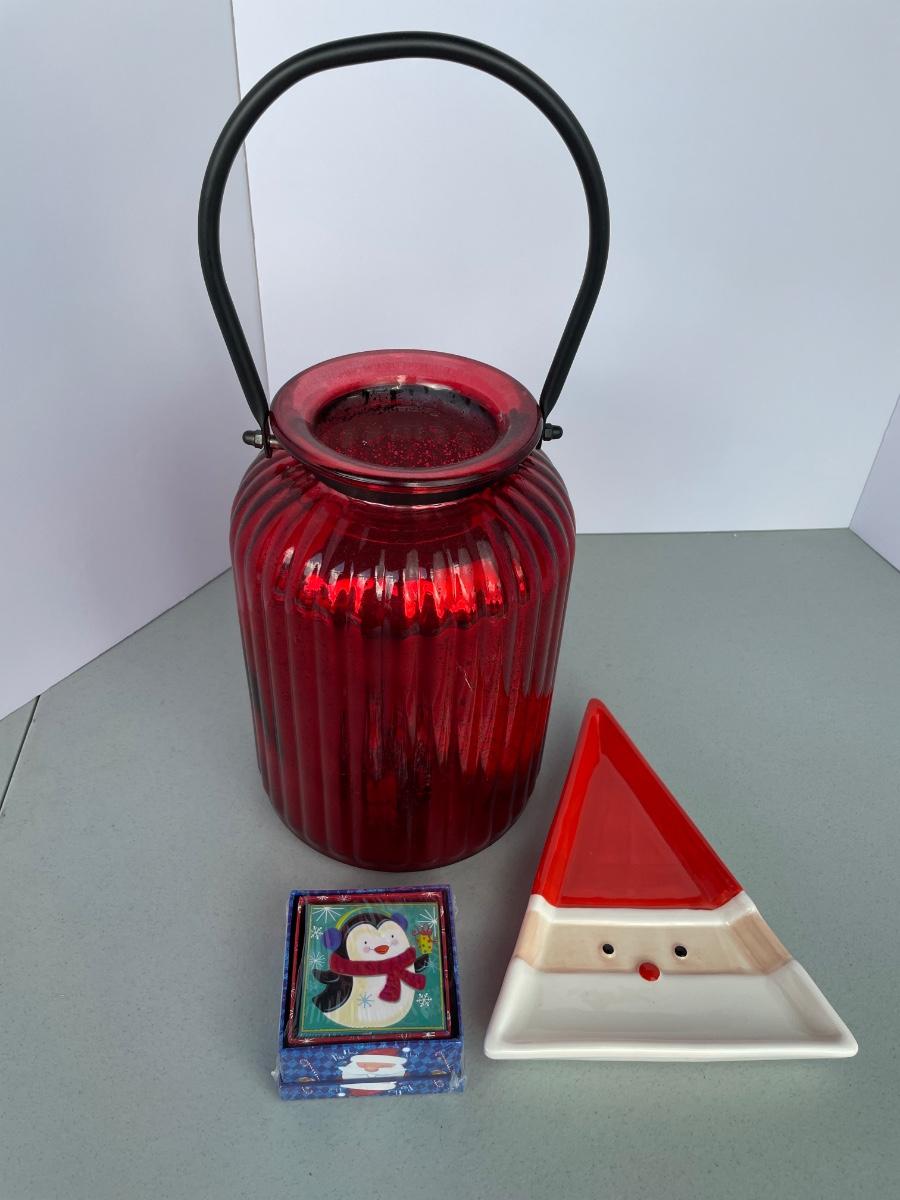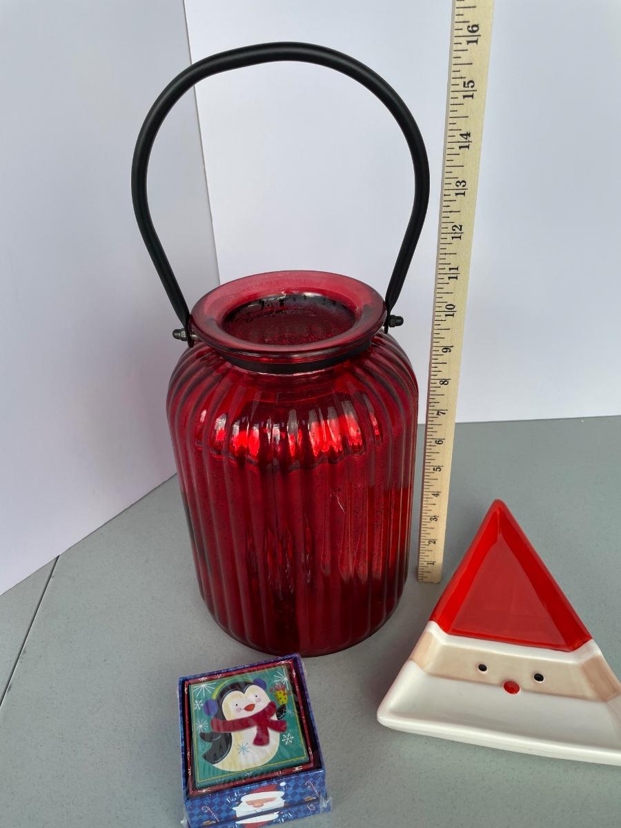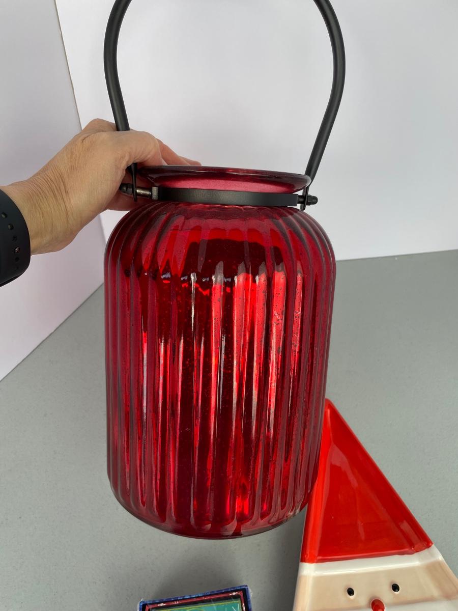 Glass decor is 16” tall with handle. Would be great with electric candle inside.