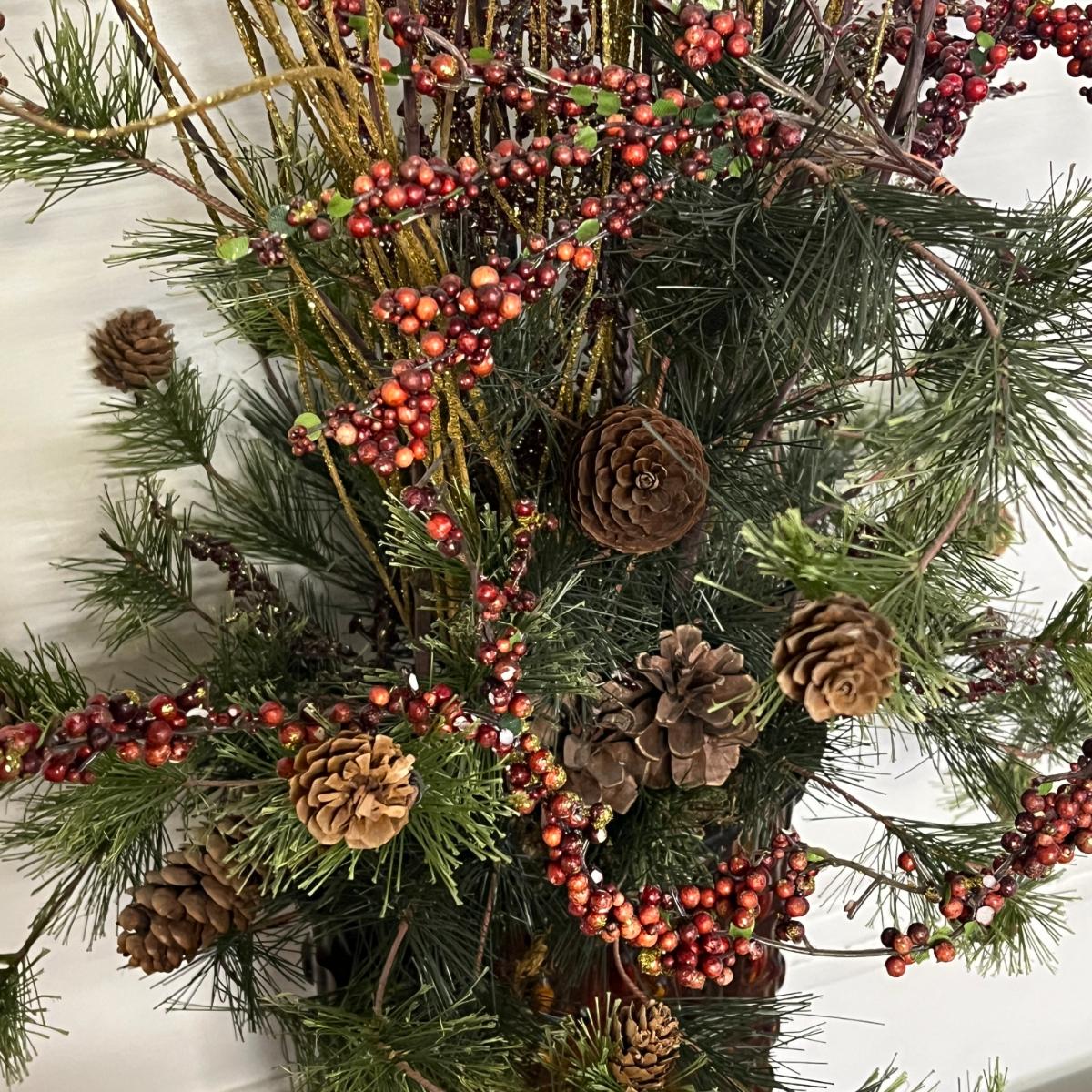 Branches, pine needles, cones, reddish florals.