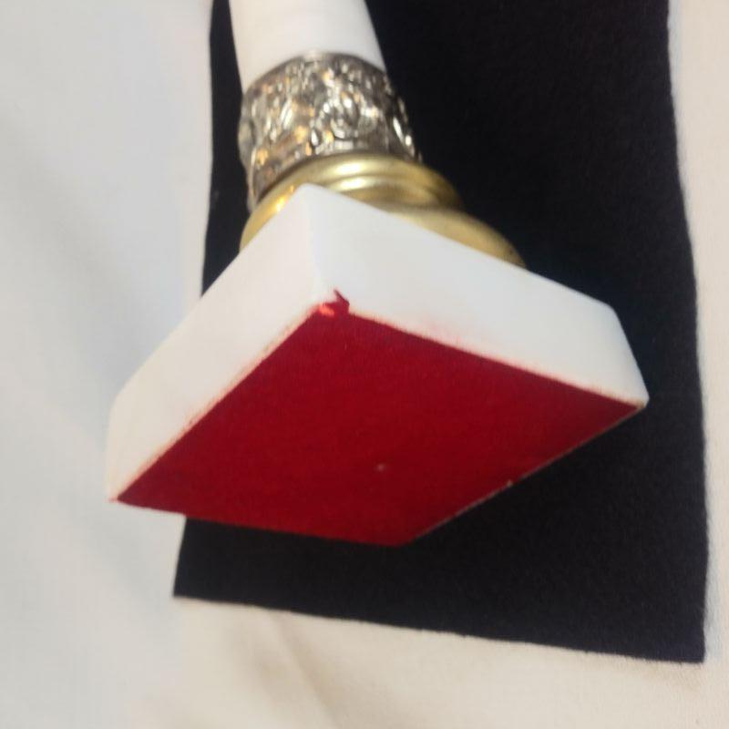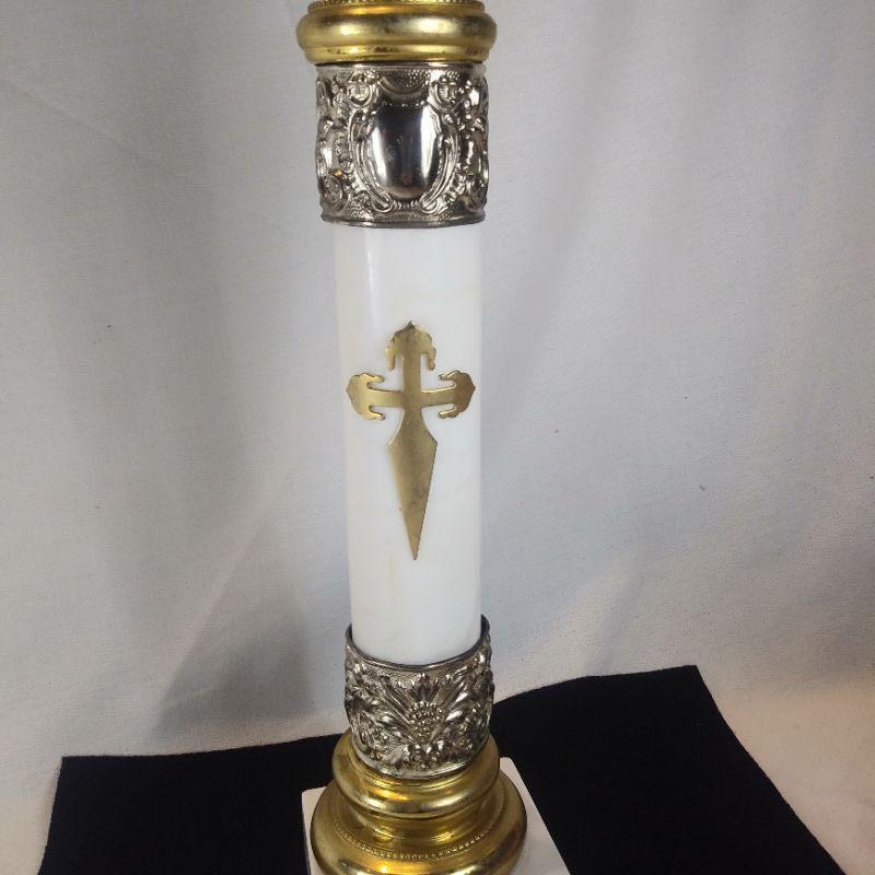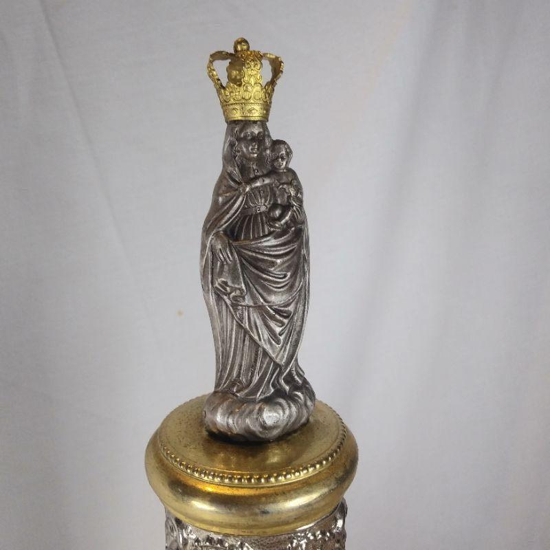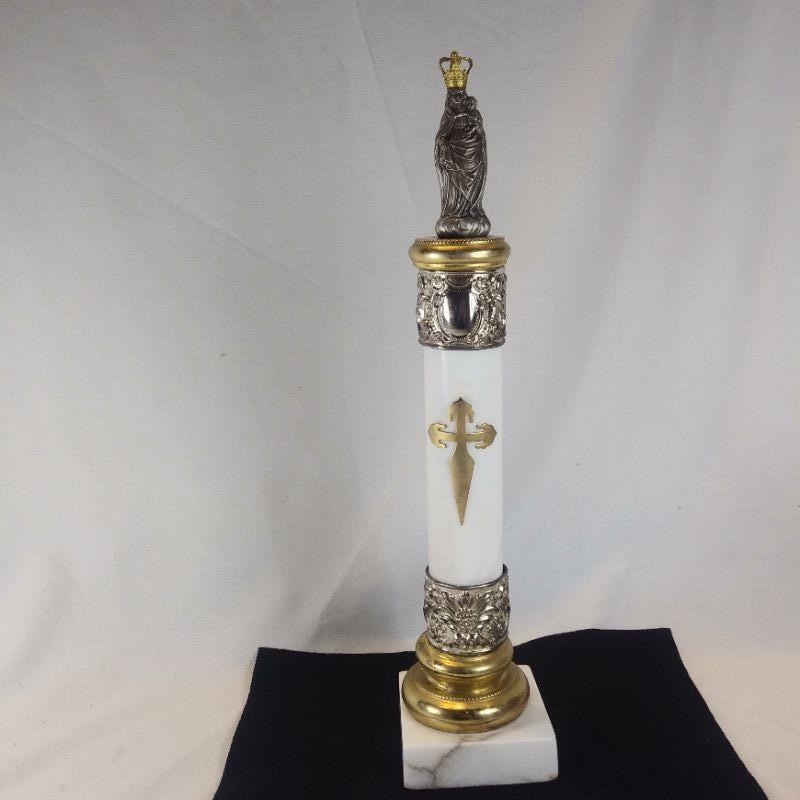 This lot is a tall & heavily adorned, marble Religious Column with Mary shown as the Queen Mother holding the Baby Jesus as a cast figure on top. The figure of Mary and Jesus is very nice. The marble column leans a little forward when viewing from the side. The base measures 3 1/2-inches square - total height is 16 1/2-inches tall. A very different and unique piece.