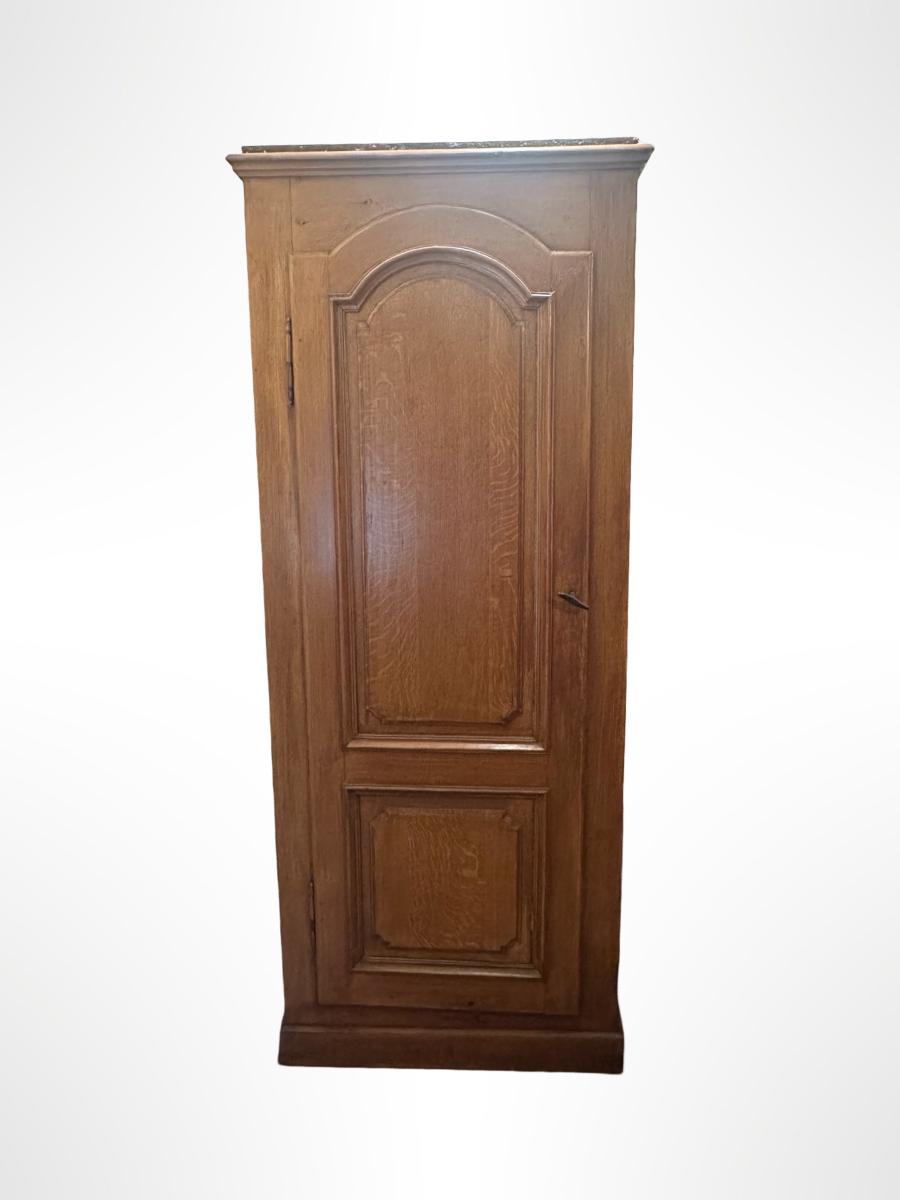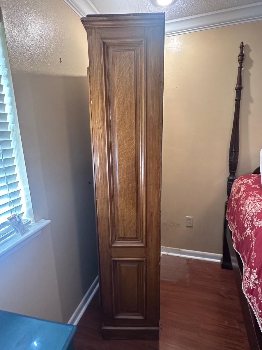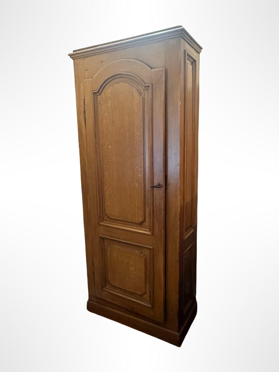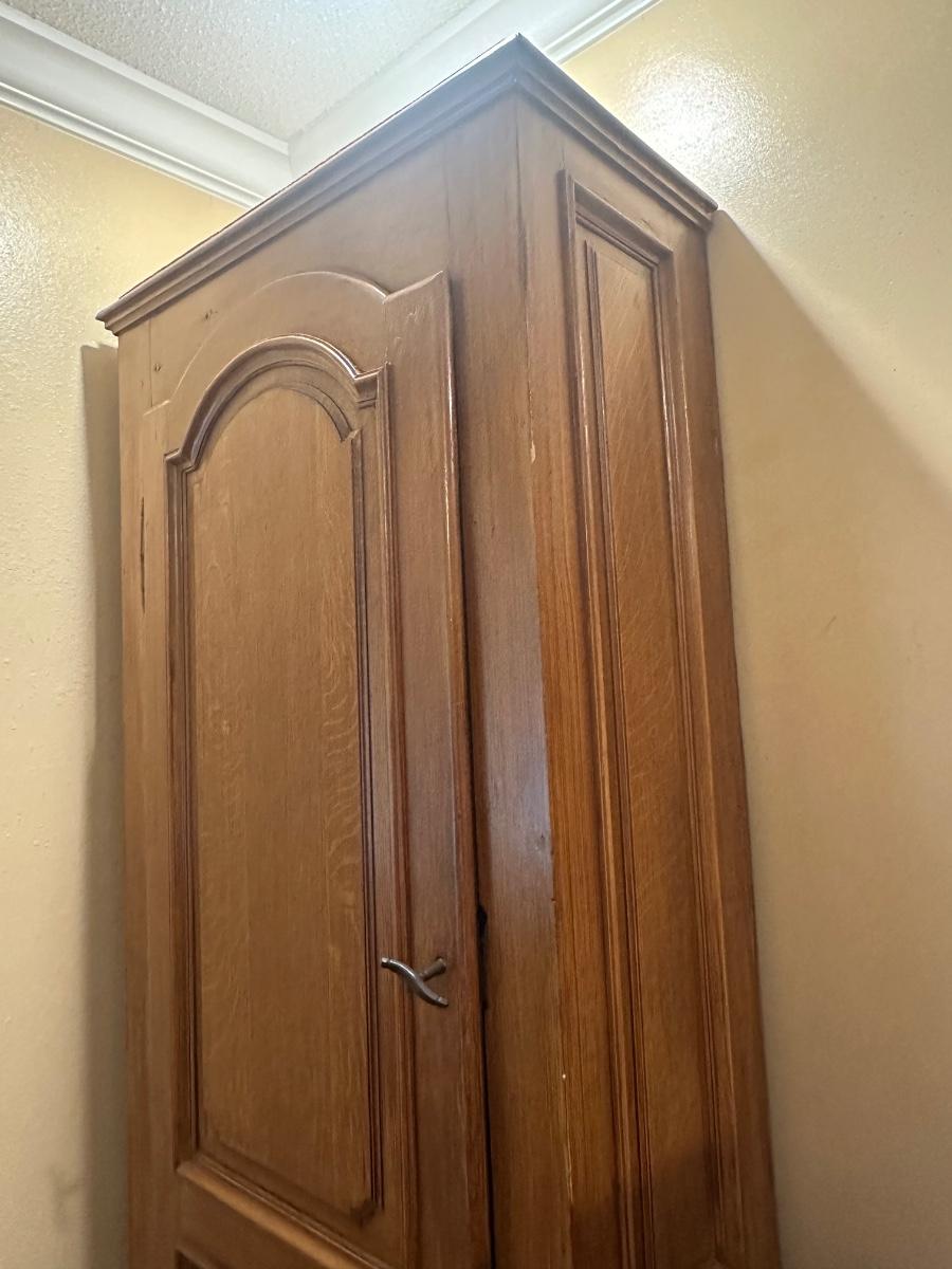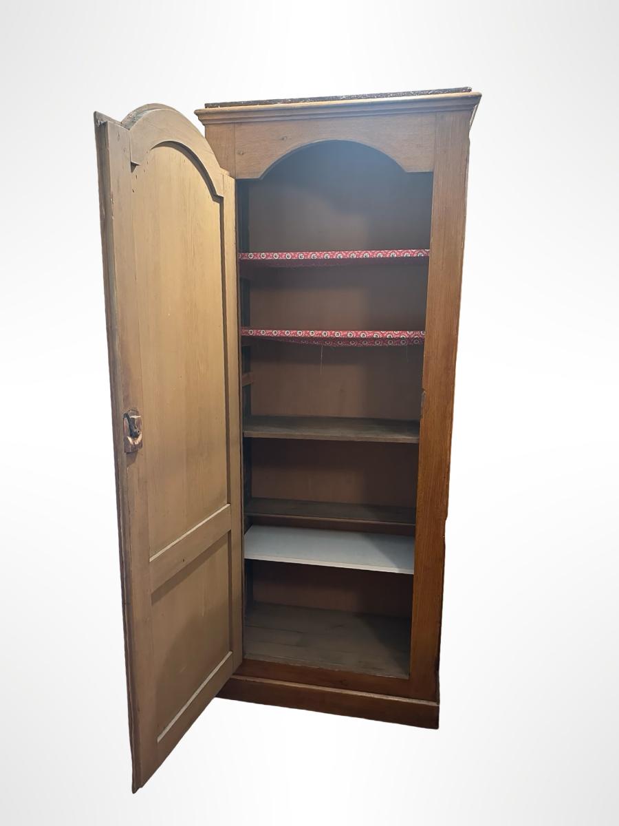 Tall single-door wooden storage cabinet / wardrobe featuring paneled door with arched detailing and crown-style top. Interior includes multiple fixed shelves for linens, clothing, or general storage. Finished in a warm medium wood tone.