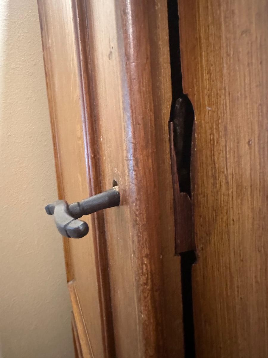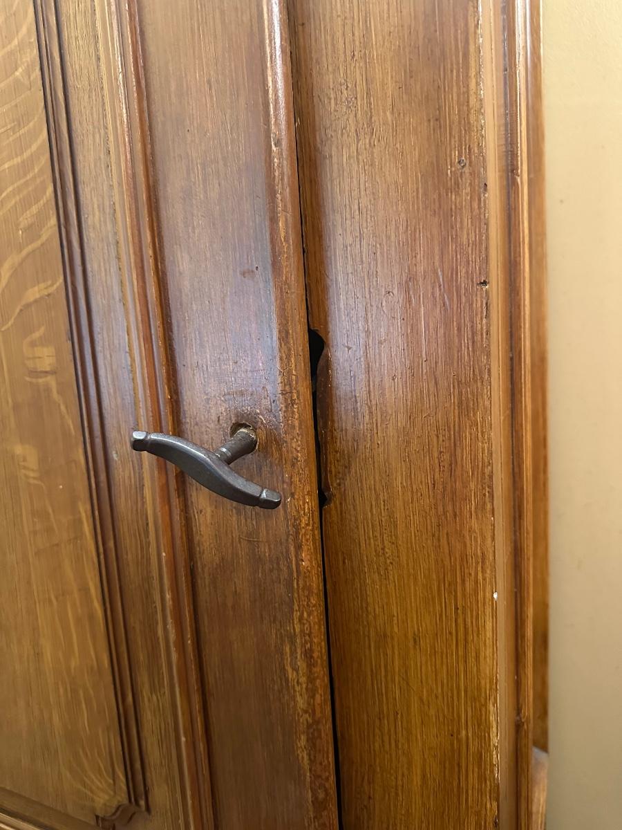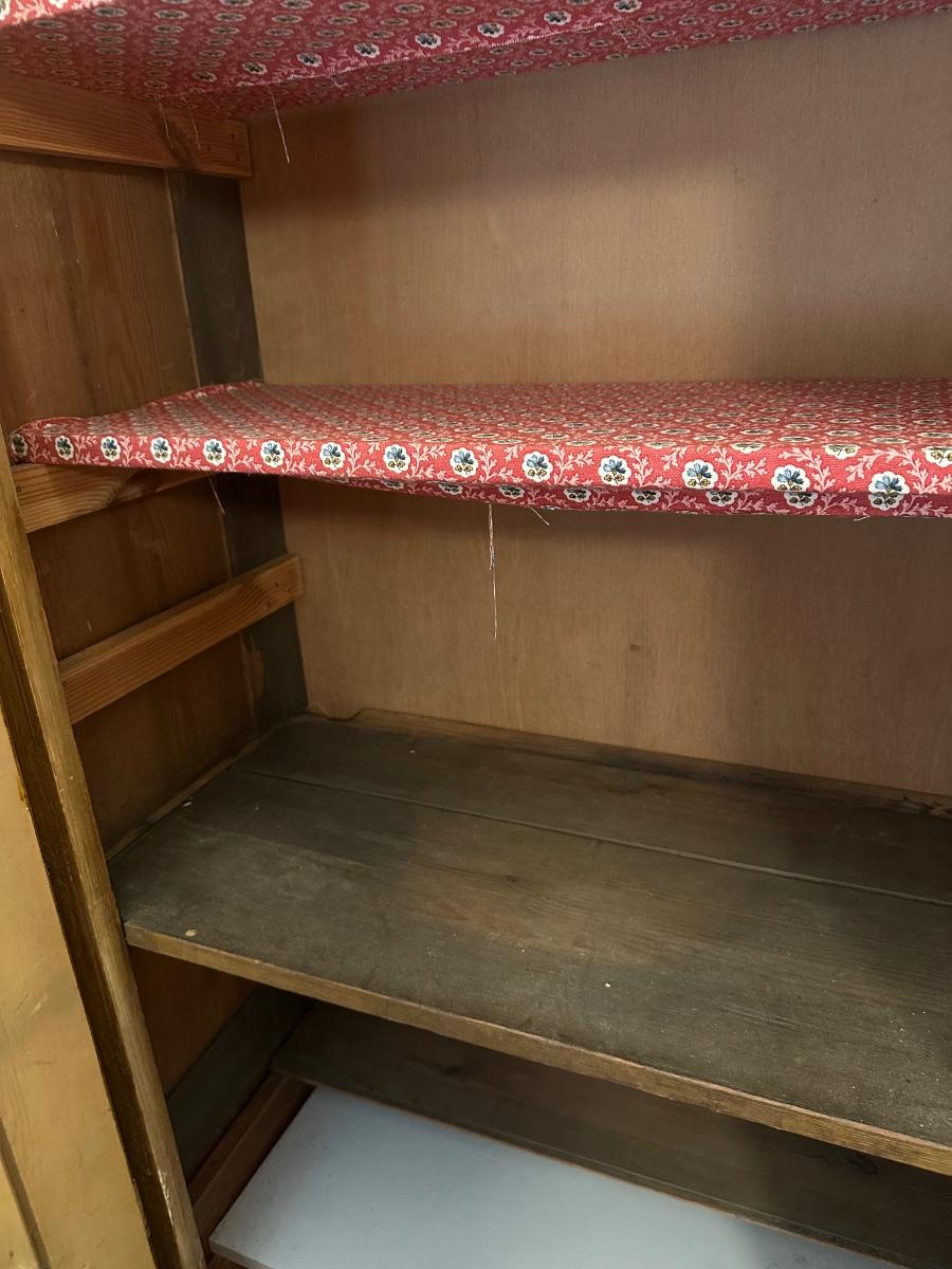 Door opens and closes properly. Interior shelves show visible wear from use; some shelves are lined with decorative paper. Overall solid and functional. See photos for condition and details.