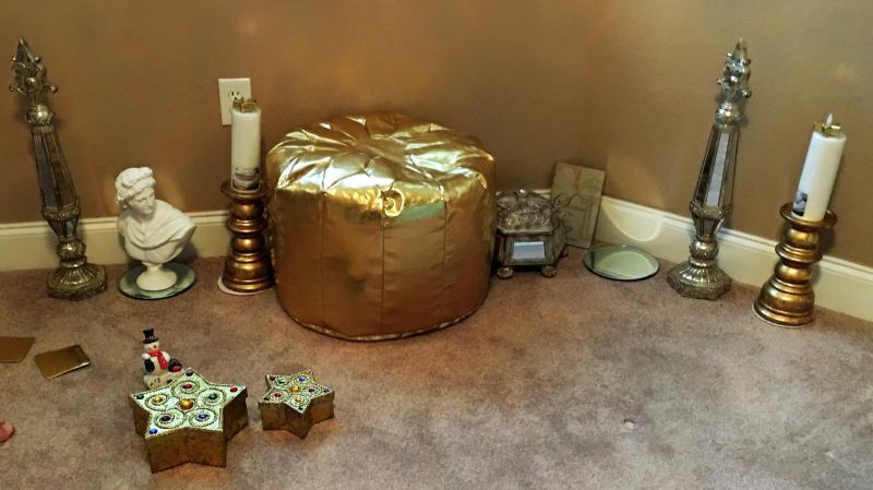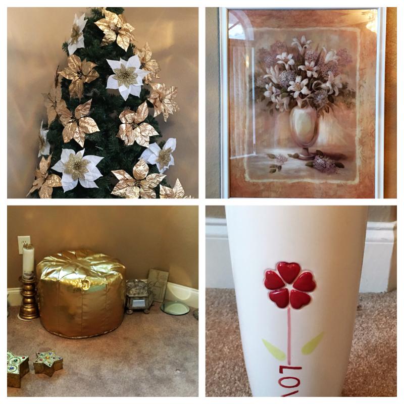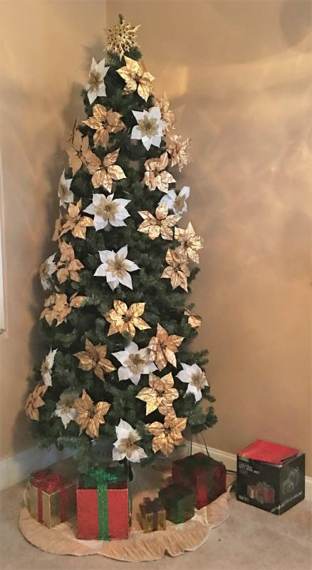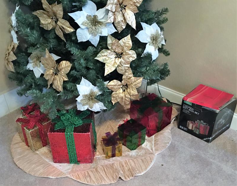 This lot contains a 7' pre-lit slim pine Christmas tree, all faux gifts, hassock and other decorative items