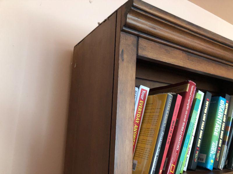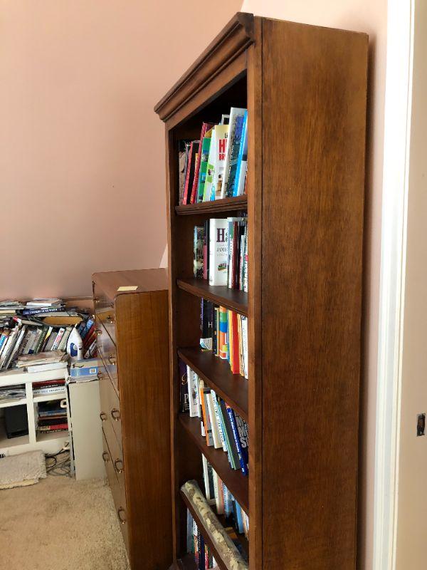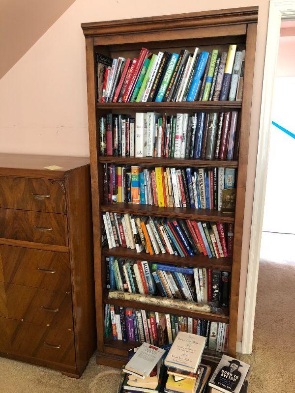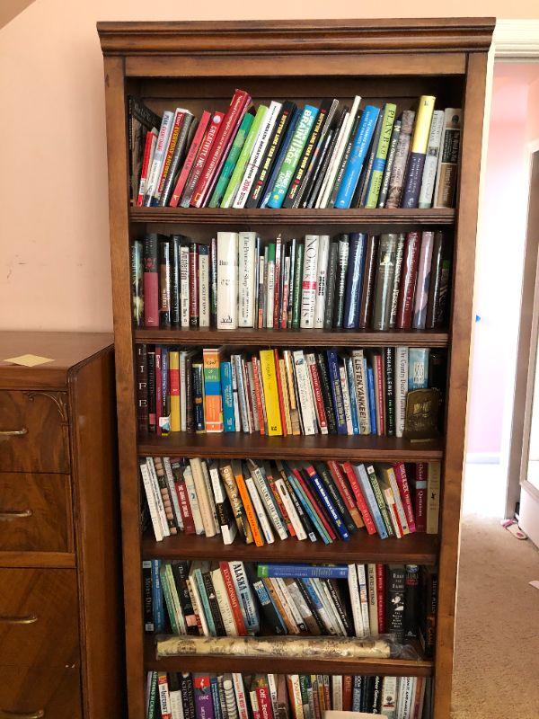 Tall solid wood book shelf in a medium brown finish. Includes any books you'd like from the shelf!