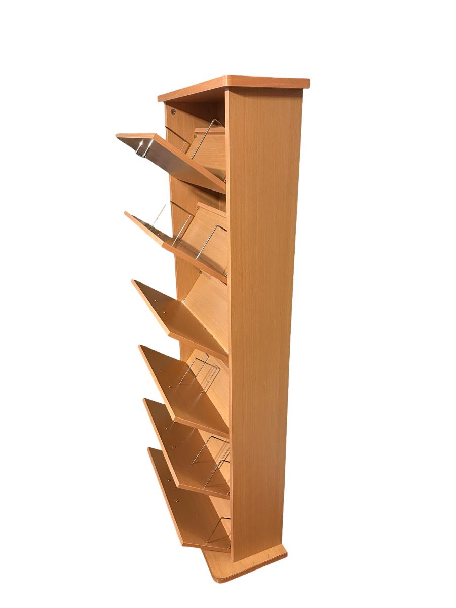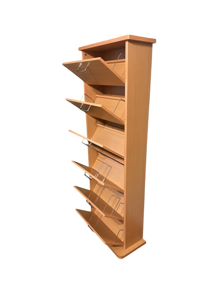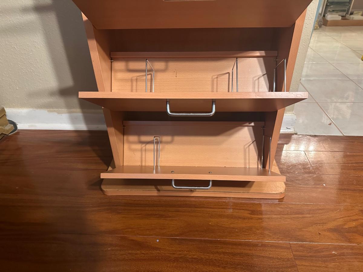 Tall wood tilt-out storage cabinet with multiple drop-front compartments and metal handles. Light surface wear; see photos.