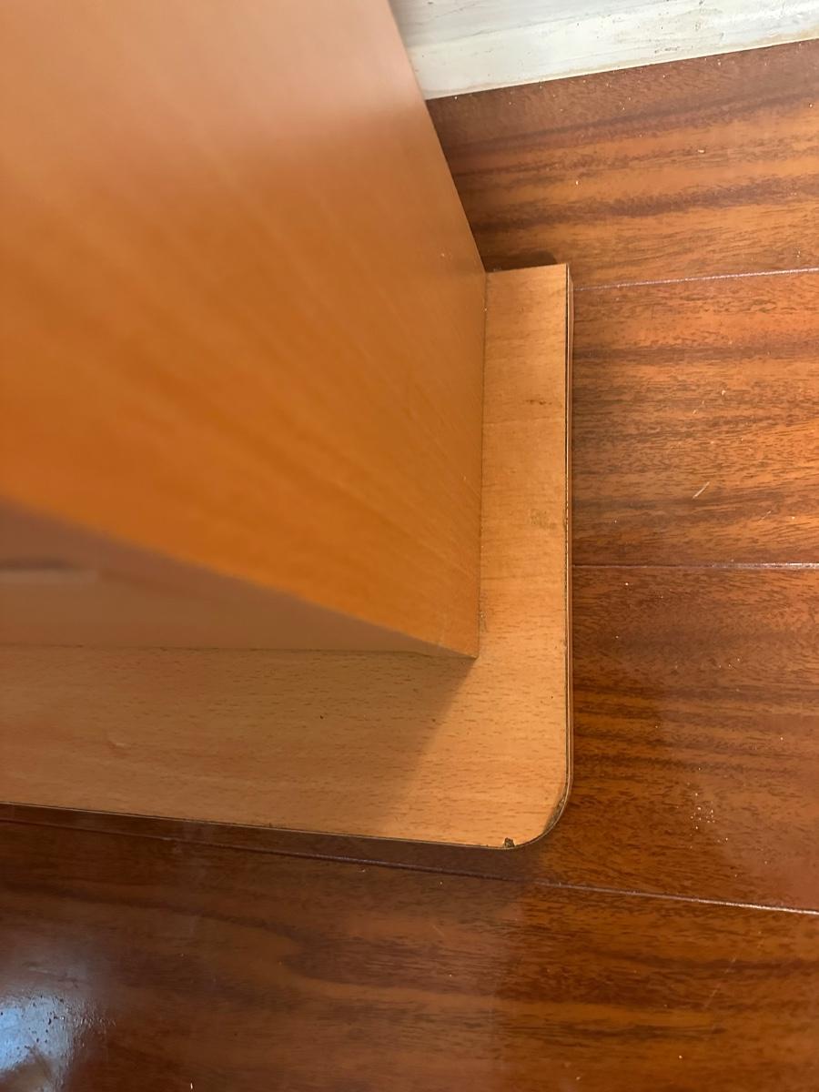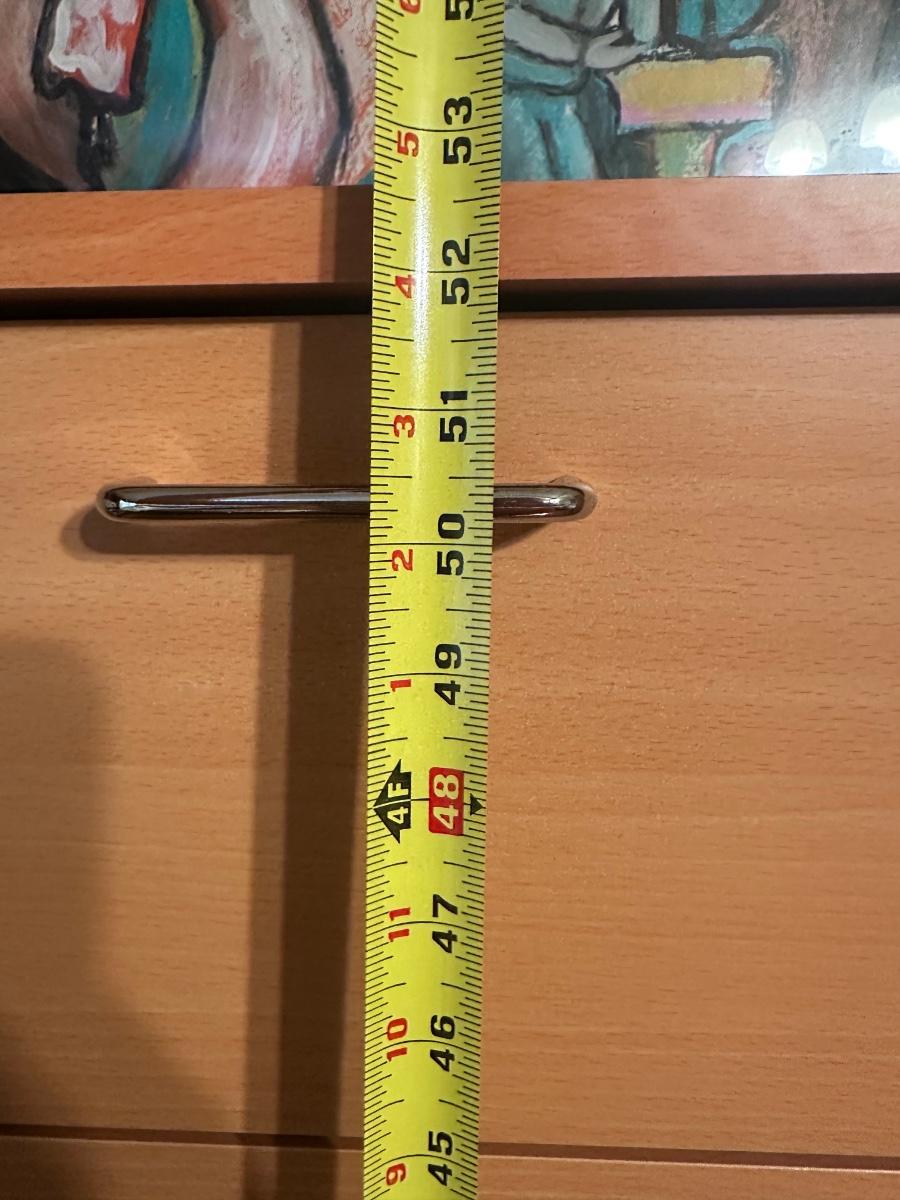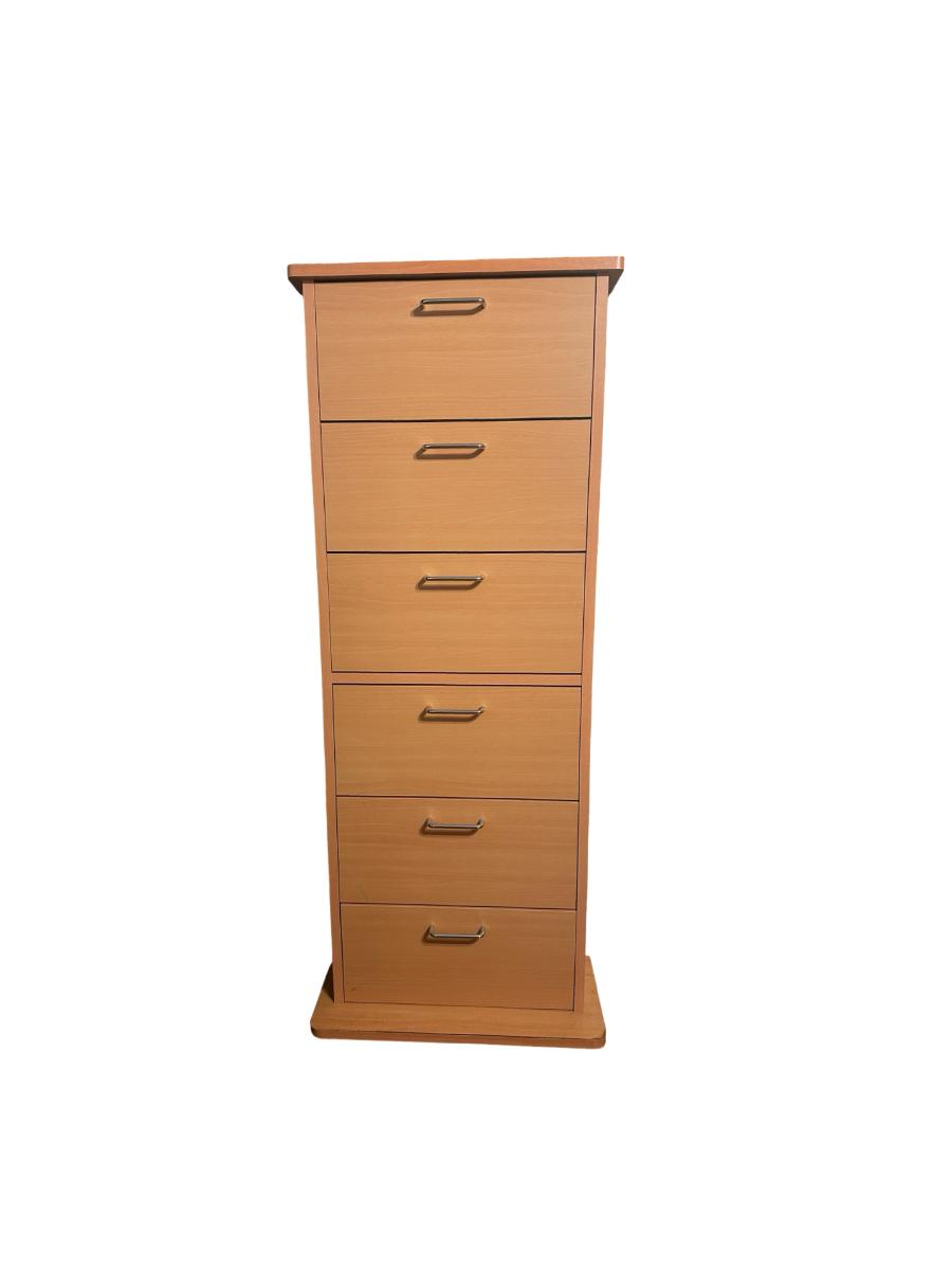Tall wood tilt-out storage cabinet with multiple drop-front compartments and metal handles. Light surface wear; see photos.