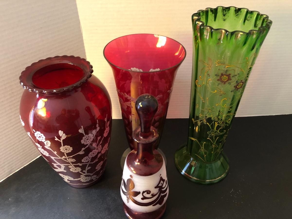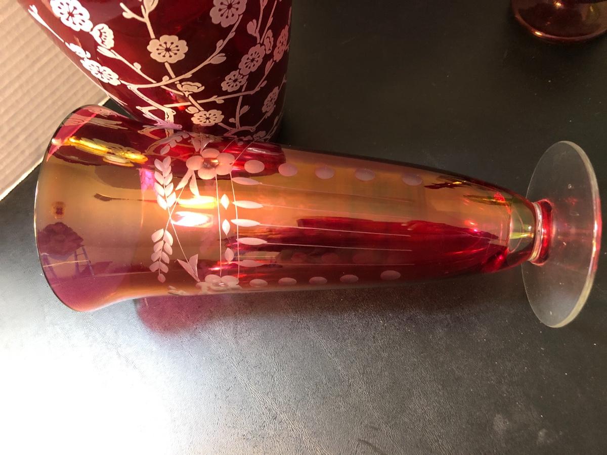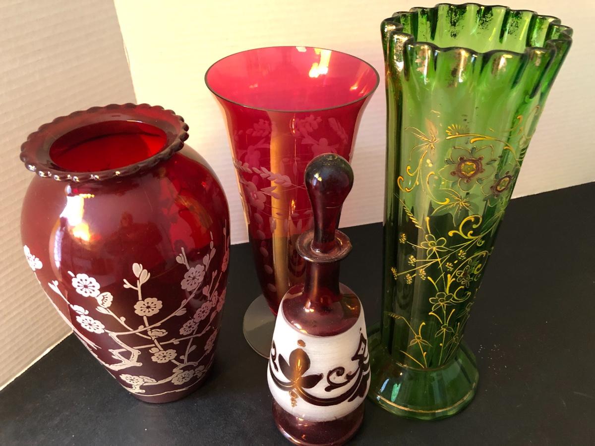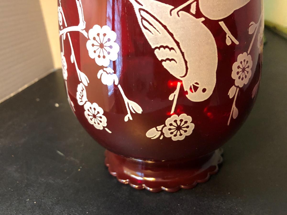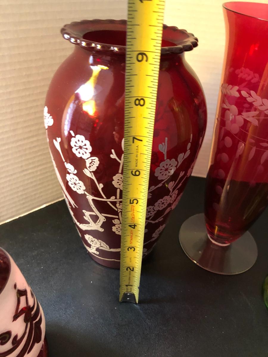 As always - NEVER A BUYER'S PREMIUM - NO CREDIT CARD FEES - All items start at $10 and are being auctioned with NO RESERVES to the high bidder. Tall Red Vase has chip around rim.