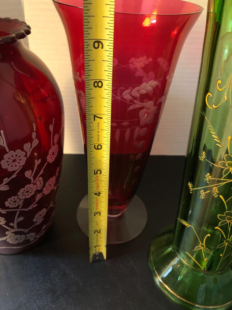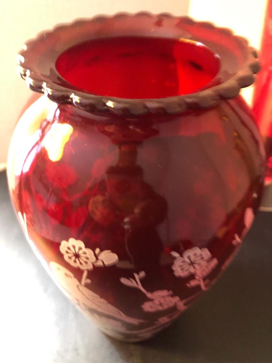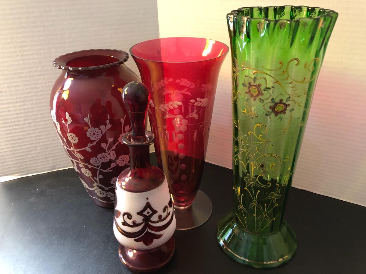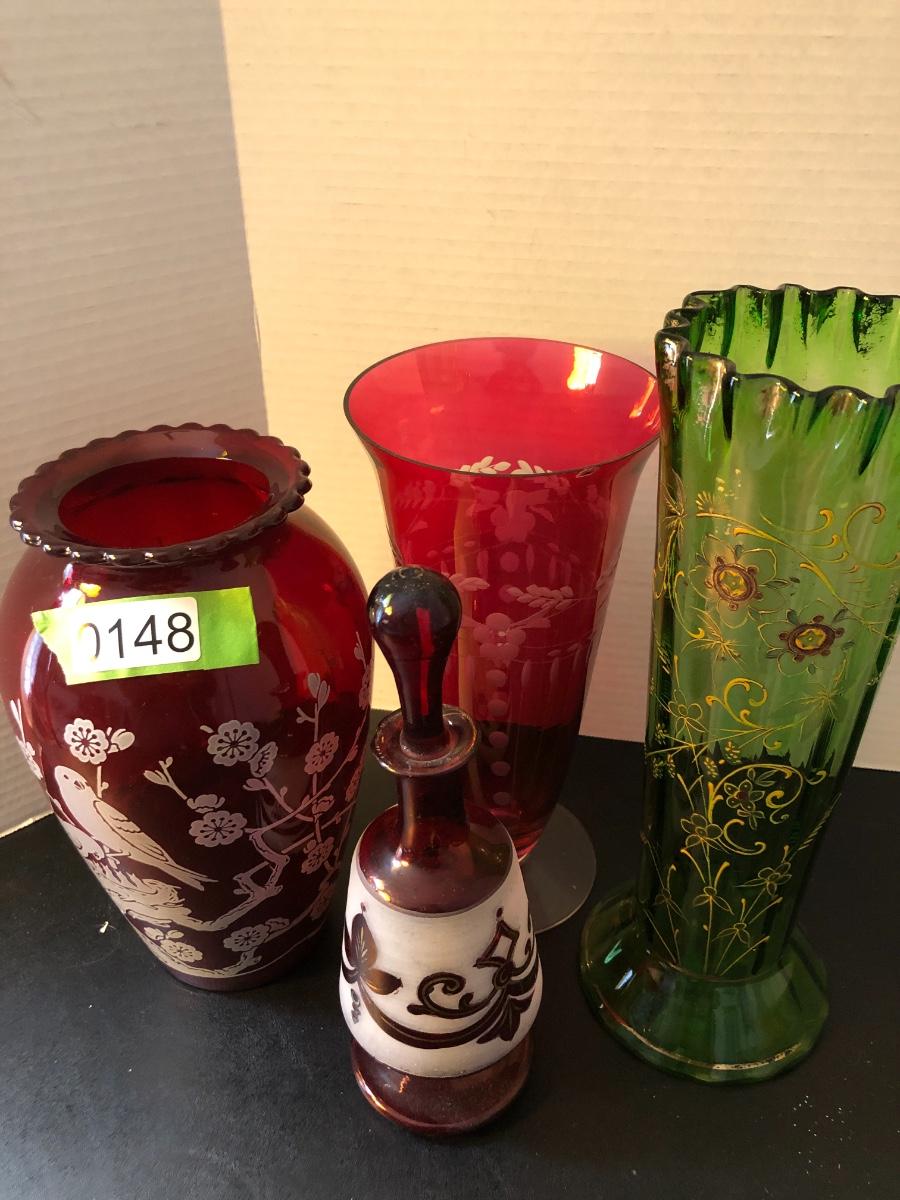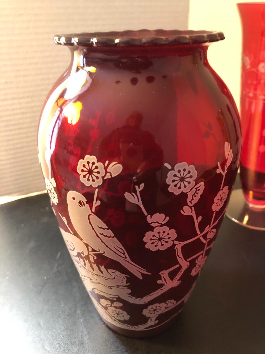 As always - NEVER A BUYER'S PREMIUM - NO CREDIT CARD FEES - All items start at $10 and are being auctioned with NO RESERVES to the high bidder. Tall Red Vase has chip around rim.