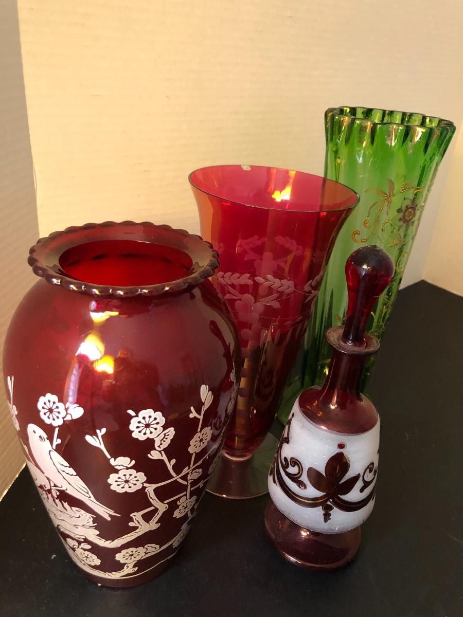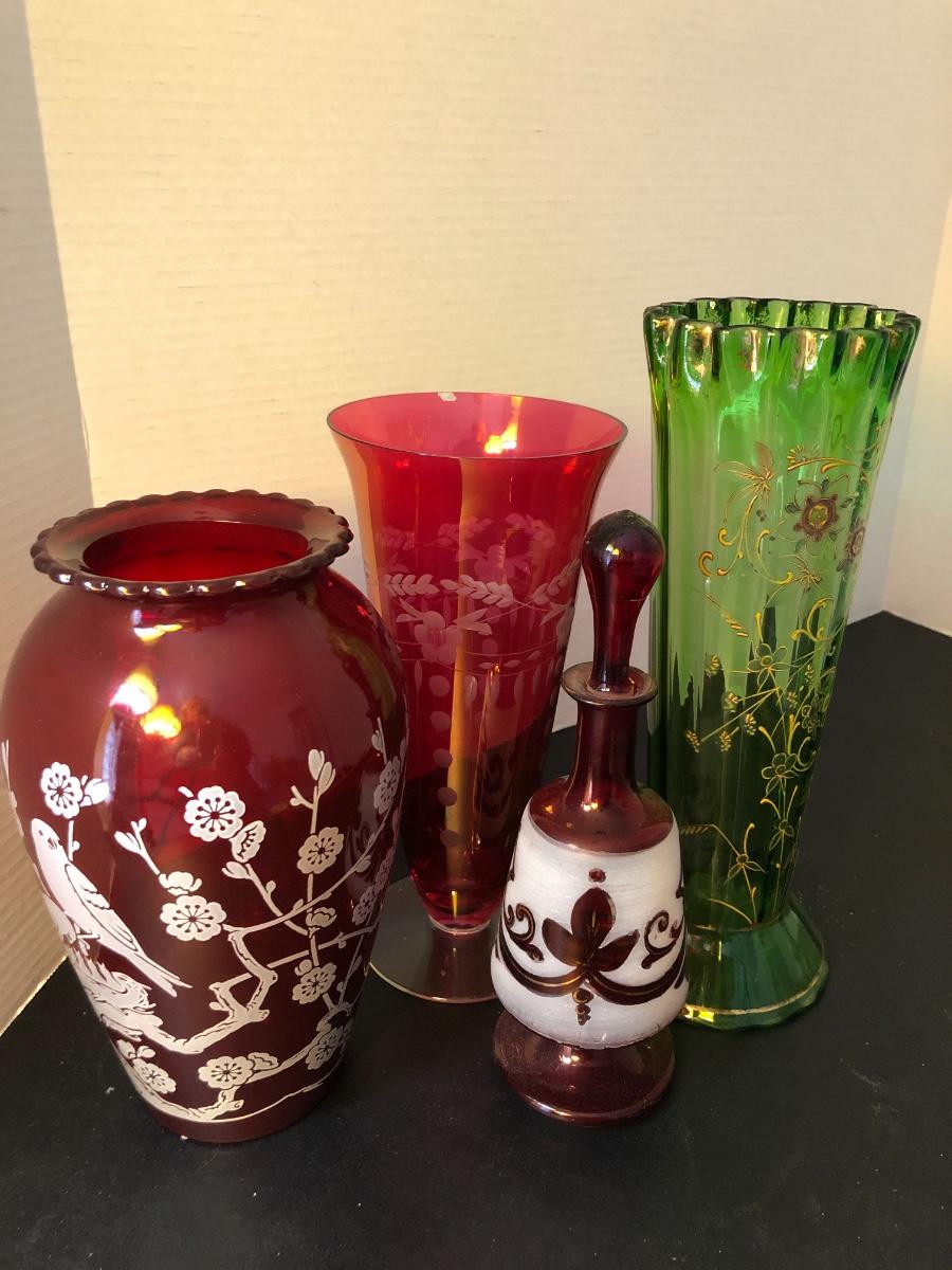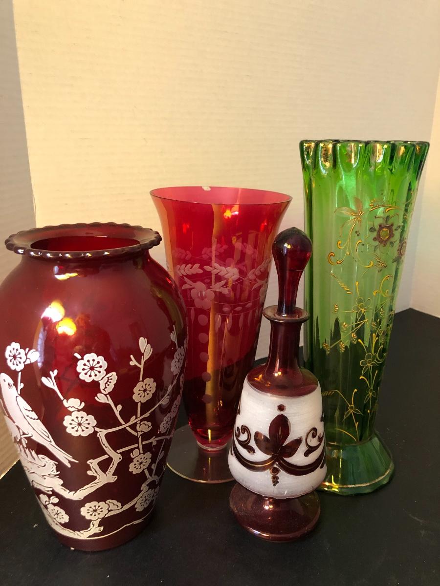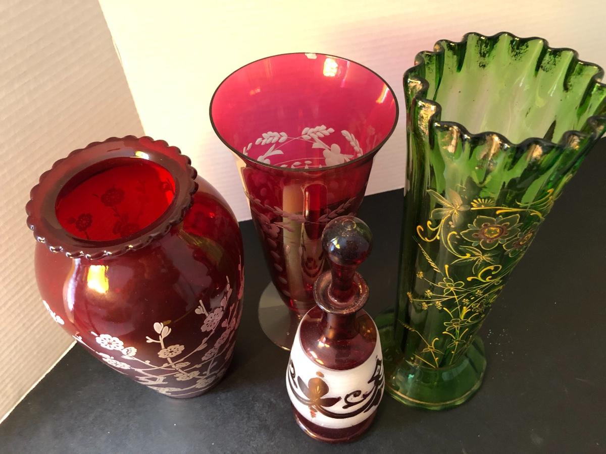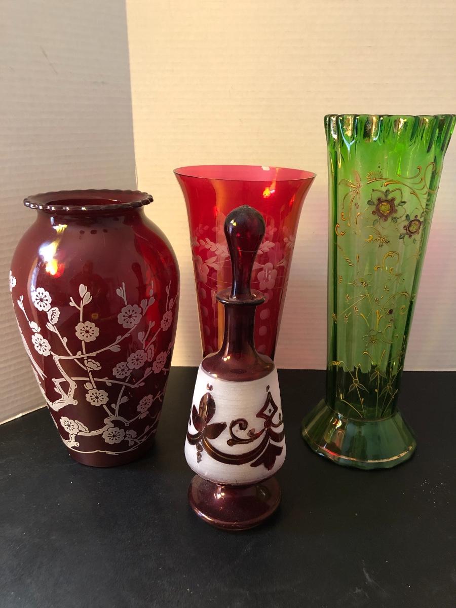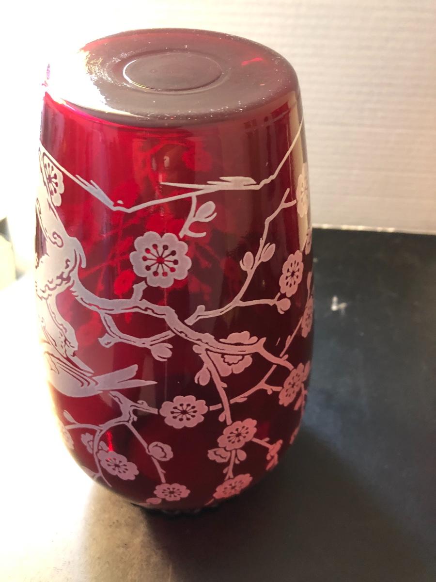 As always - NEVER A BUYER'S PREMIUM - NO CREDIT CARD FEES - All items start at $10 and are being auctioned with NO RESERVES to the high bidder. Tall Red Vase has chip around rim.