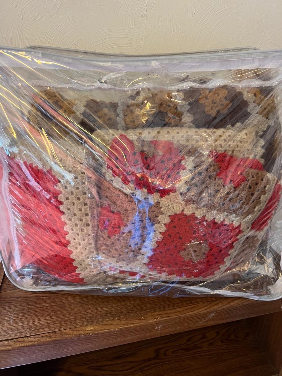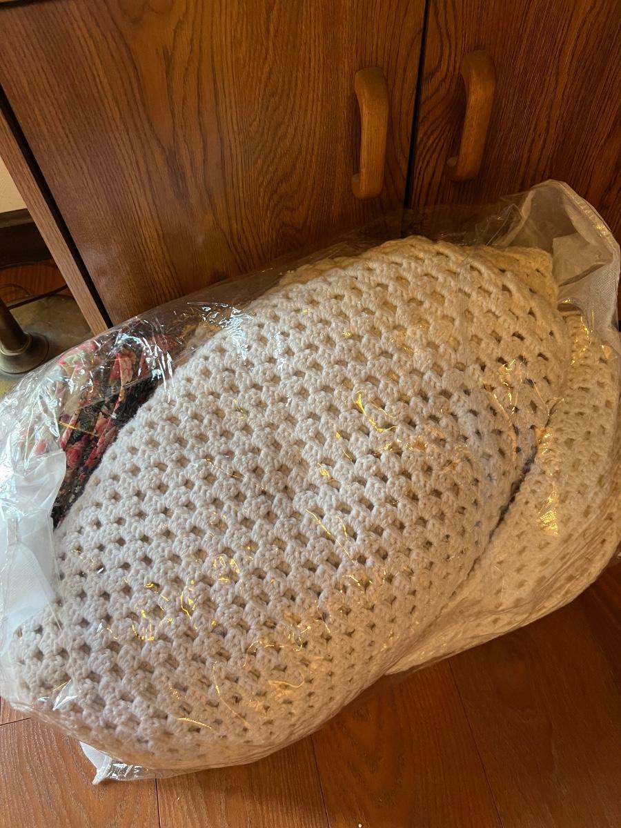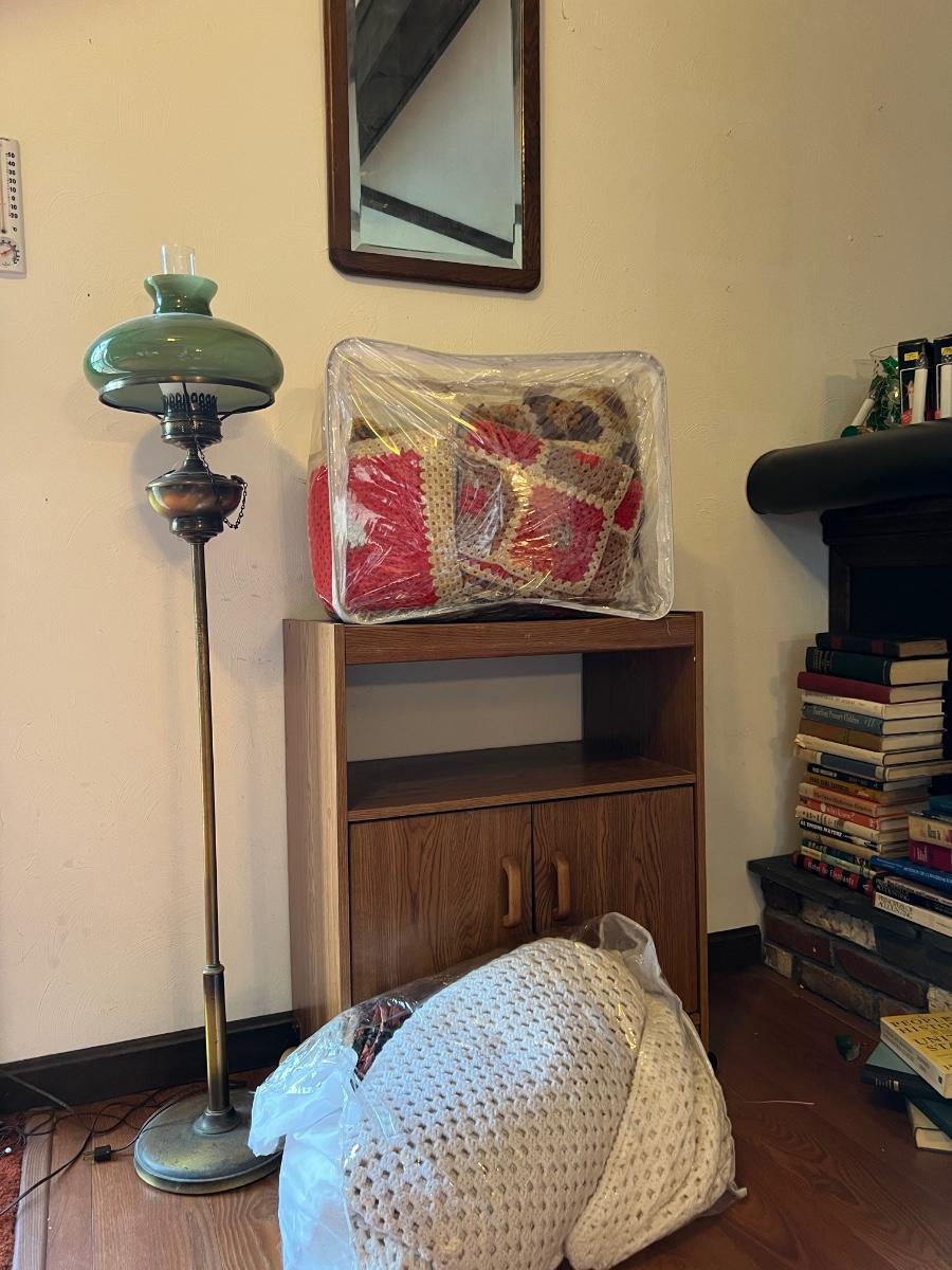 Lot includes lamp, cart, crocheted blankets/pillows, and mirror.