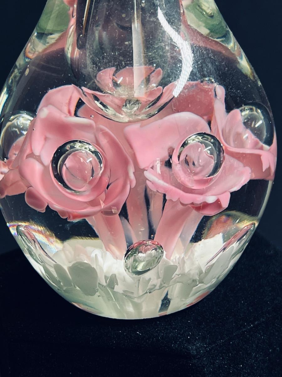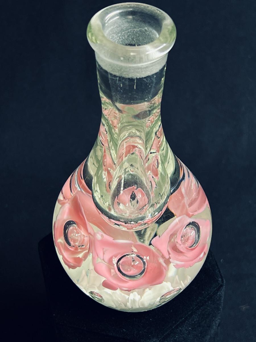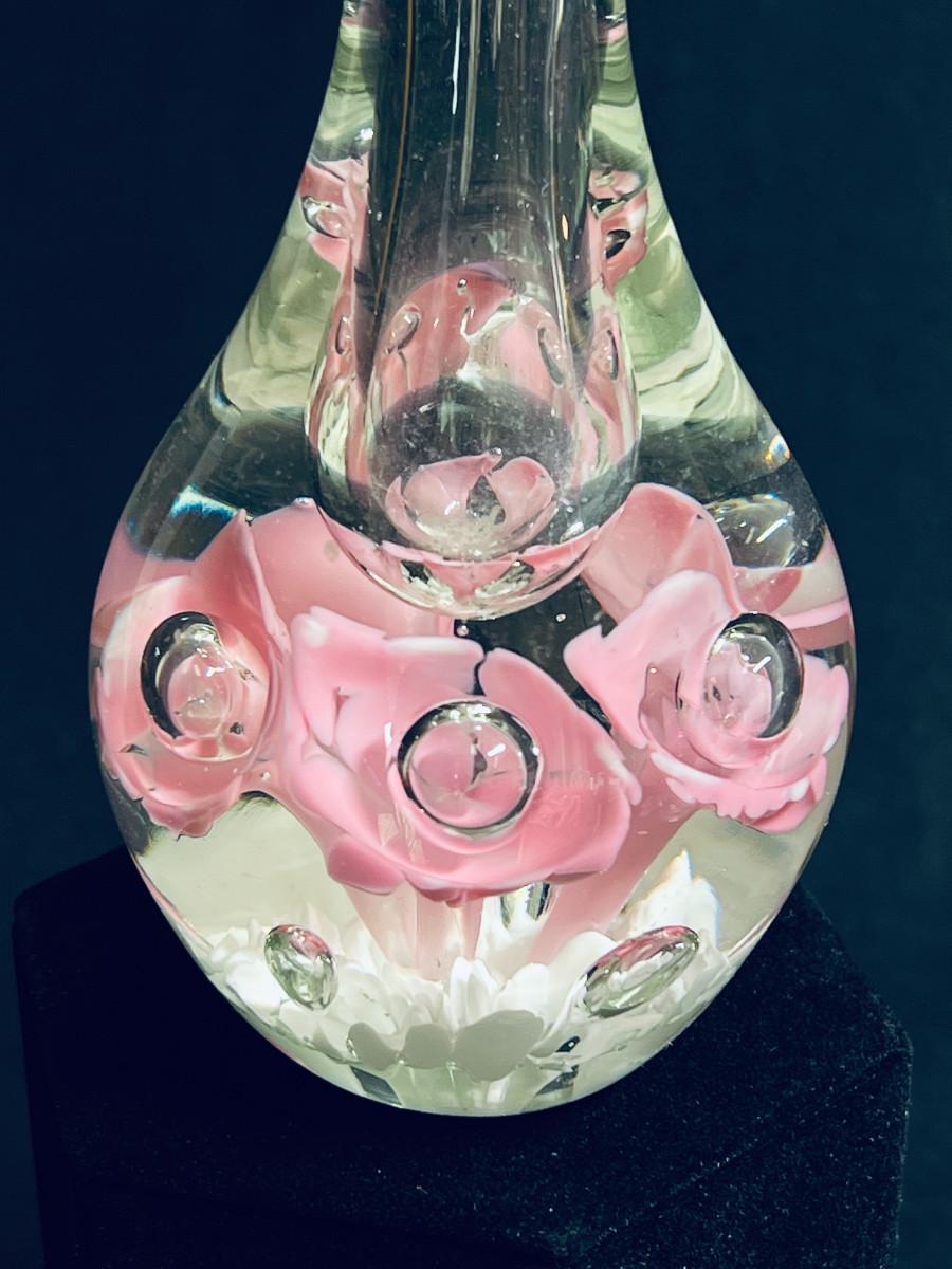 Beautiful stopper and bottle in hand blown clear glass with dark pink roses and white swirls