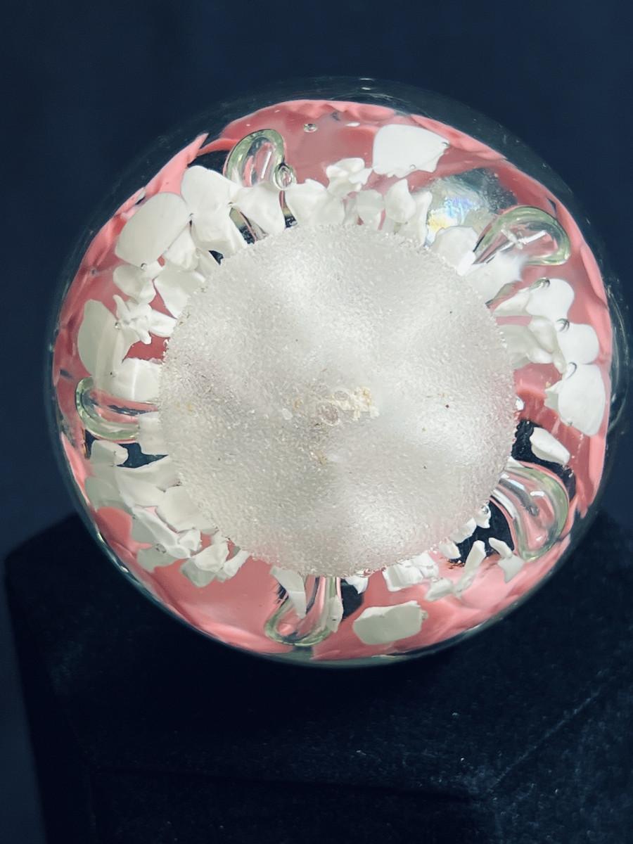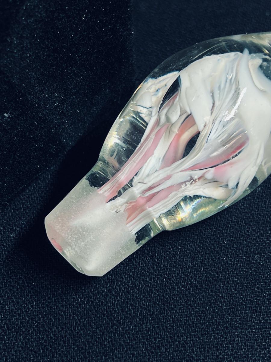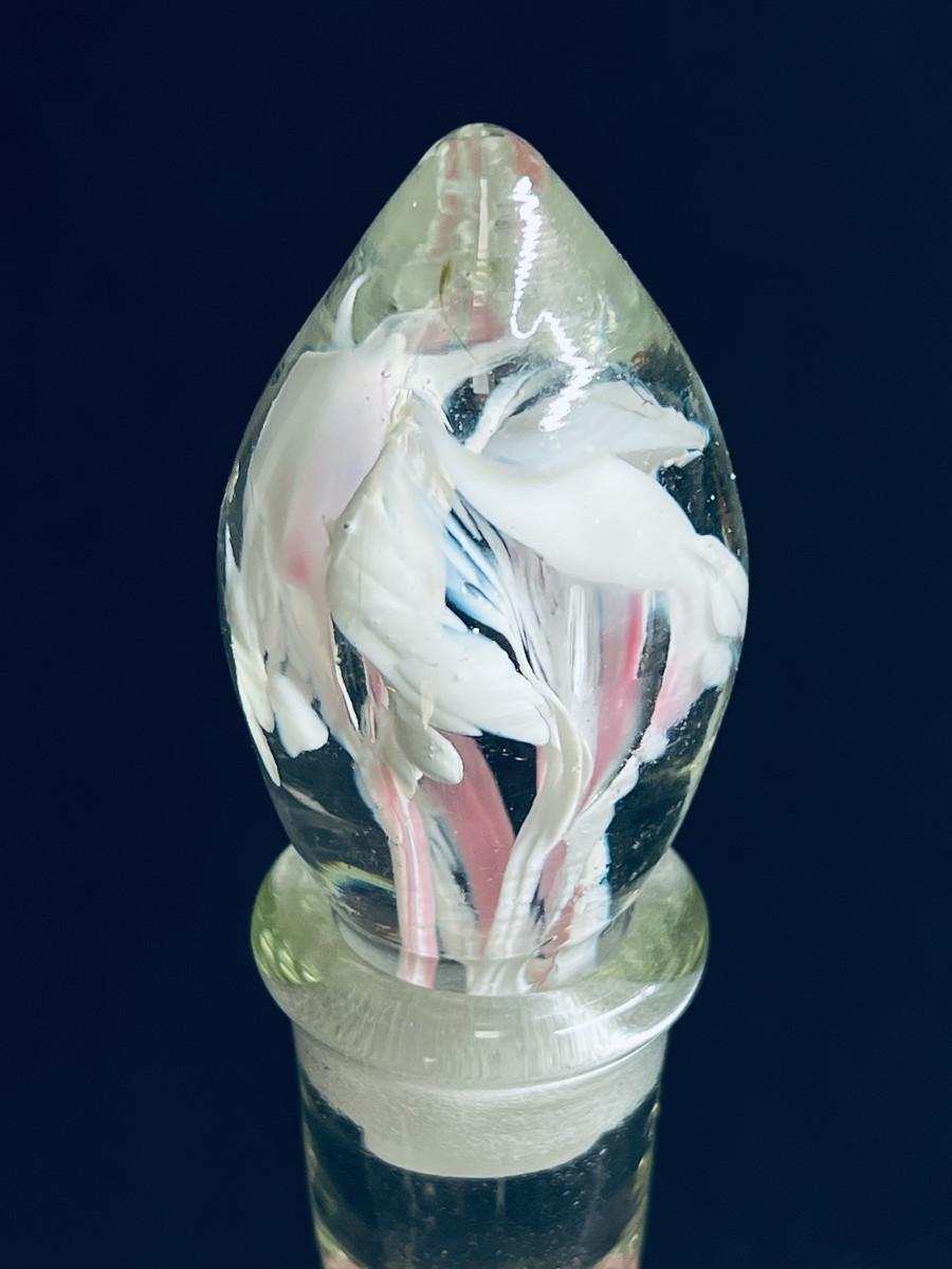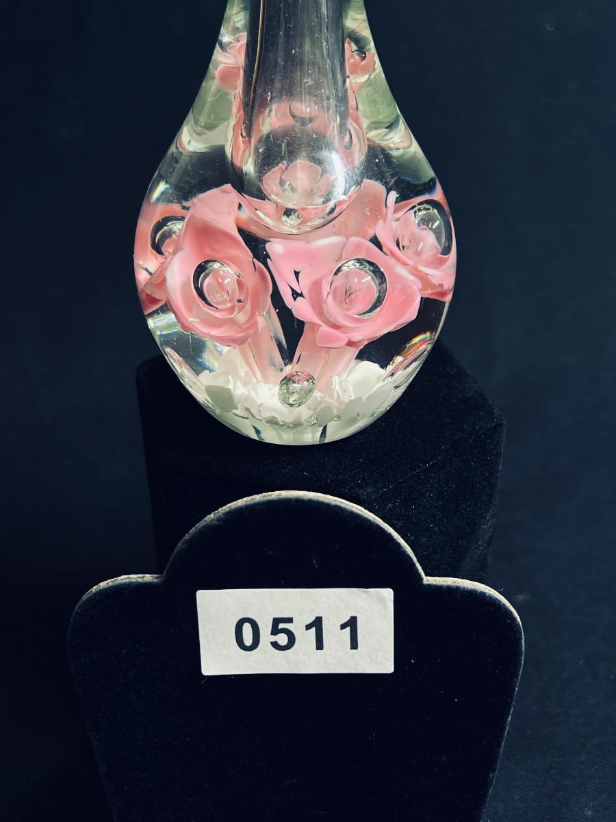 Beautiful stopper and bottle in hand blown clear glass with dark pink roses and white swirls