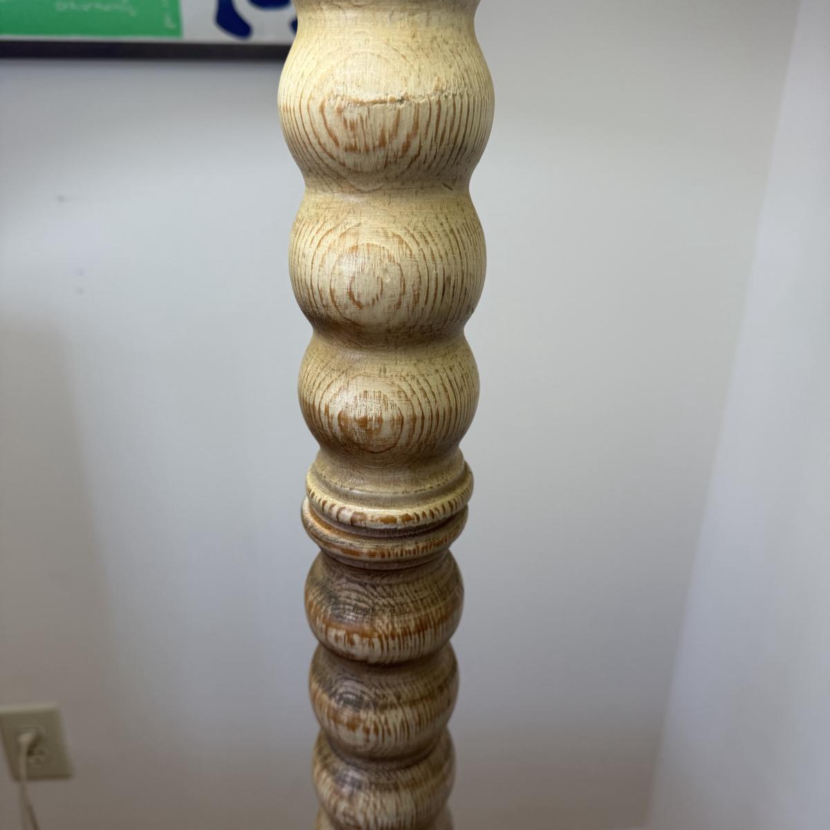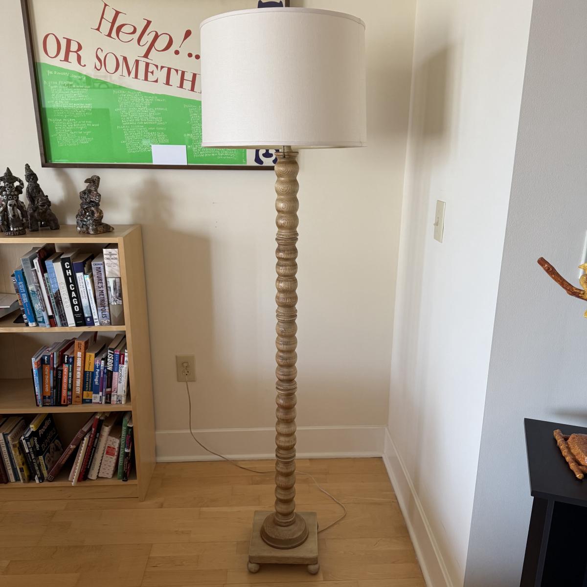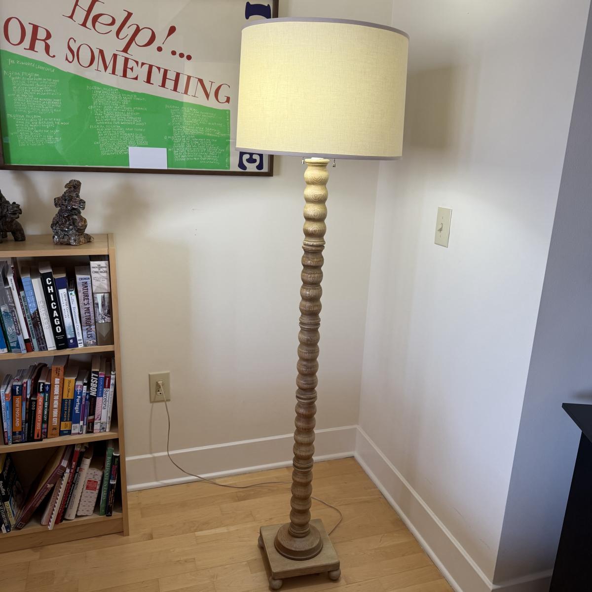 This lot contains a fun, earthy wooden floor lamp. This lamp measures 9” x 9” at the base and stands 66”H. The lamp itself holds two light bulbs and each bulb has a pull string switch and is a one way switch. The shade is a modern large circle and suits it very well. Both light bulb sockets powered on. See pictures for details. Local pick up only.