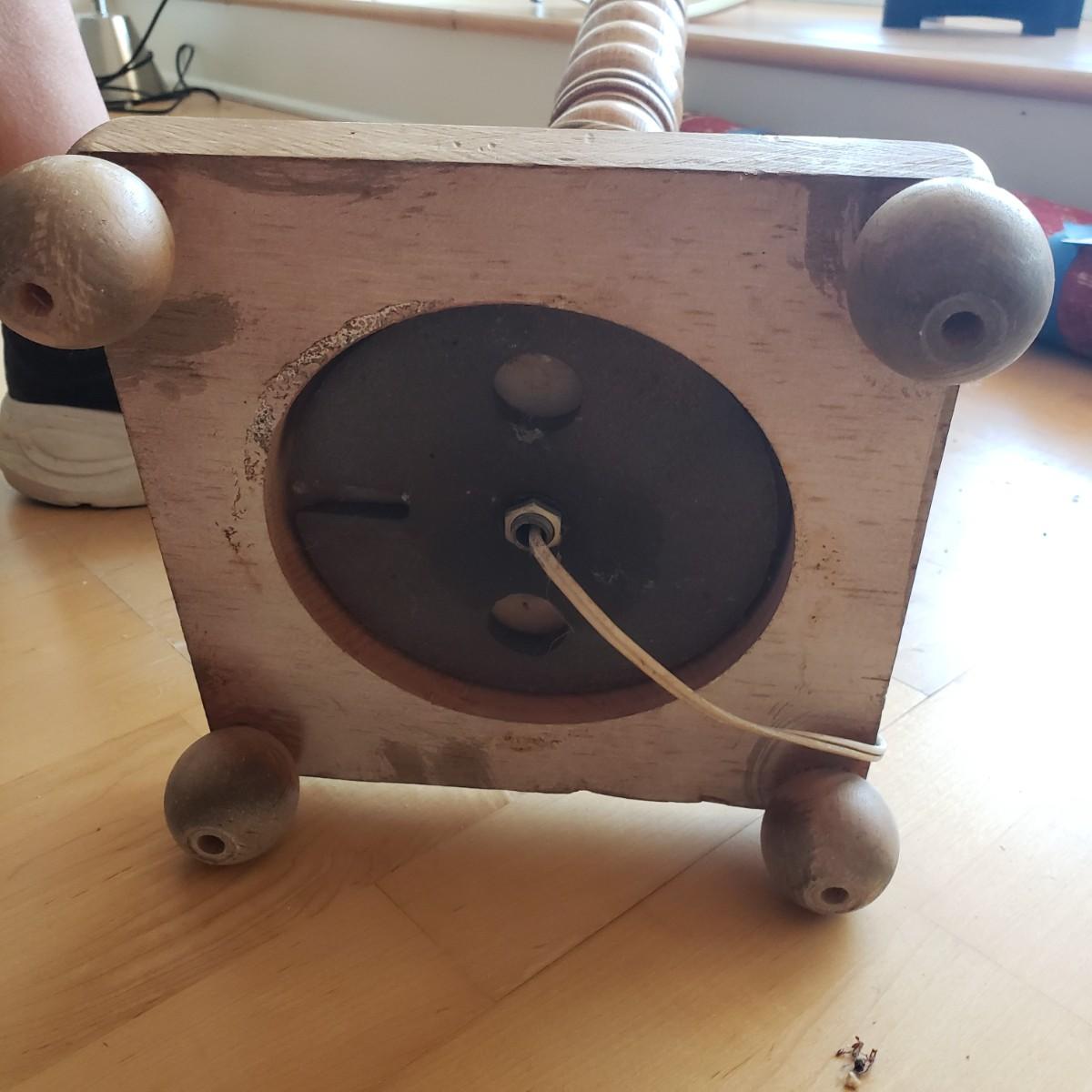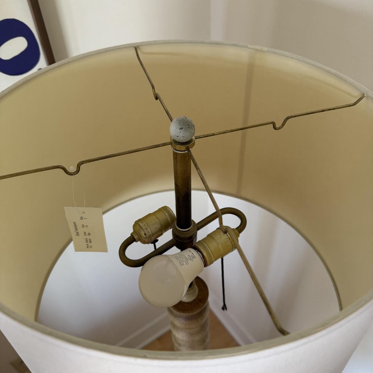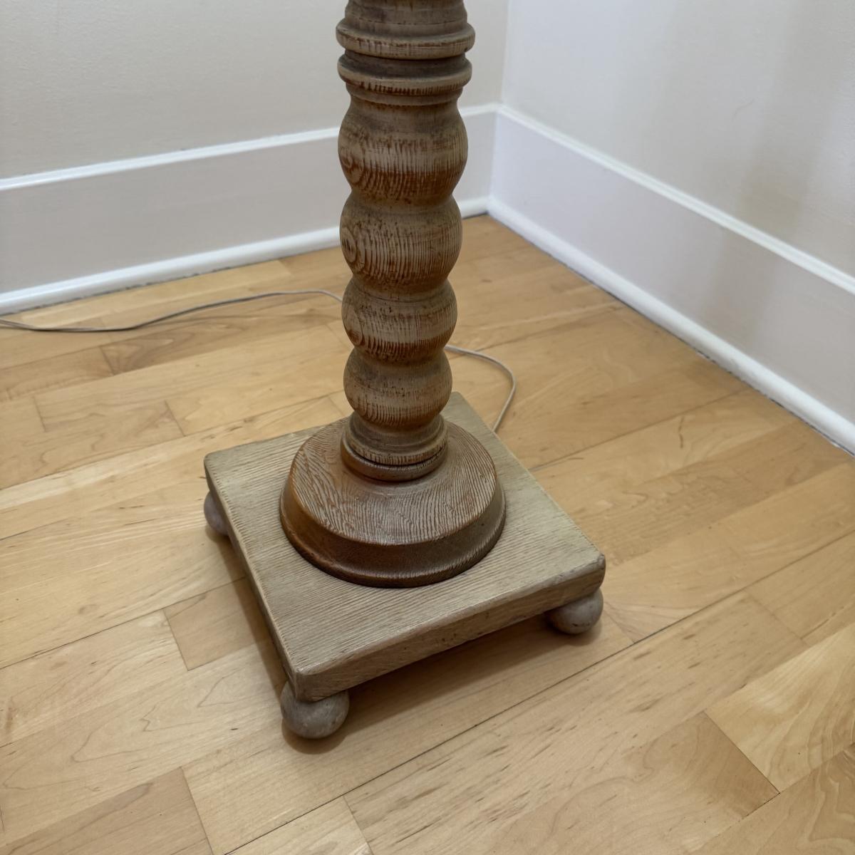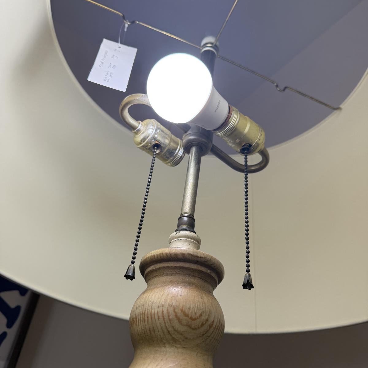 This lot contains a fun, earthy wooden floor lamp. This lamp measures 9” x 9” at the base and stands 66”H. The lamp itself holds two light bulbs and each bulb has a pull string switch and is a one way switch. The shade is a modern large circle and suits it very well. Both light bulb sockets powered on. See pictures for details. Local pick up only.