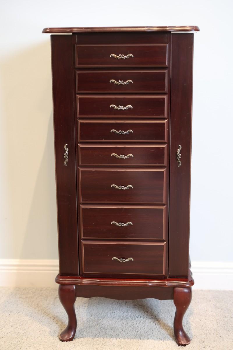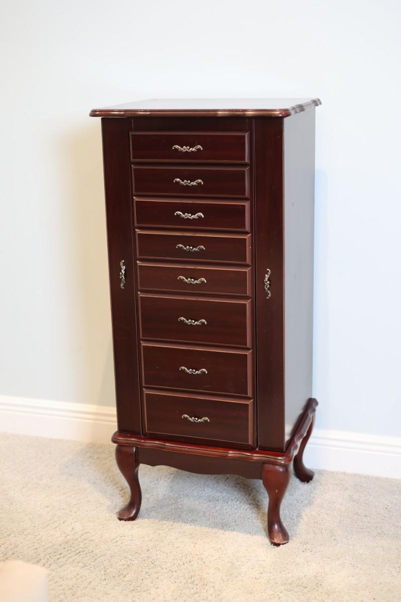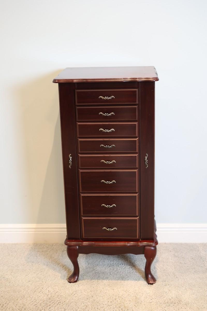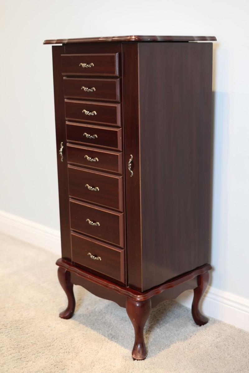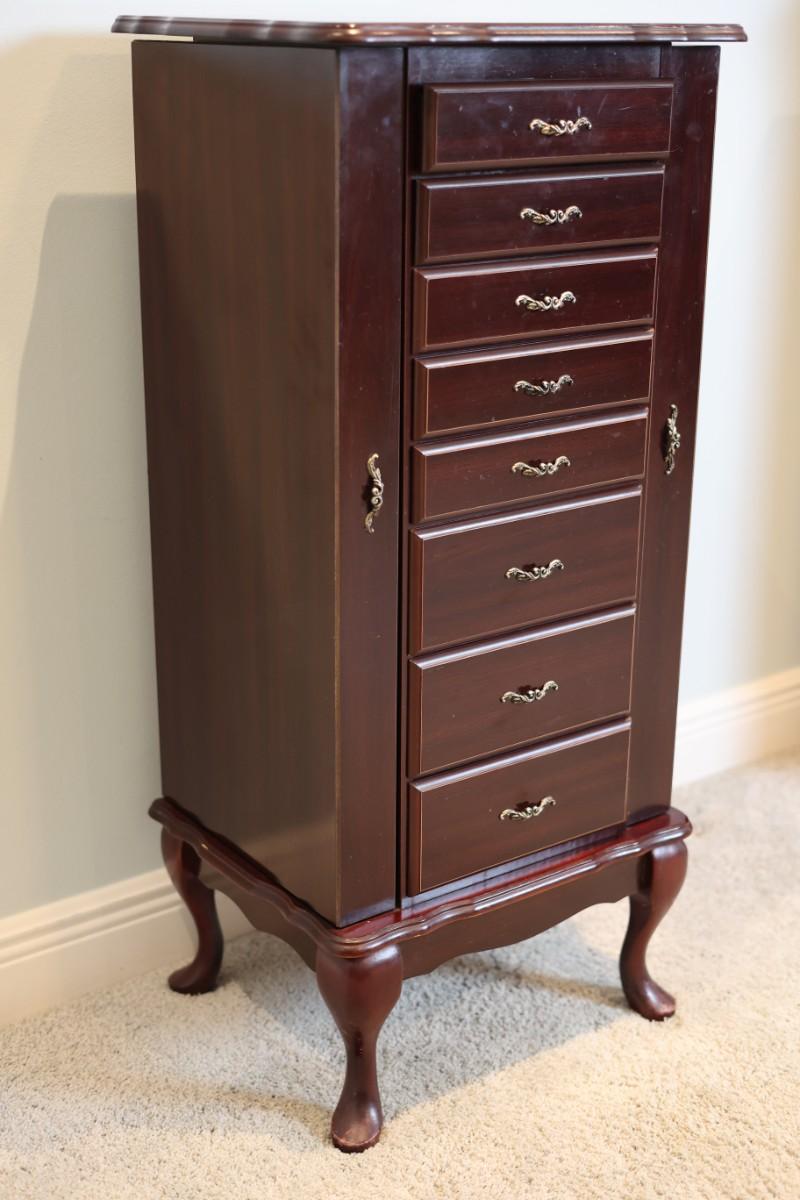 Tall wooden jewelry armoire with multiple front drawers and side doors for storage. Stands on curved legs. Light wear consistent with normal use. Buyers encouraged to review photos for condition.