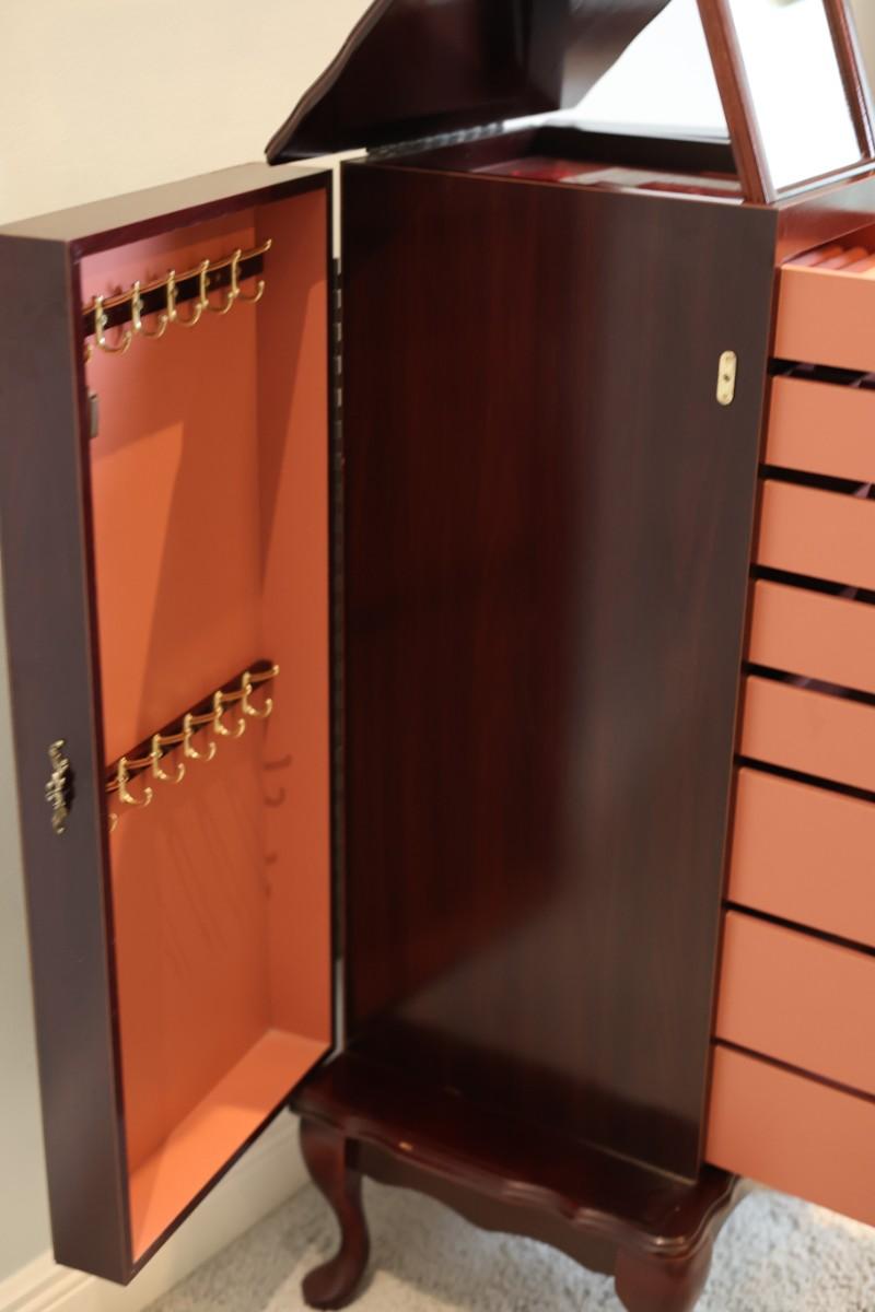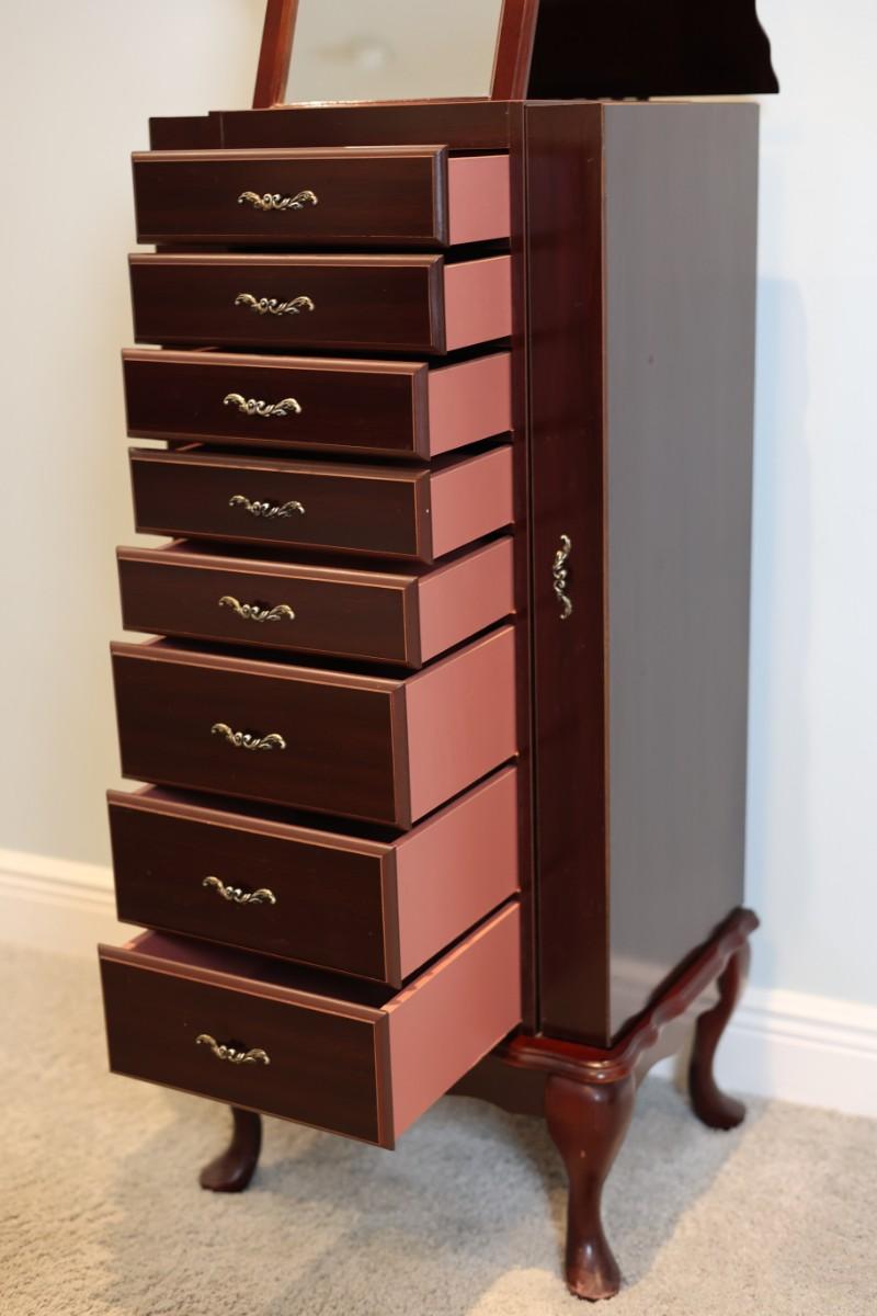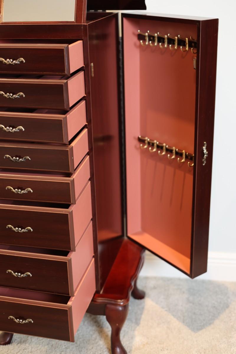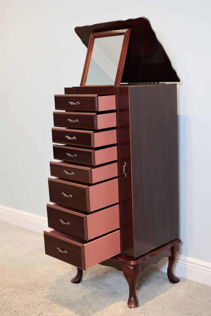 Tall wooden jewelry armoire with multiple front drawers and side doors for storage. Stands on curved legs. Light wear consistent with normal use. Buyers encouraged to review photos for condition.