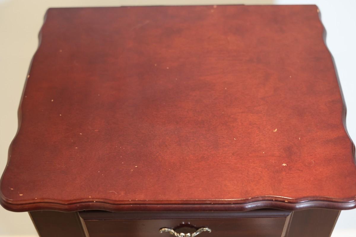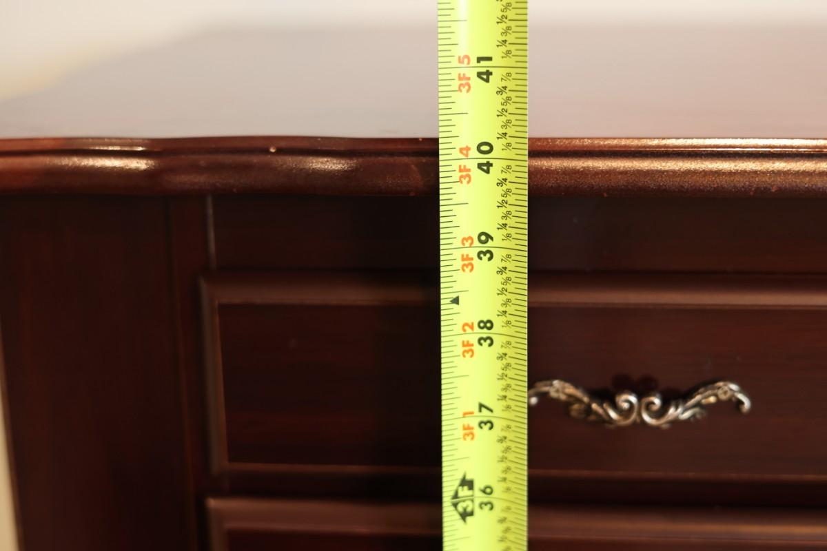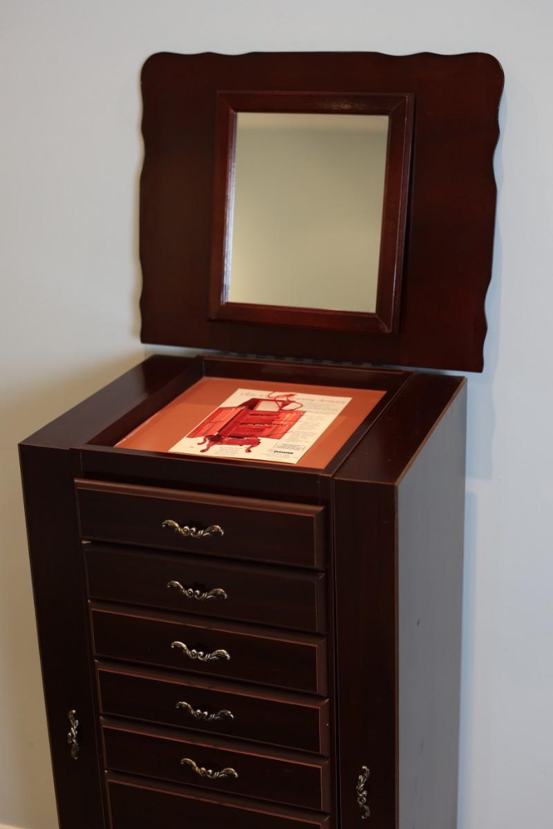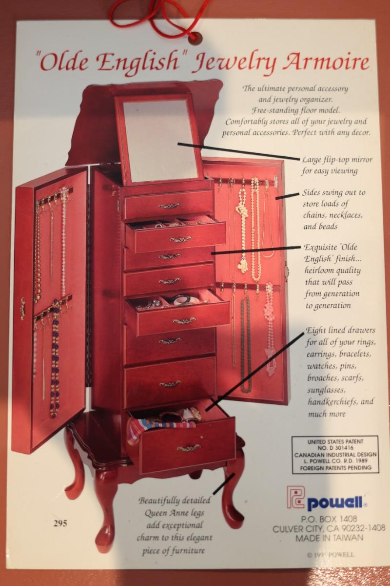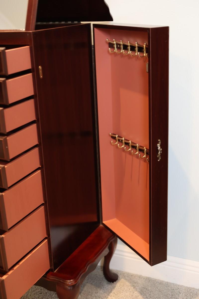 Tall wooden jewelry armoire with multiple front drawers and side doors for storage. Stands on curved legs. Light wear consistent with normal use. Buyers encouraged to review photos for condition.