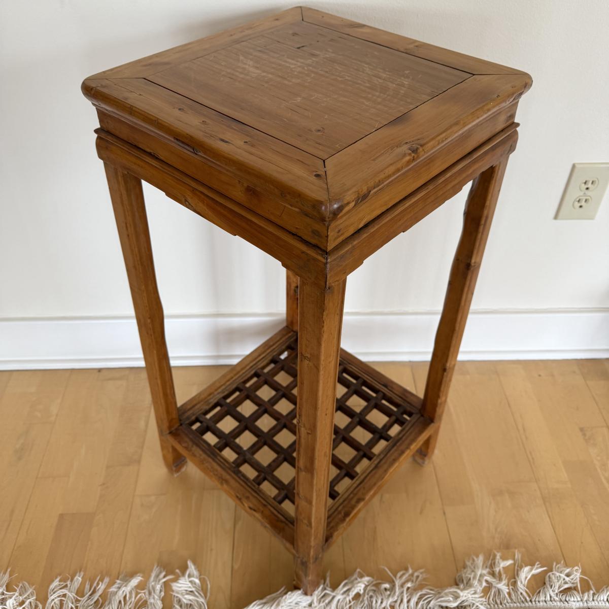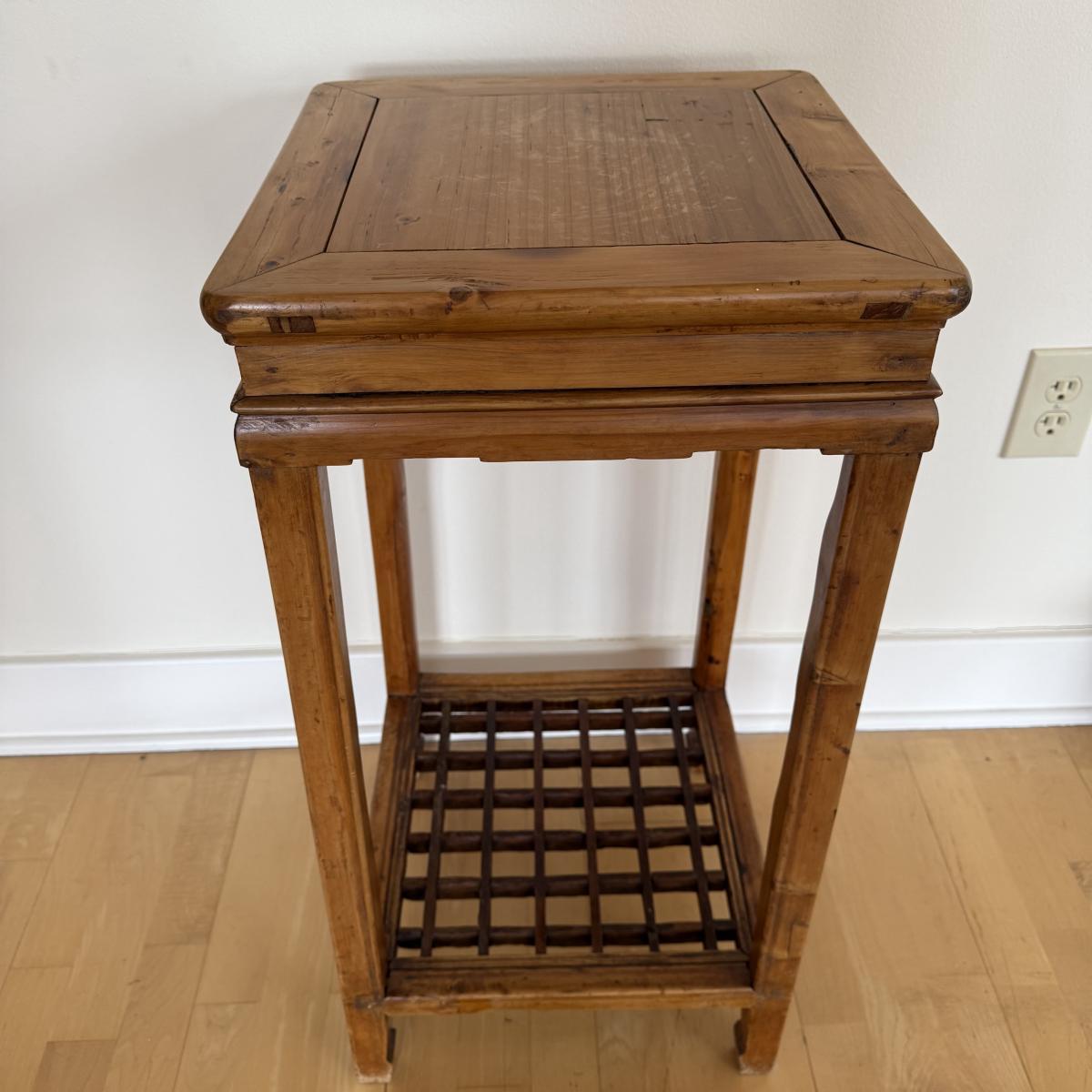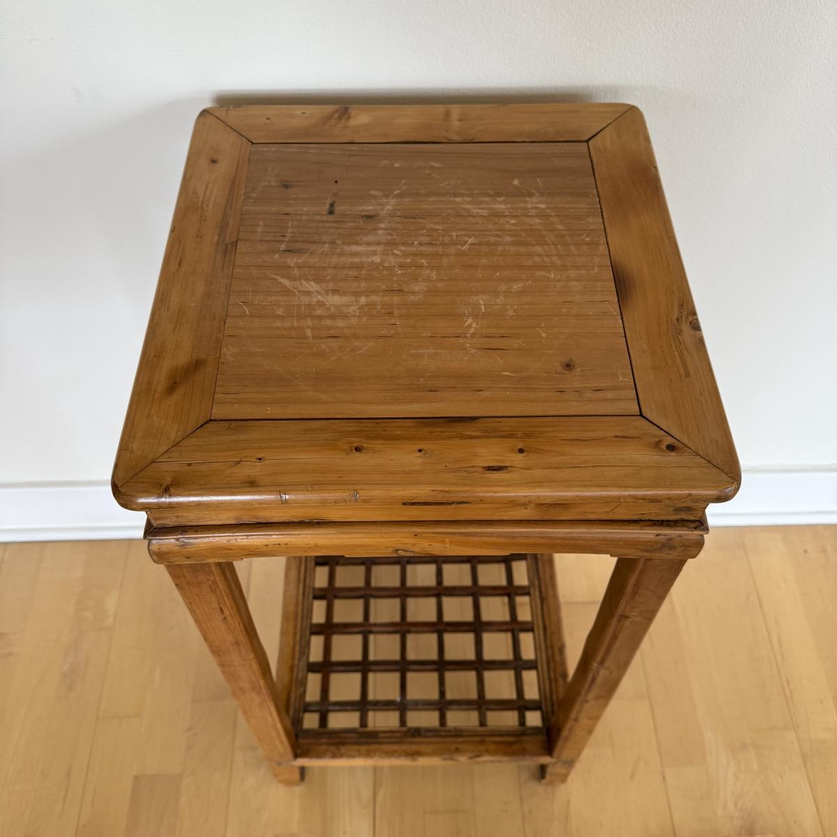 This lot contains a tall wooden square table with a checkered bottom tier. This item measures 14.25” x 14.25” x 30.5”H. There are some small scuffs on the center surface, see pictures for details. Local pick up only.