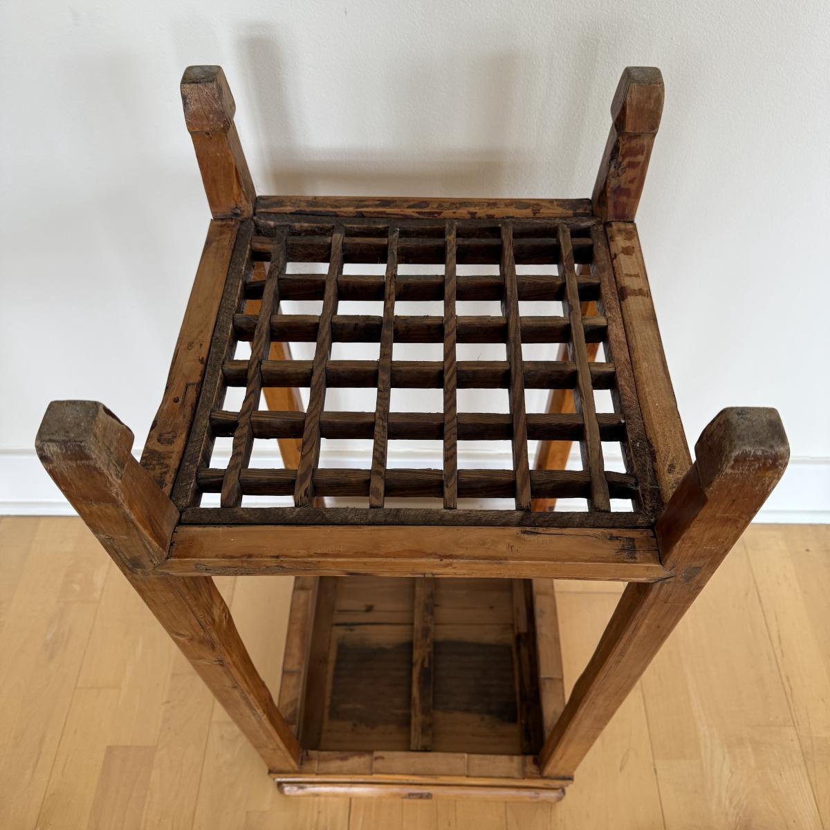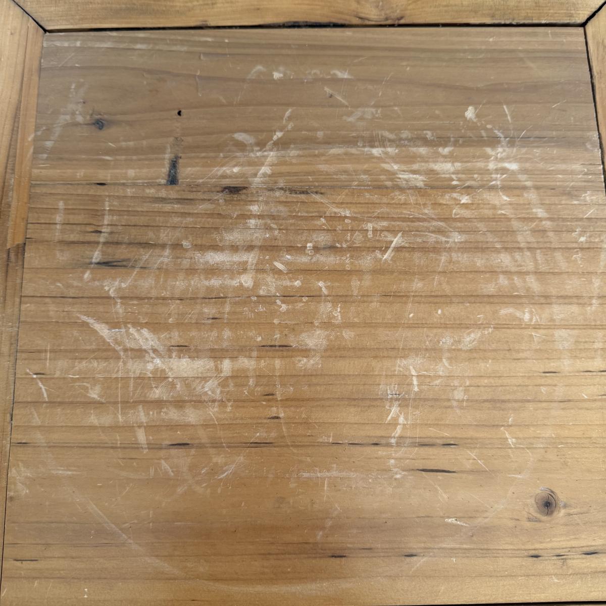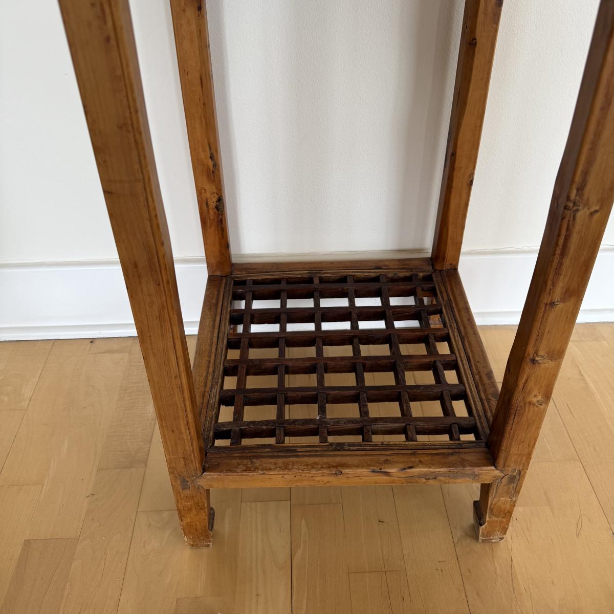 This lot contains a tall wooden square table with a checkered bottom tier. This item measures 14.25” x 14.25” x 30.5”H. There are some small scuffs on the center surface, see pictures for details. Local pick up only.