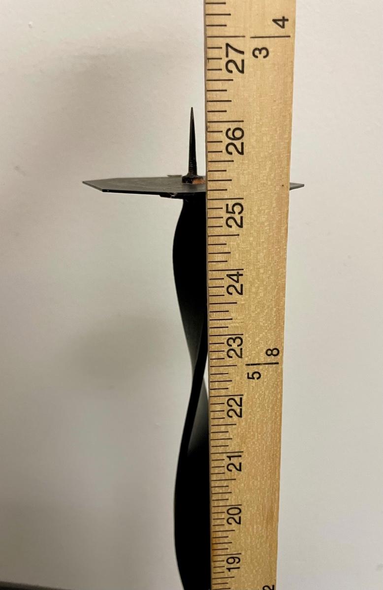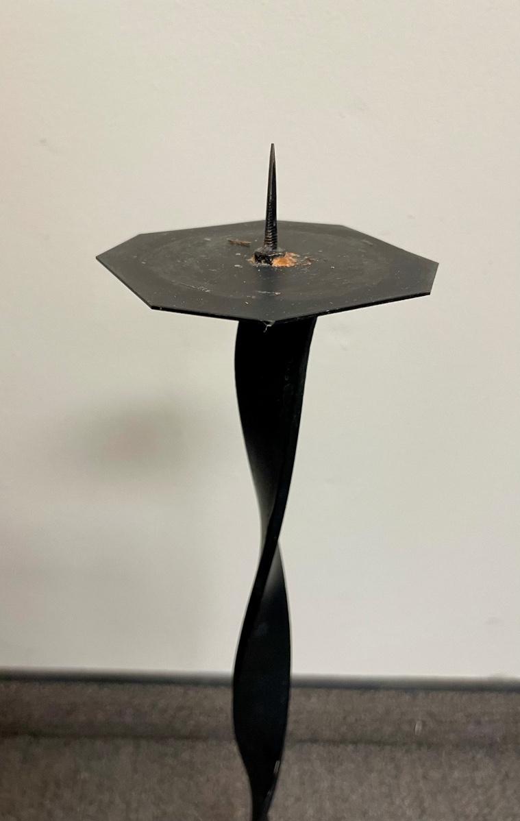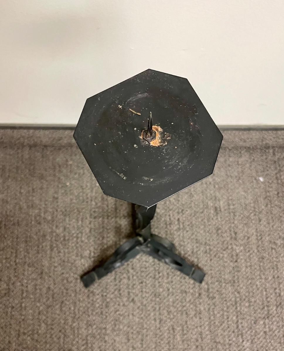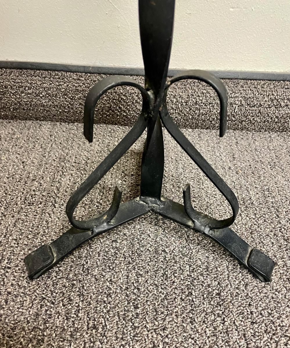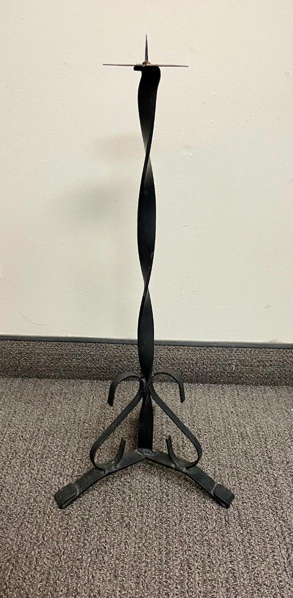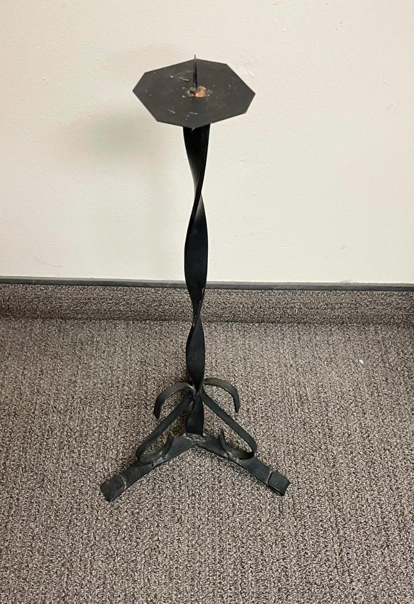Wrought iron candle holder with tripod base. Stands approx. 25” tall. See photos for style details.