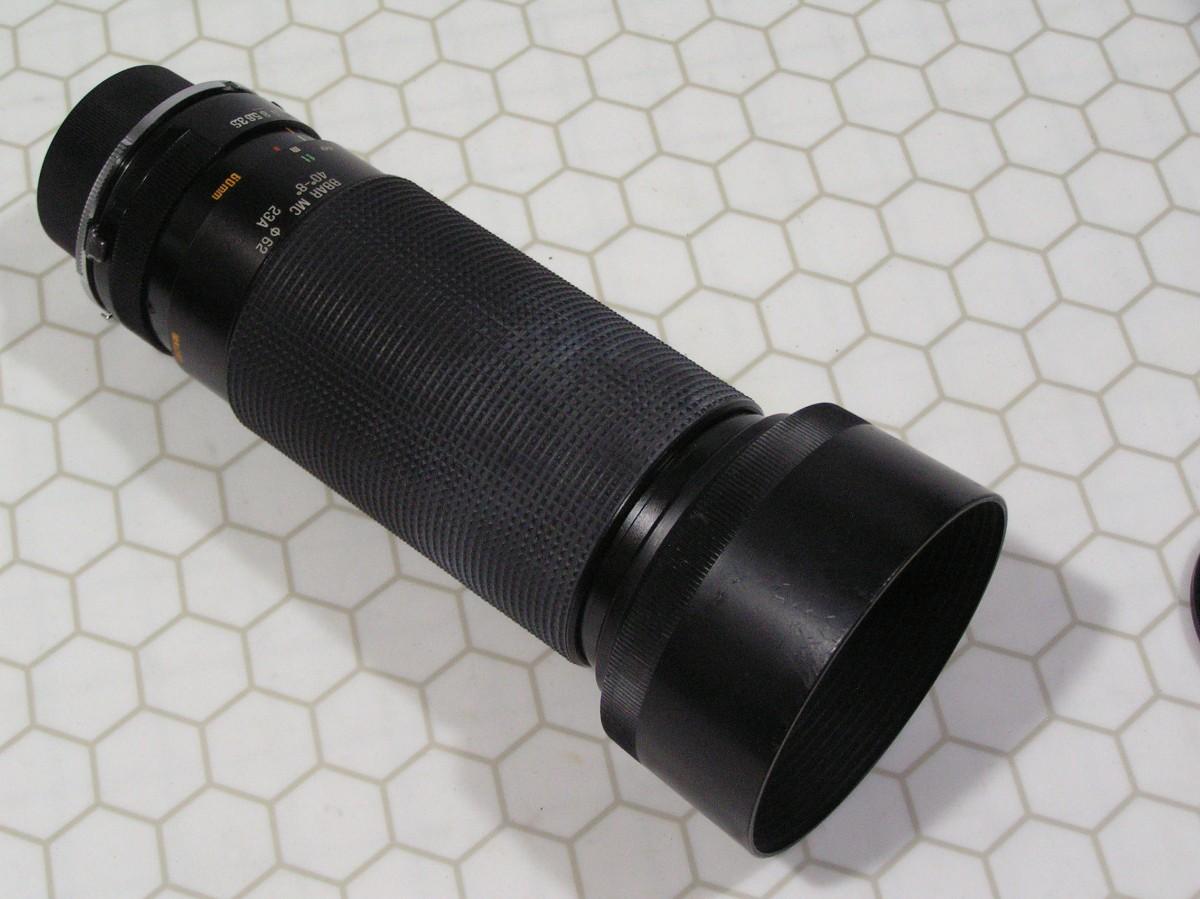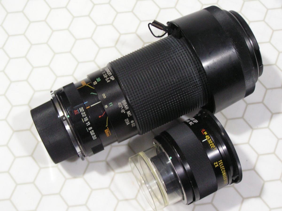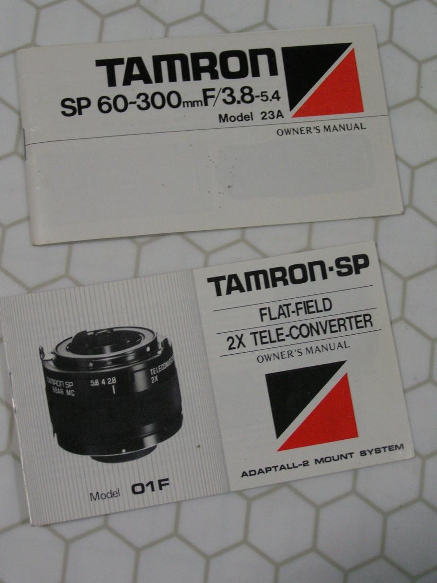Sell as a lot. Tamron Super-Tele 2 lens system to 600mm. Tamron SP 60-300mm MF zoom lens (35mm) f:3.8-5.4(32) (PN:23A) AND Tamron SP 2X Flat Field tele-converter (PN:01F), both w/ AdaptAll mount system. Combined total focal length range end to end is 60-600mm. Main zoom lens can be used with or without the tele-converter and currently has a Nikon AI-S mount. AI-S lenses work on today's better Nikon digital cameras in manual mode and aperture priority AE. NOTE: the patented AdaptAll mount can be changed to fit a long list of other cameras. This versatile lens system is outstanding for wildlife and outdoor sports photography with it's extended zoom range. Plus macro mode with almost life size 1:1.55. at 11.8”. AND FAST one-touch manual zoom-focus system with depth-of-field scales on the barrel. The 2X tele-converter mounts directly to the lens between the mount and lens so both lenses are transferable to other cameras too. Both lenses have BBAR MC multi-coated lens elements. Both have clean clear glass, NO scratches, NO fog, NO fungus. Includes both owner manuals, front & rear lens caps, OEM “flip-to-store” lens shade, Tiffen UV Haze clear protective lens filter, 2 OEM hard shell carry cases w/straps. PLUS BONUS Tiffen sunny days filter pack including: 1 Polarizer, 1 Sky-1A, 1 ND-0.3 & 1 metal filter pack protective cap set. Lenses made in Japan. Excellent++ condition. Both tested and working perfectly. SNs:557641 & 814503