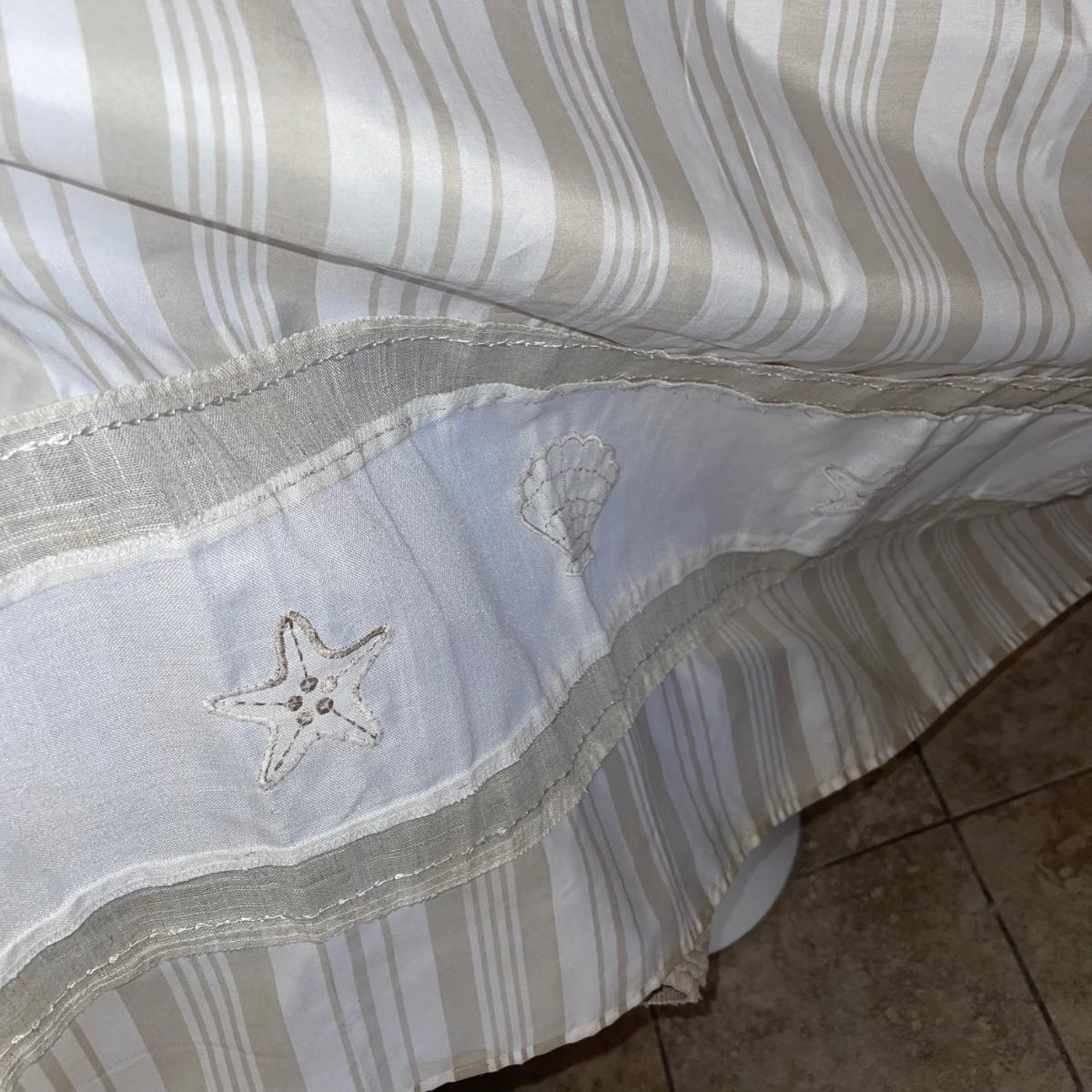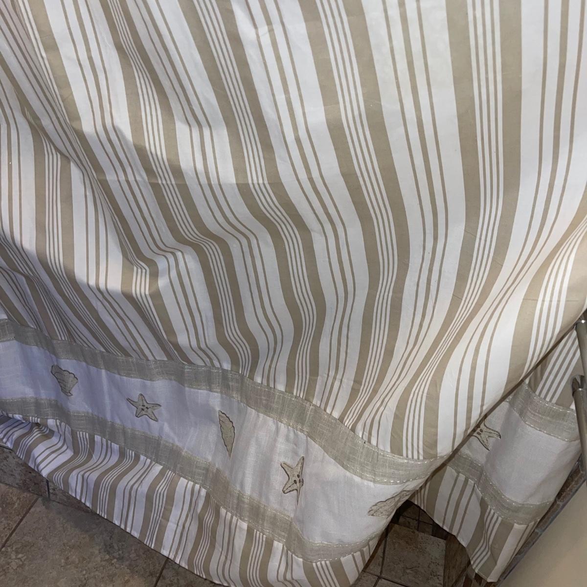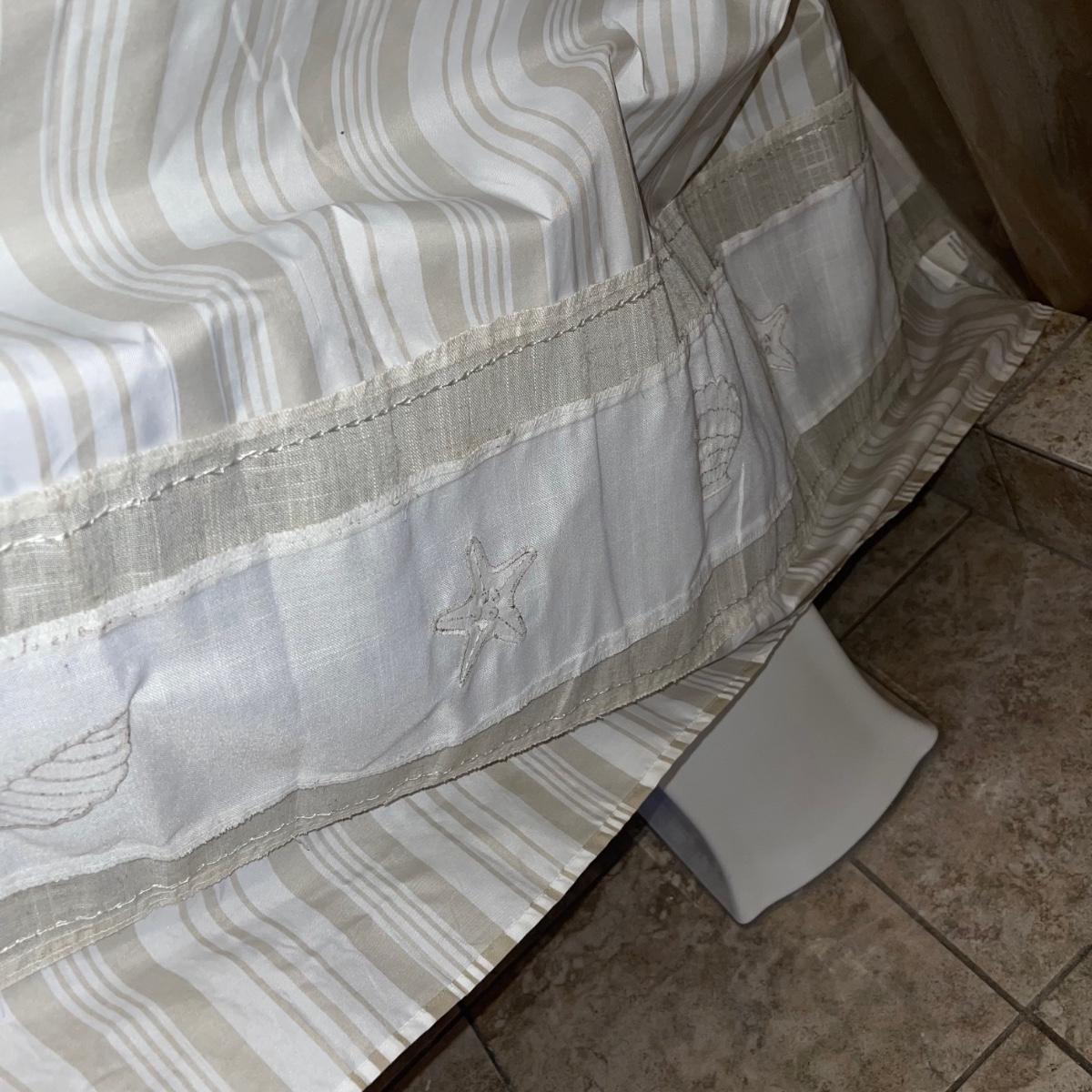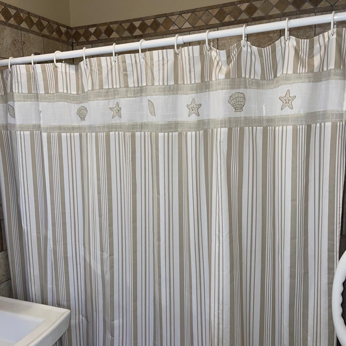 Lot includes a beach themed tan and white shower curtain and a matching tan toothbrush holder and soap holder with gold accents. The shower curtain has some water stains but most likely just needs a wash. Shower hooks included.