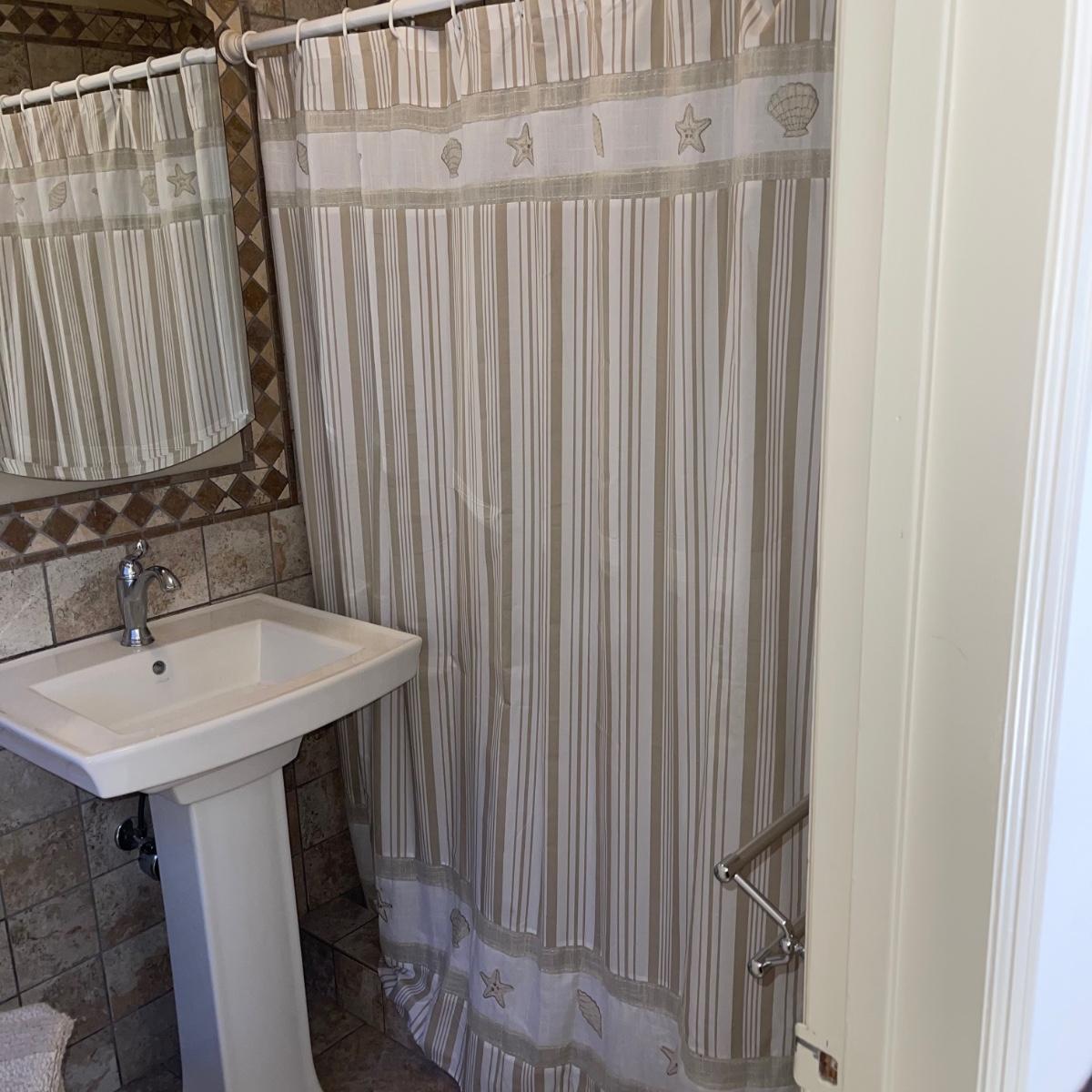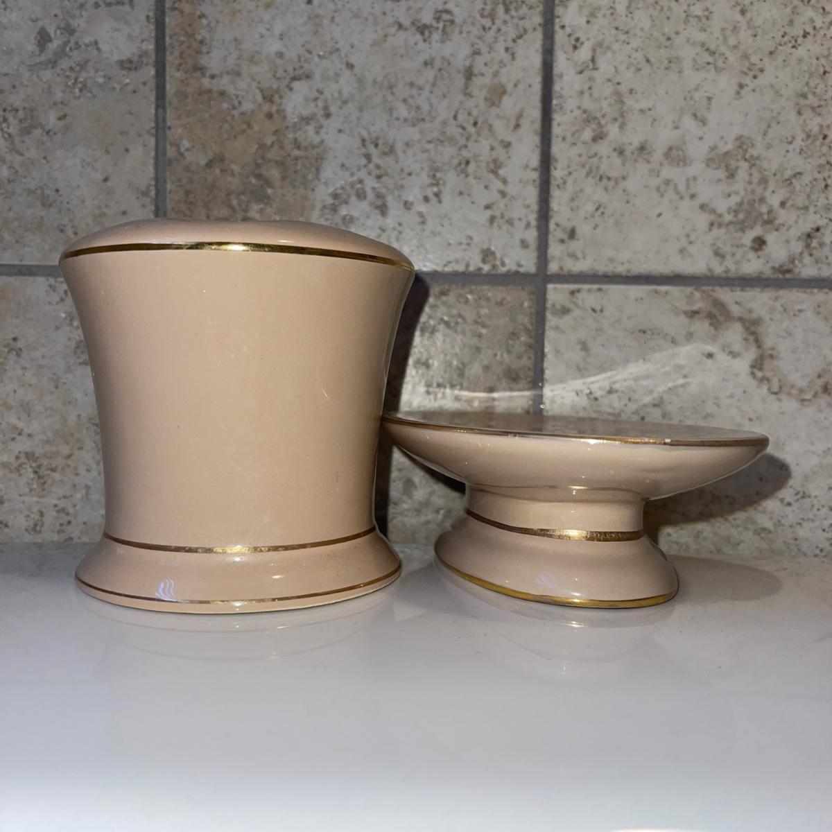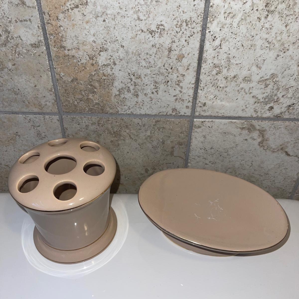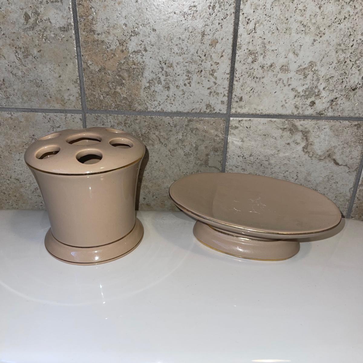 Lot includes a beach themed tan and white shower curtain and a matching tan toothbrush holder and soap holder with gold accents. The shower curtain has some water stains but most likely just needs a wash. Shower hooks included.