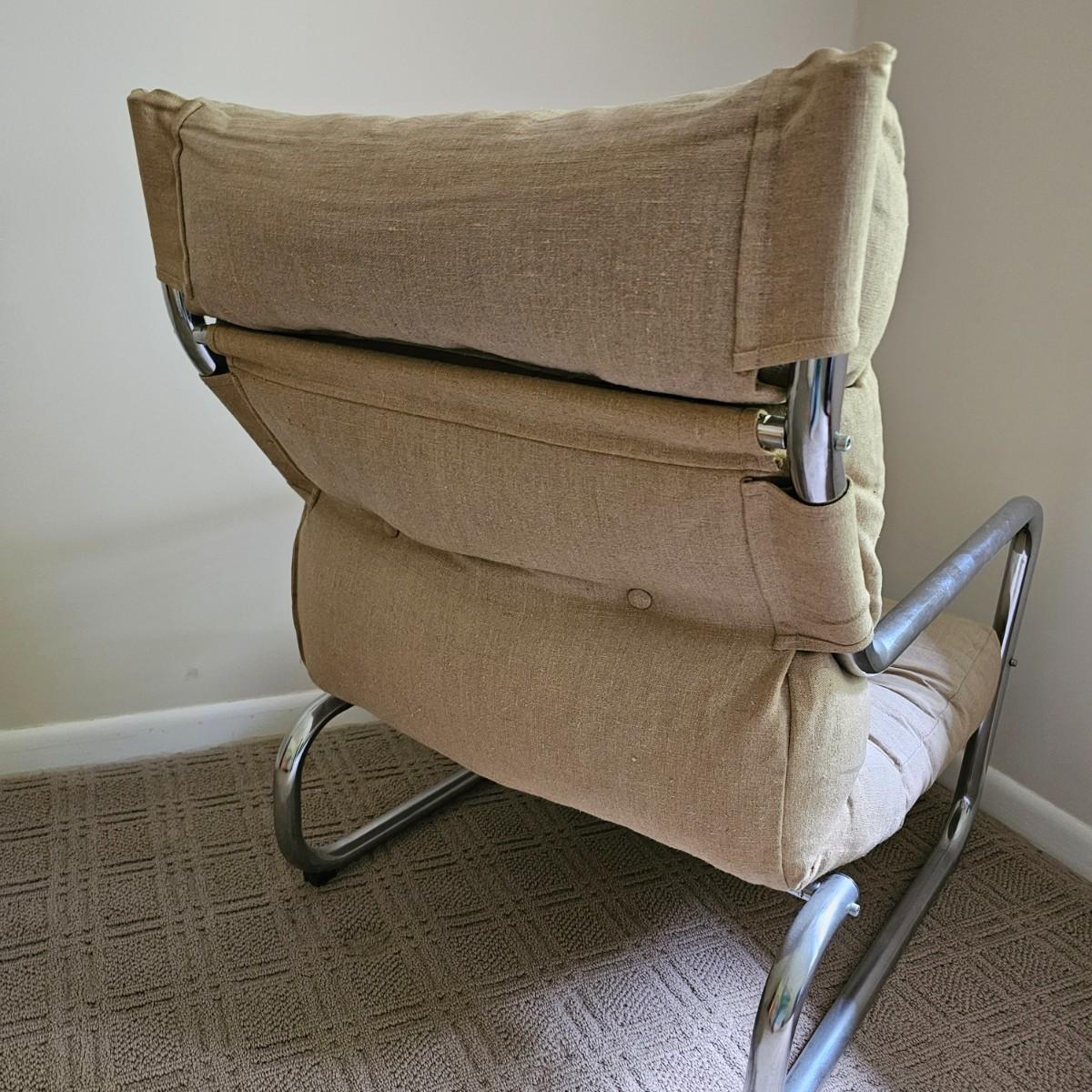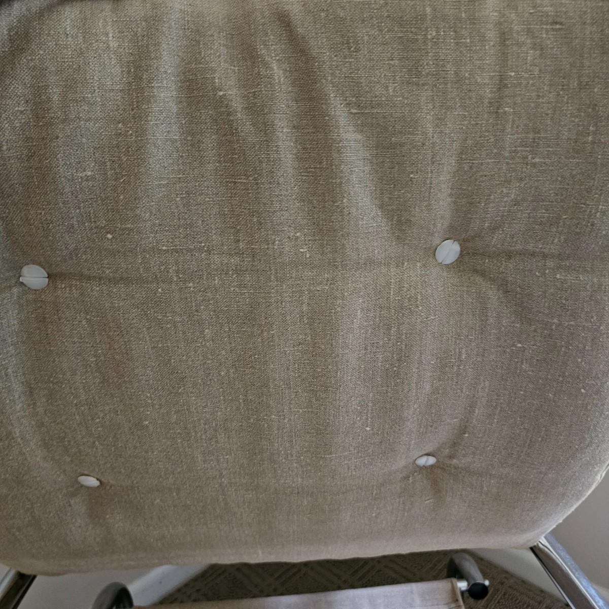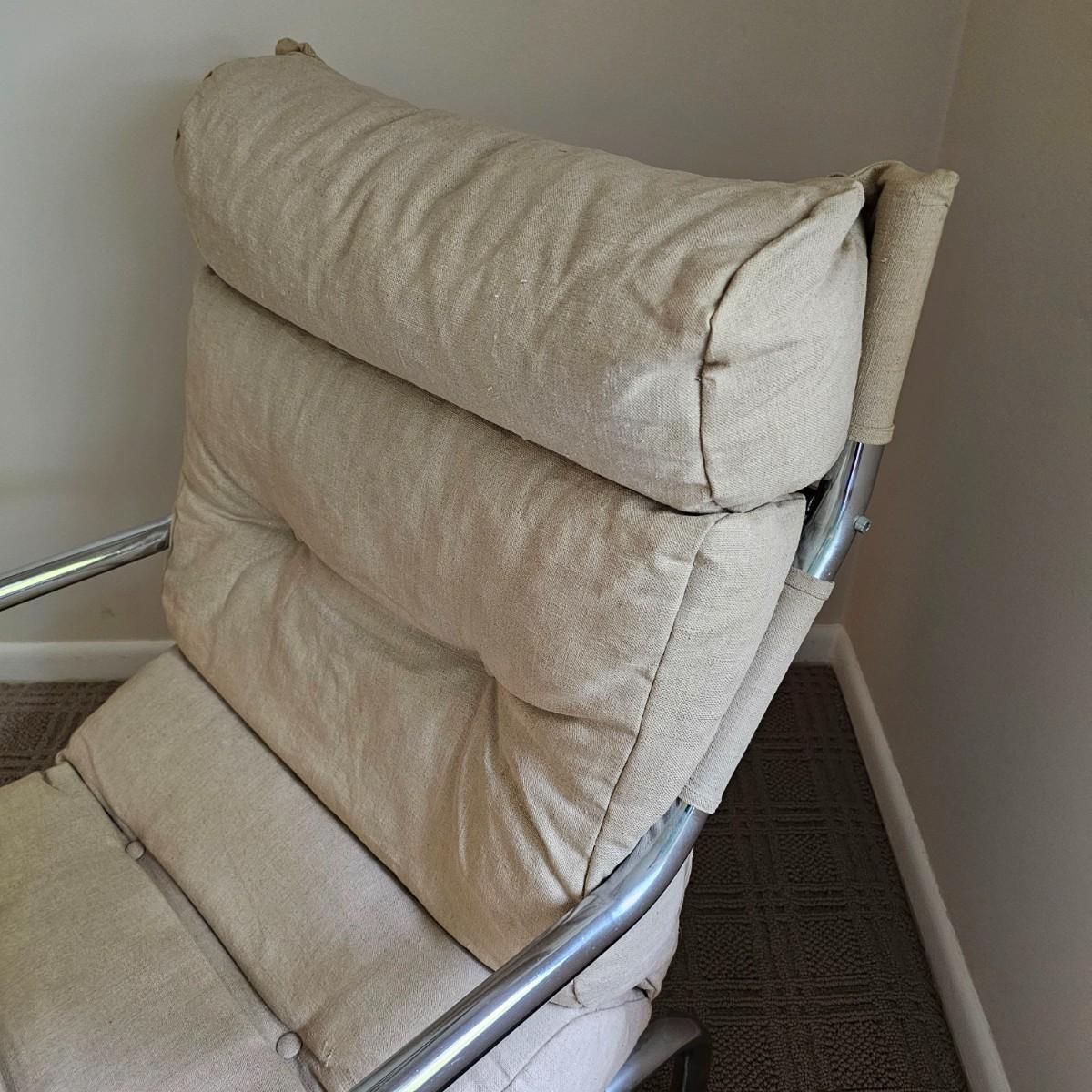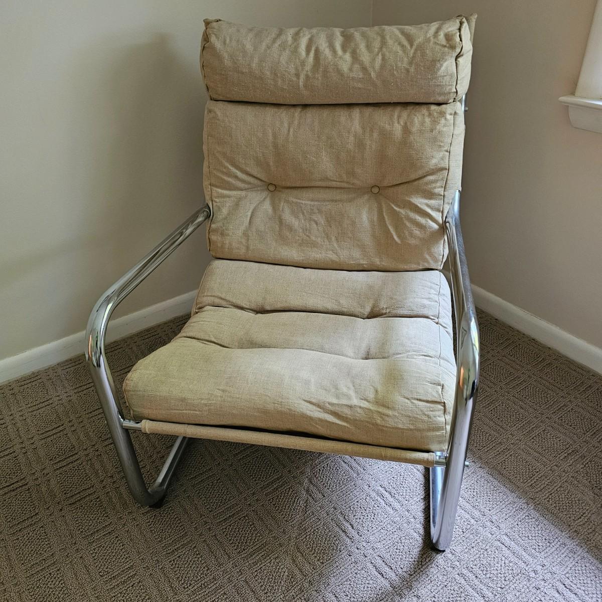 One tan canvas sling style chair with silver metal frame. Button tufting and cushioned this chair measures 26" x 31" x 34"H, has a seat height of 14". Some small spots on chair cover, see photos for details. Local pickup only.