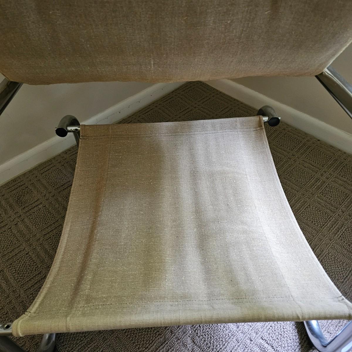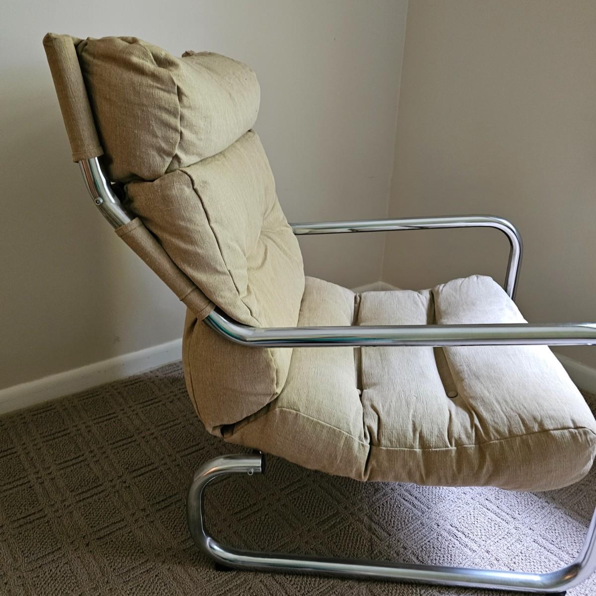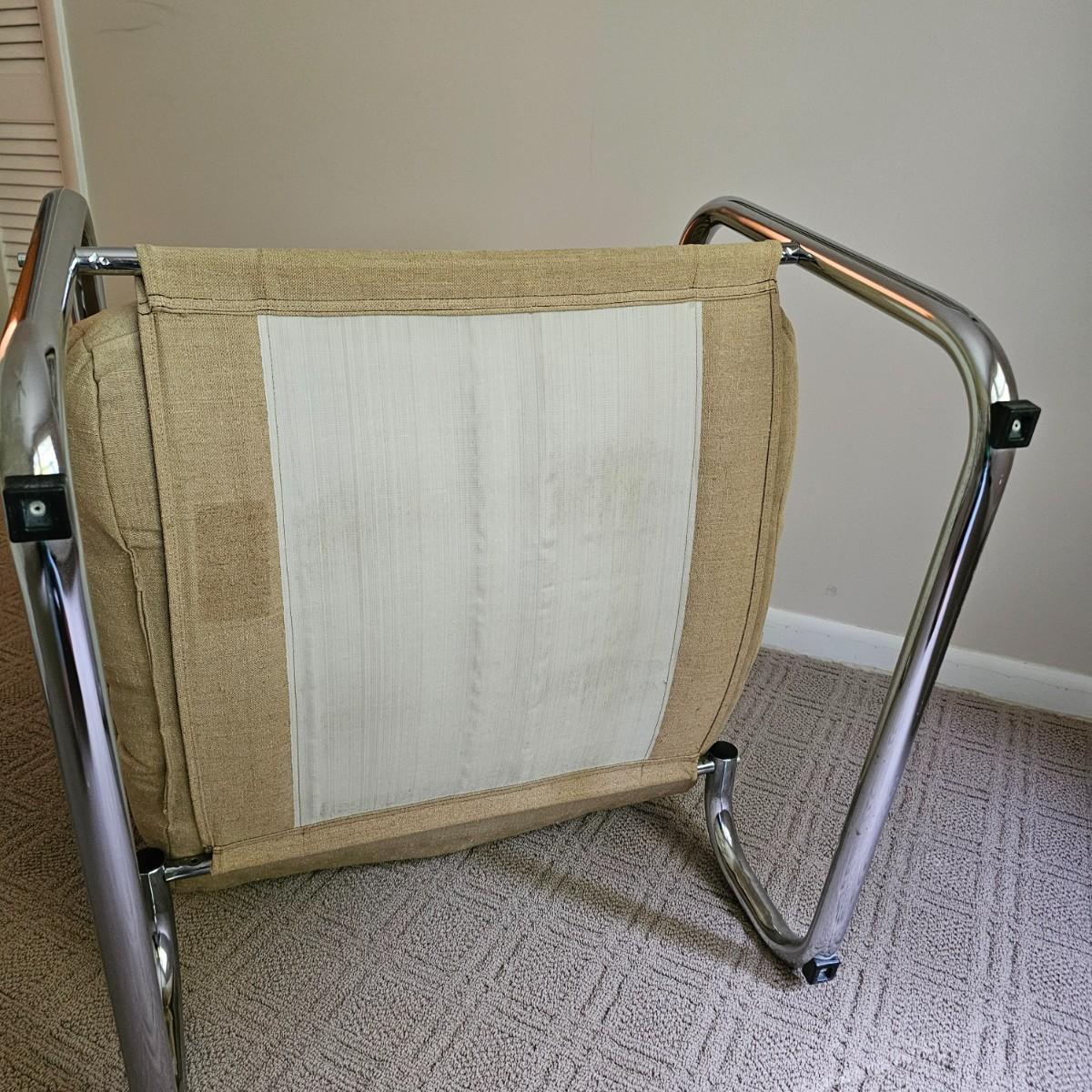 One tan canvas sling style chair with silver metal frame. Button tufting and cushioned this chair measures 26" x 31" x 34"H, has a seat height of 14". Some small spots on chair cover, see photos for details. Local pickup only.
